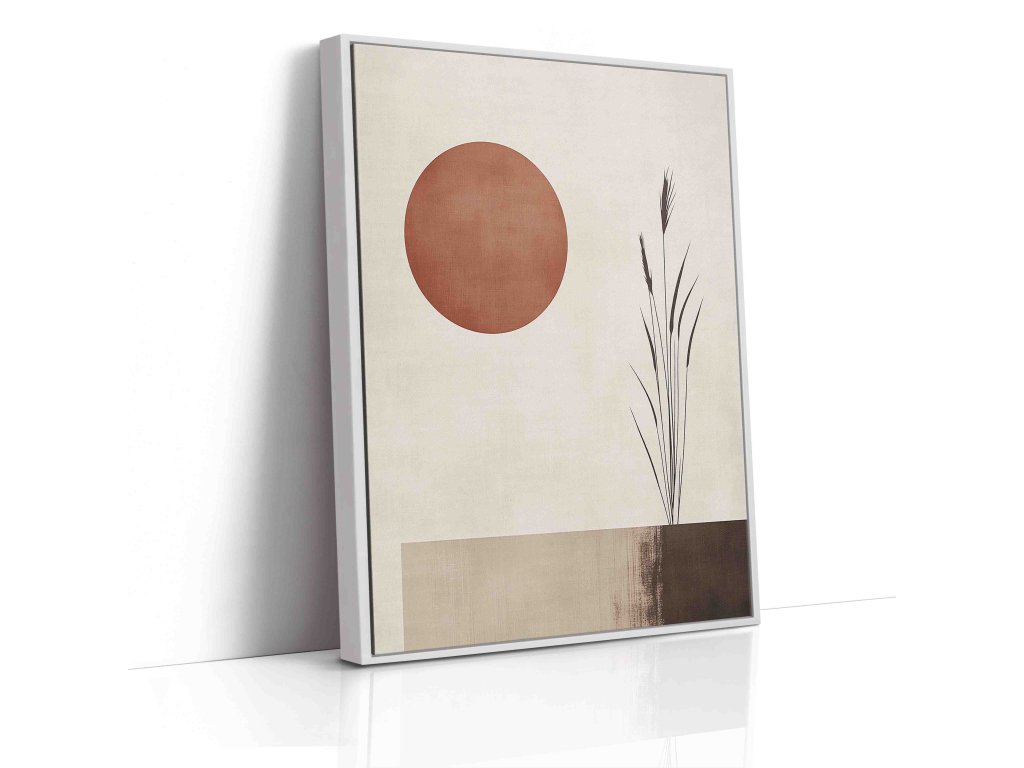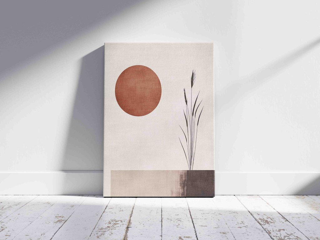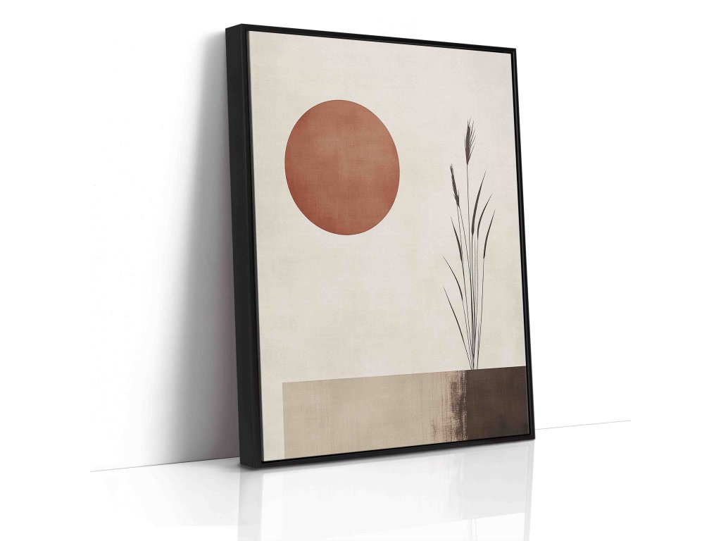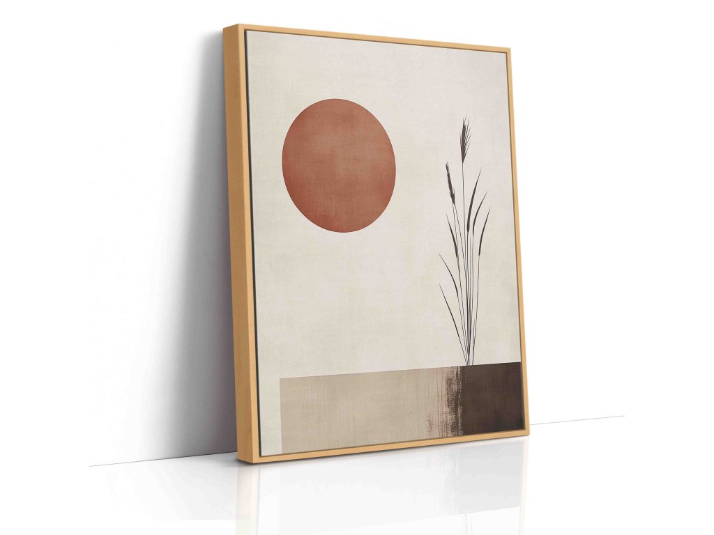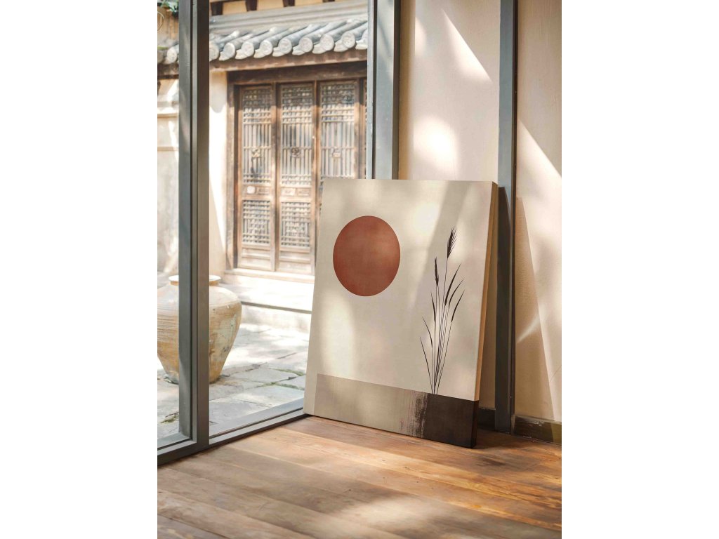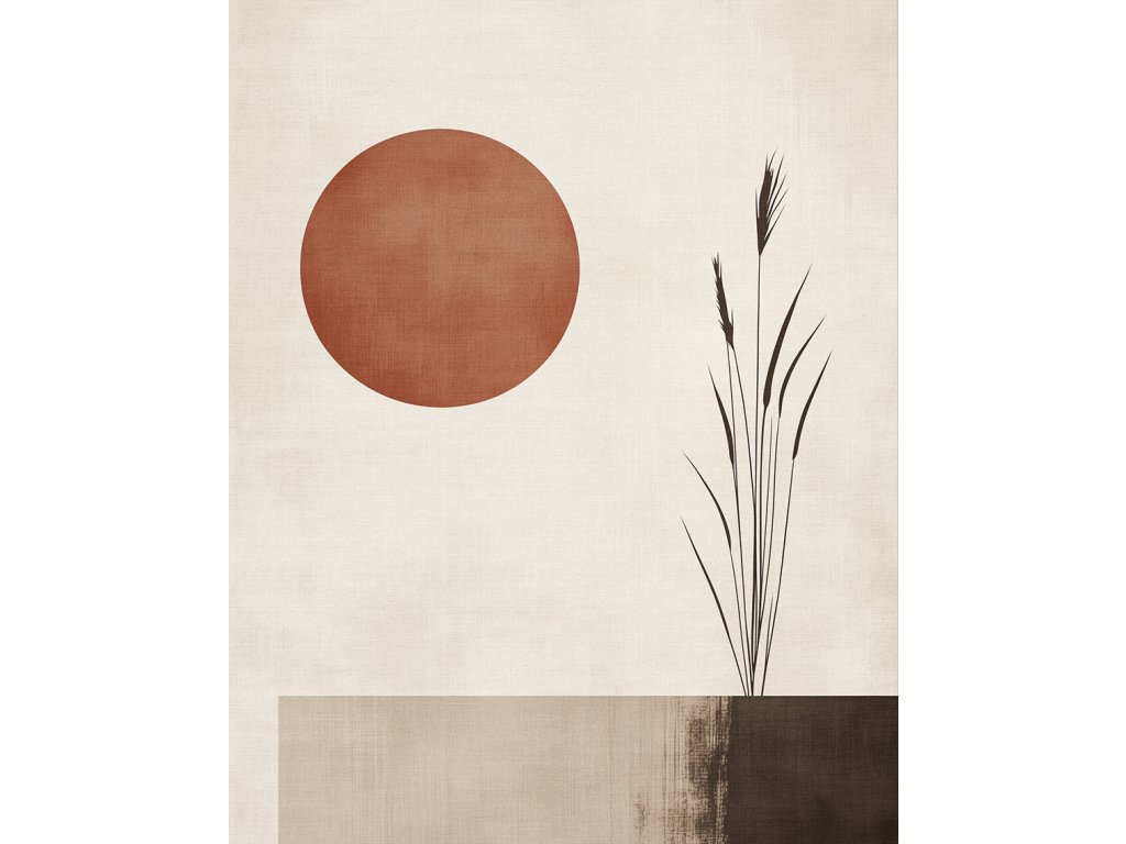 Poetický obraz "Rákos u jezera v západu slunce" zachycuje přírodní moment prostřednictvím minimalistické abstrakce. Vertikální linie rákosu kontrastují s klidnou hladinou jezera, zatímco geometricky zjednodušený západ slunce vytváří teplou, meditativní atmosféru. Harmonická souhra barev a tvarů evokuje klidný podvečer. Tento obraz na kvalitním plátně přináší do prostoru klidnou eleganci.