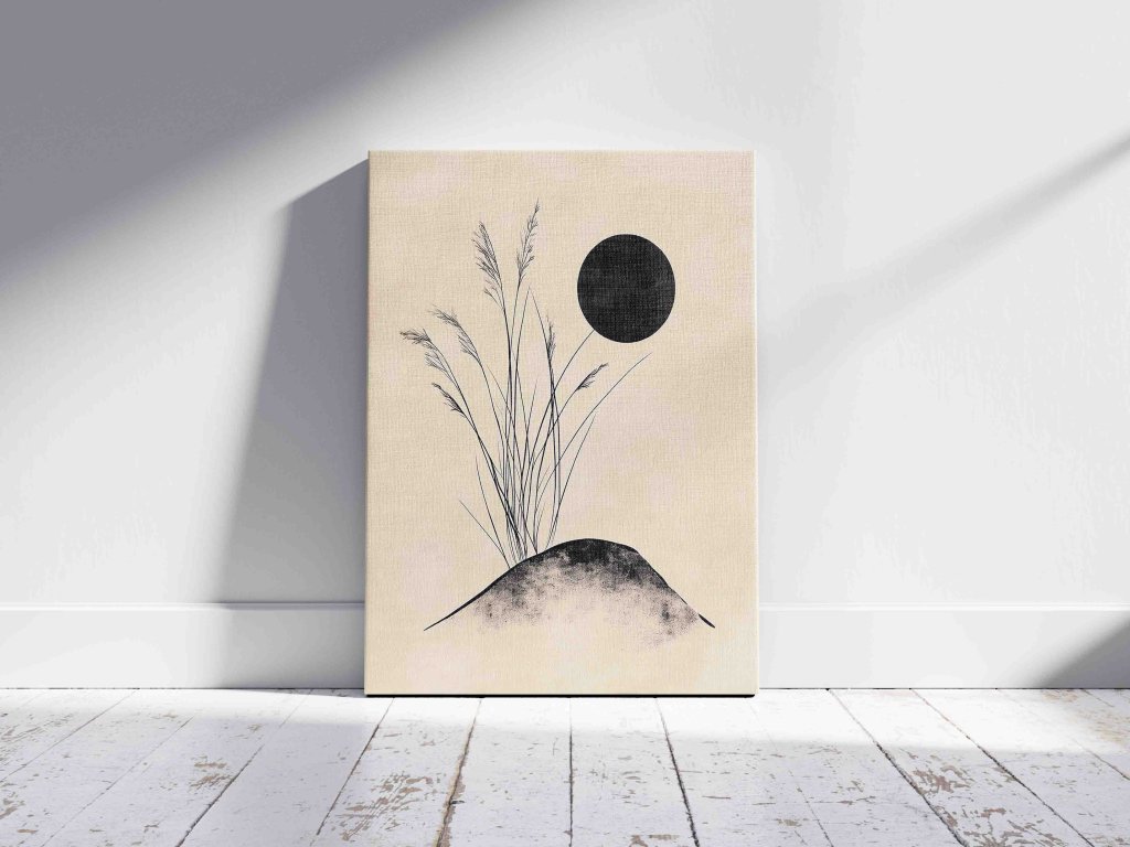 Poetický obraz "Tráva na kopečku v noci" zachycuje klidnou noční scenérii prostřednictvím minimalistické geometrické abstrakce. Jemné vertikální linie trávy se elegantně tyčí na oblém kopečku, zatímco tmavé pozadí evokuje ticho noci. Redukce krajiny na základní geometrické prvky zdůrazňuje esenci přírodního výjevu. Obraz vyniká svou klidnou atmosférou a čistými liniemi, přinášejícími harmonii.