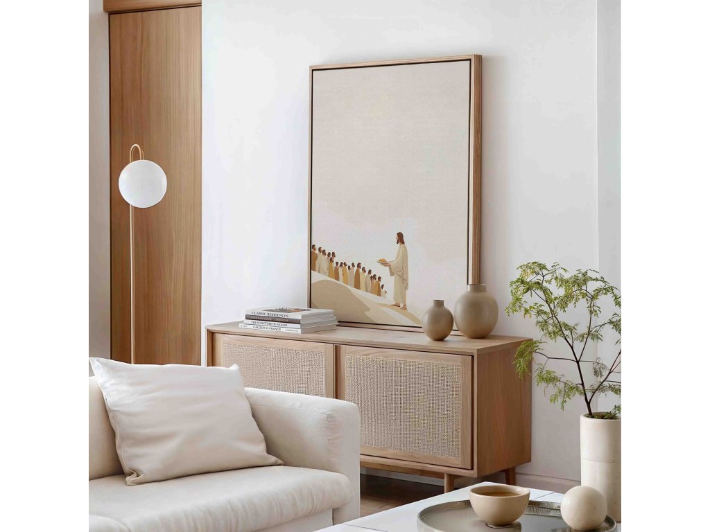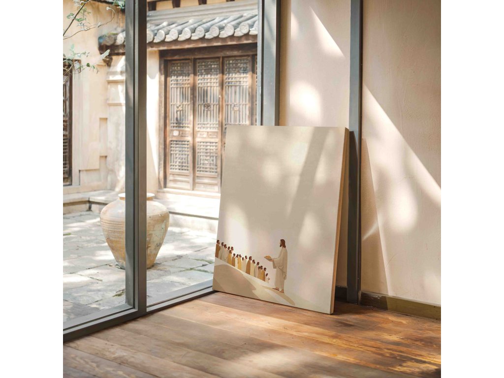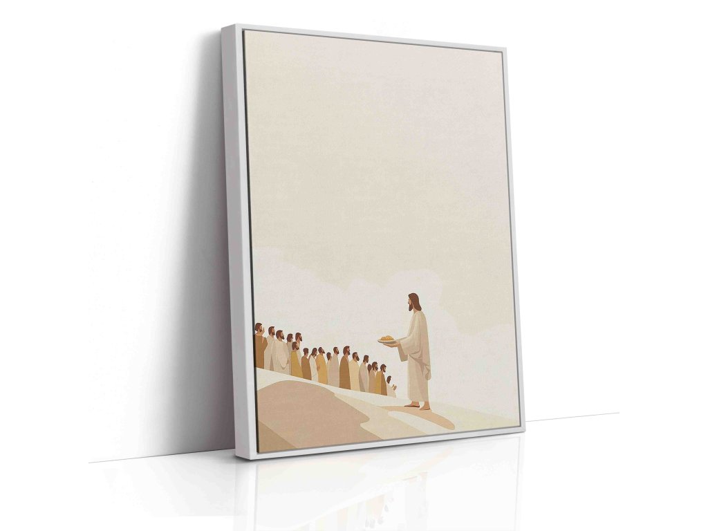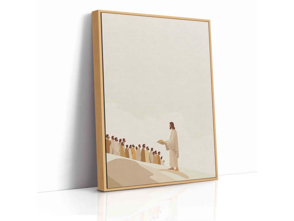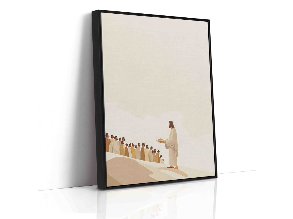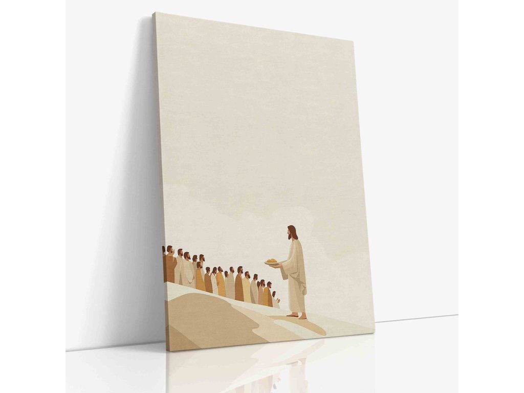 Dojemný obraz "Ježíš Kristus krmí hladové" zachycuje slavný biblický zázrak rozmnožení chlebů a ryb. Umělecké dílo zobrazuje Spasitele, jak s laskavostí rozdává pokrm hladovějícím. Kompozice vyniká výraznou centrální postavou Krista obklopeného vděčnými lidmi. Symbolika Božího zabezpečení promlouvá ke každému divákovi. Kvalitní tisk na odolném plátně zachovává živé barvy. Perfektní připomínka Boží péče.