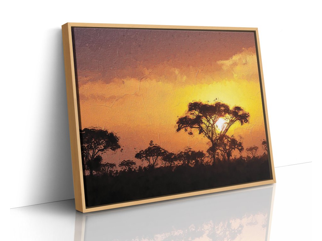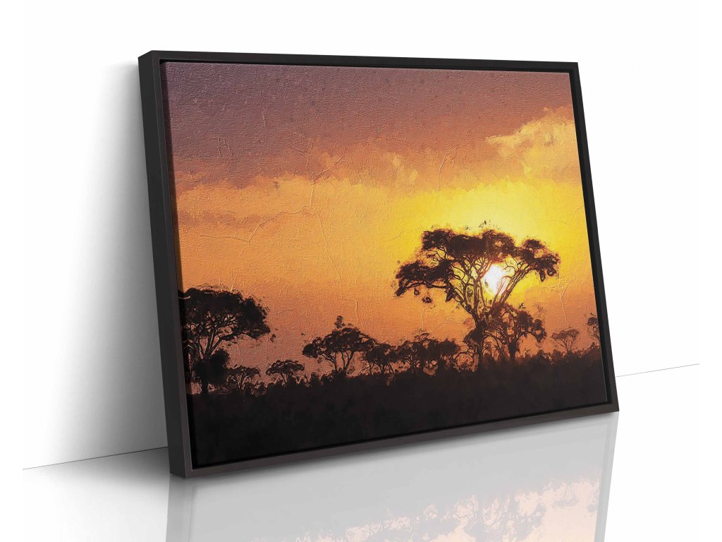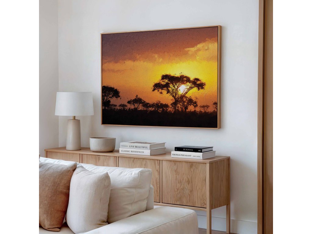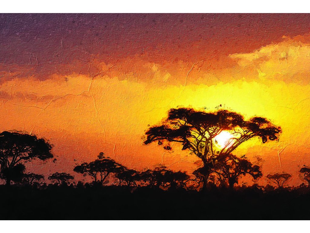 Síla a divokost probouzejícího se kontinentu. Obraz afrického východu slunce s typickou siluetou akácie na horizontu je symbolem tepla a exotiky. Sytě oranžové a žluté barvy savany dodají interiéru energii a etnický nádech. Skvělý doplněk pro milovníky Afriky, safari a teplých barevných tónů, který oživí stěny.