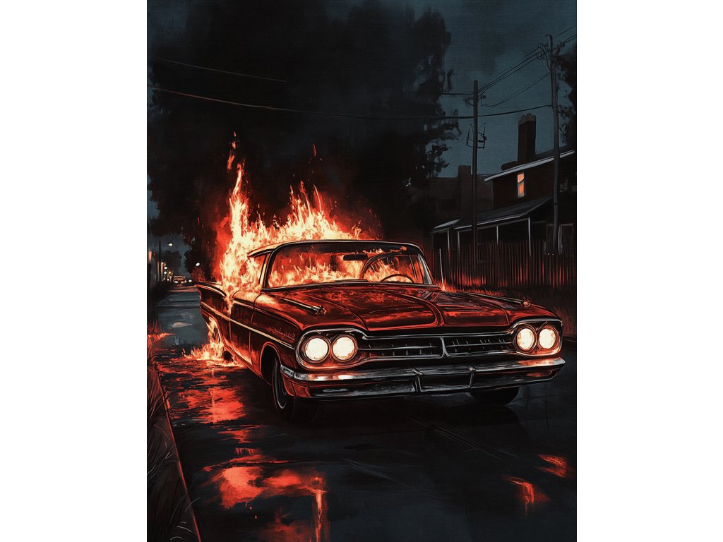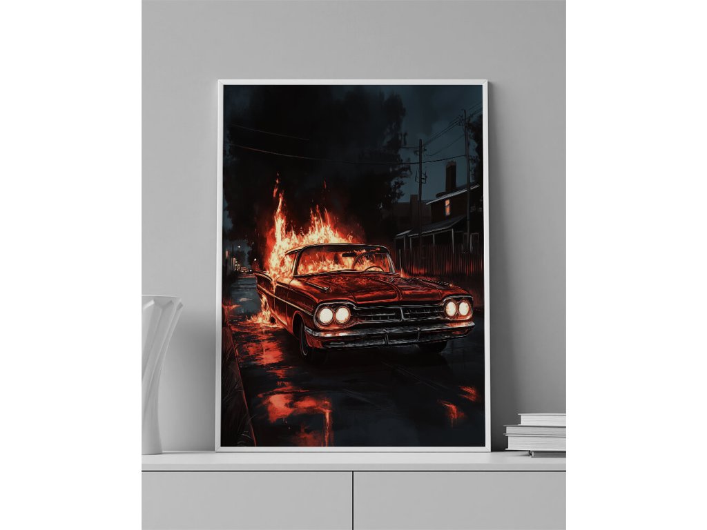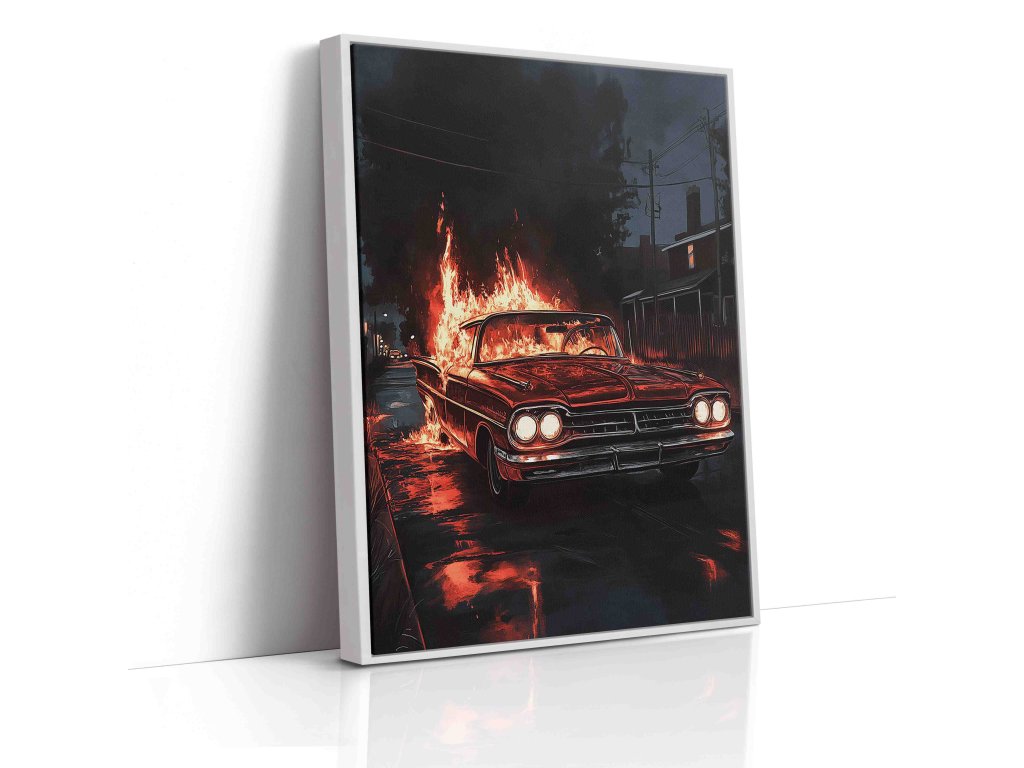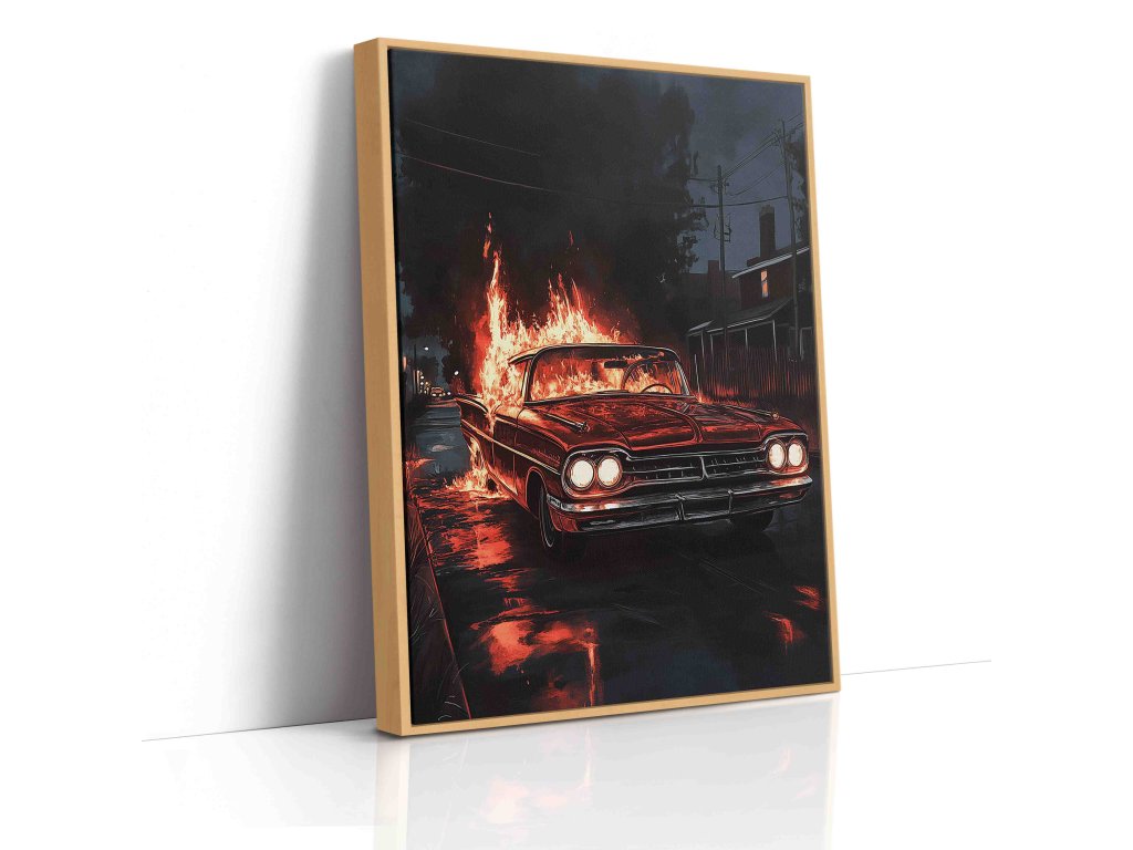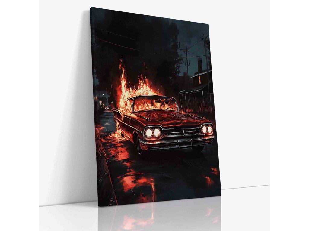 Ikonický americký vůz v dramatickém podání s ohnivými efekty. Tento obraz symbolizuje rychlost a nekompromisní výkon. Umělecké zpracování plamenů dodává scéně hloubku a dynamiku. Tištěno na prémiové plátno s dlouhou životností barev.