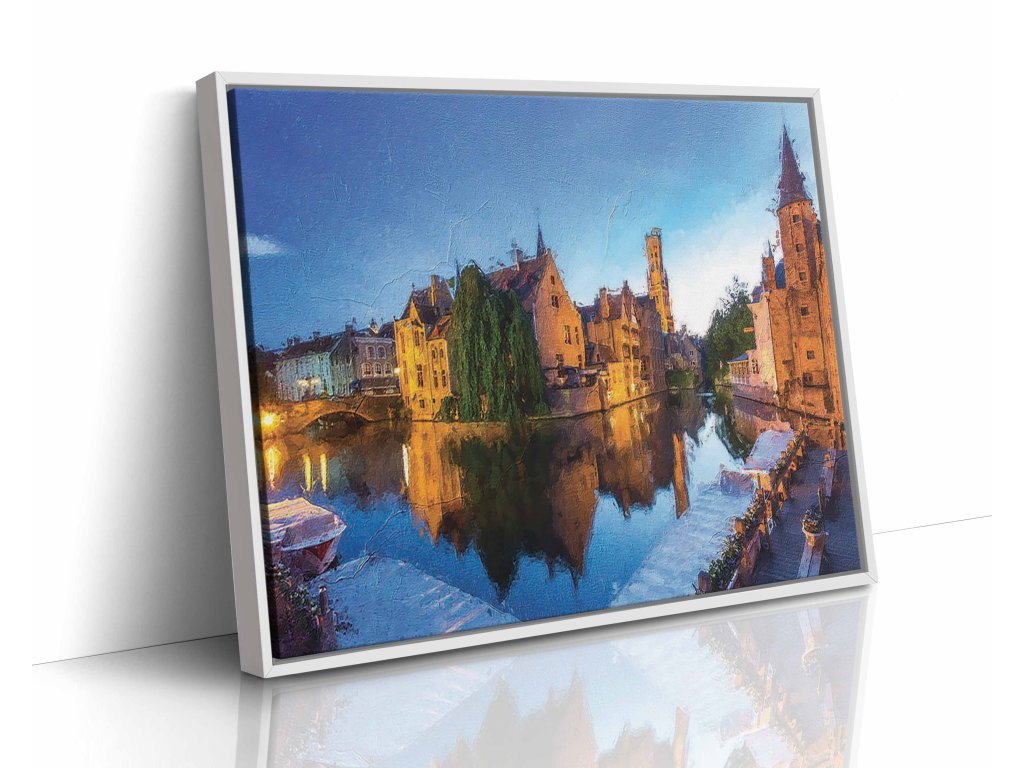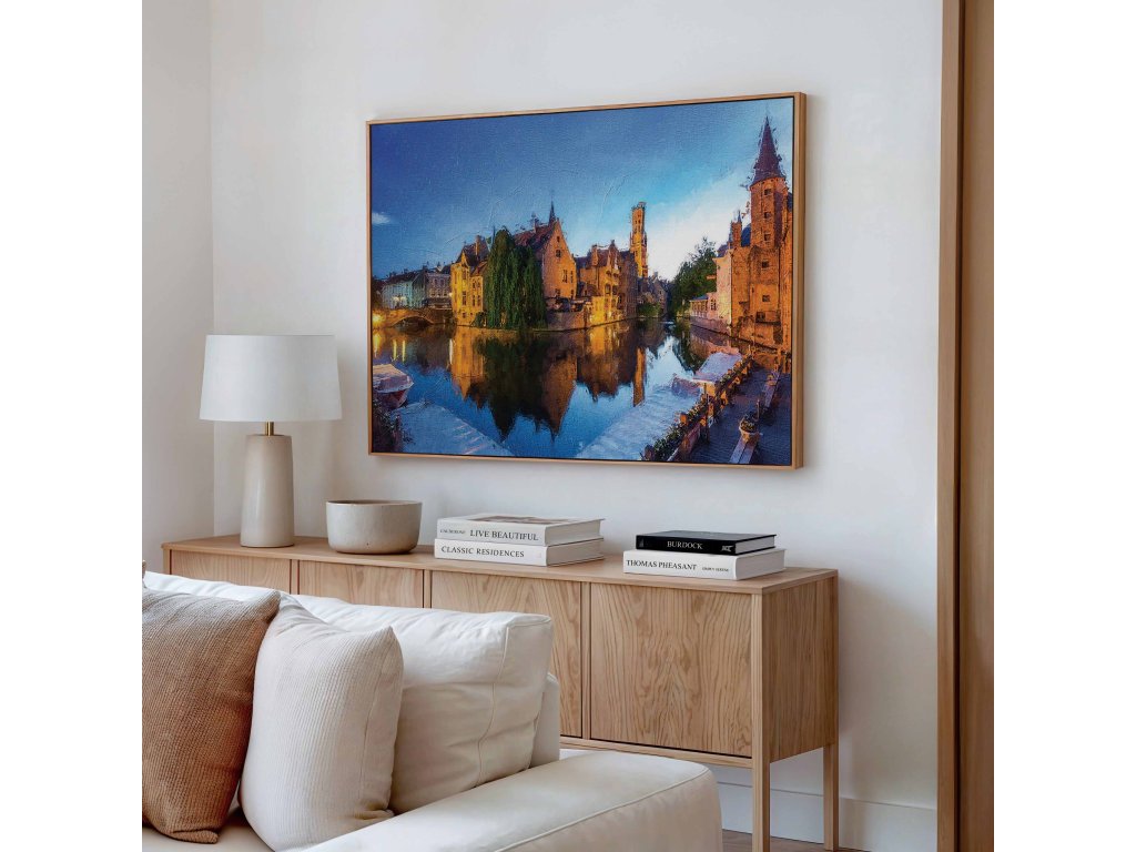 Symbióza města a řeky. Obraz zobrazuje moderní skyline nebo historické budovy zrcadlící se ve vodní hladině. Noční osvětlení nebo denní jas dodávají městu na plátně život. Tento motiv je univerzální a hodí se do obývacích pokojů i zasedacích místností, kde působí reprezentativně a dodává prostoru hloubku.