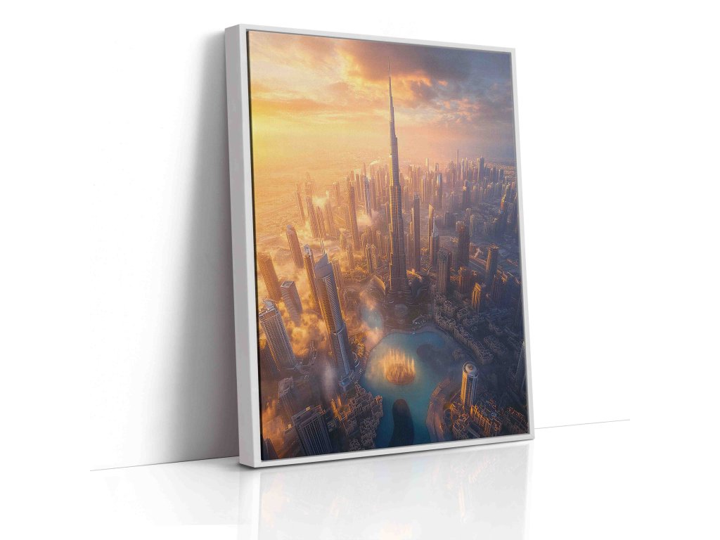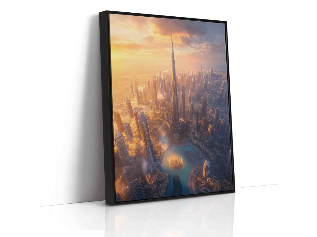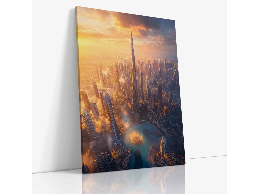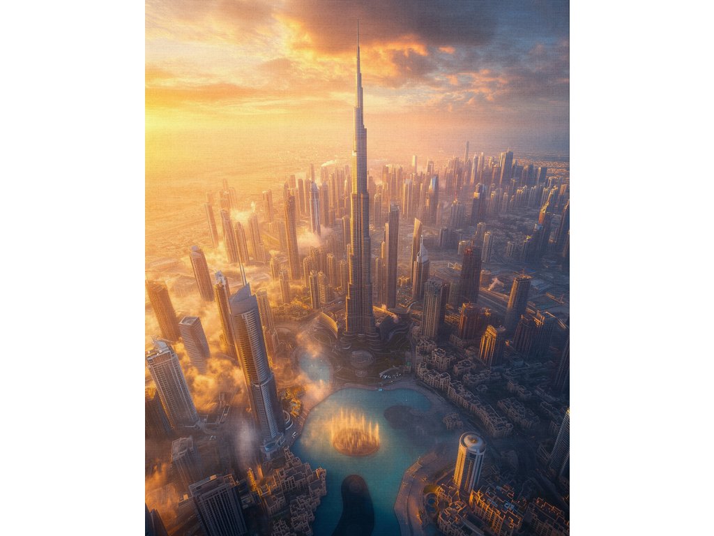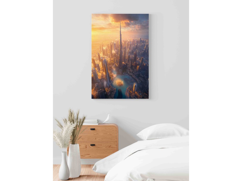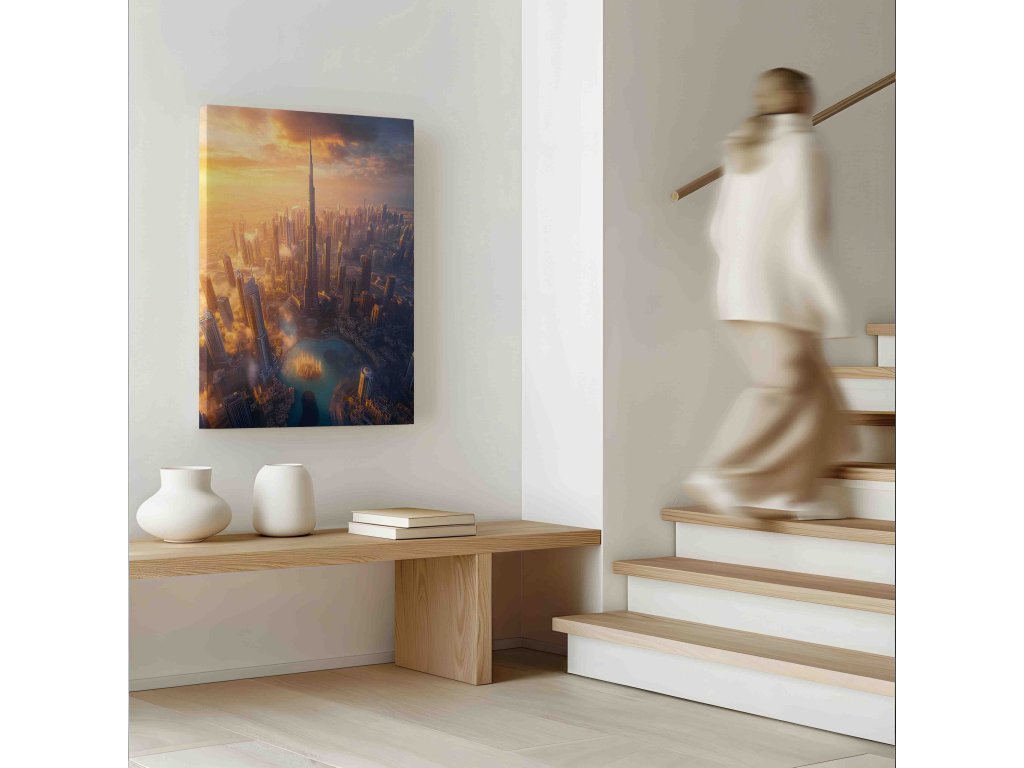 Pohled na nejvyšší budovu světa, Burdž Chalífu, v záři vycházejícího slunce. Tento futuristický obraz zachycuje moderní tvář Dubaje, kde se mrakodrapy tyčí nad pouštním oparem do zlatavého nebe. Odlesky ranního světla na skleněné fasádě dodávají obrazu luxusní vzhled. Ideální dekorace pro milovníky moderní architektury, technologií a dynamického životního stylu velkoměst.