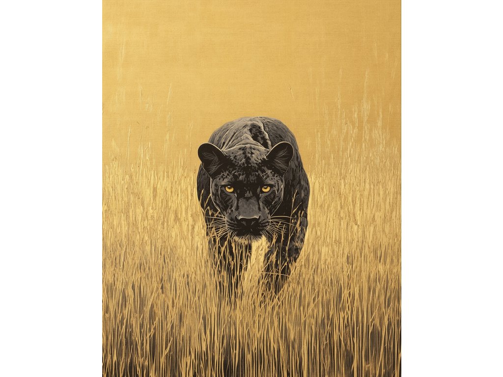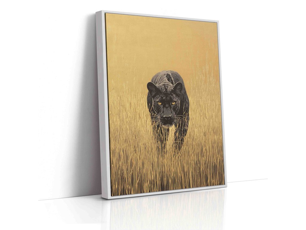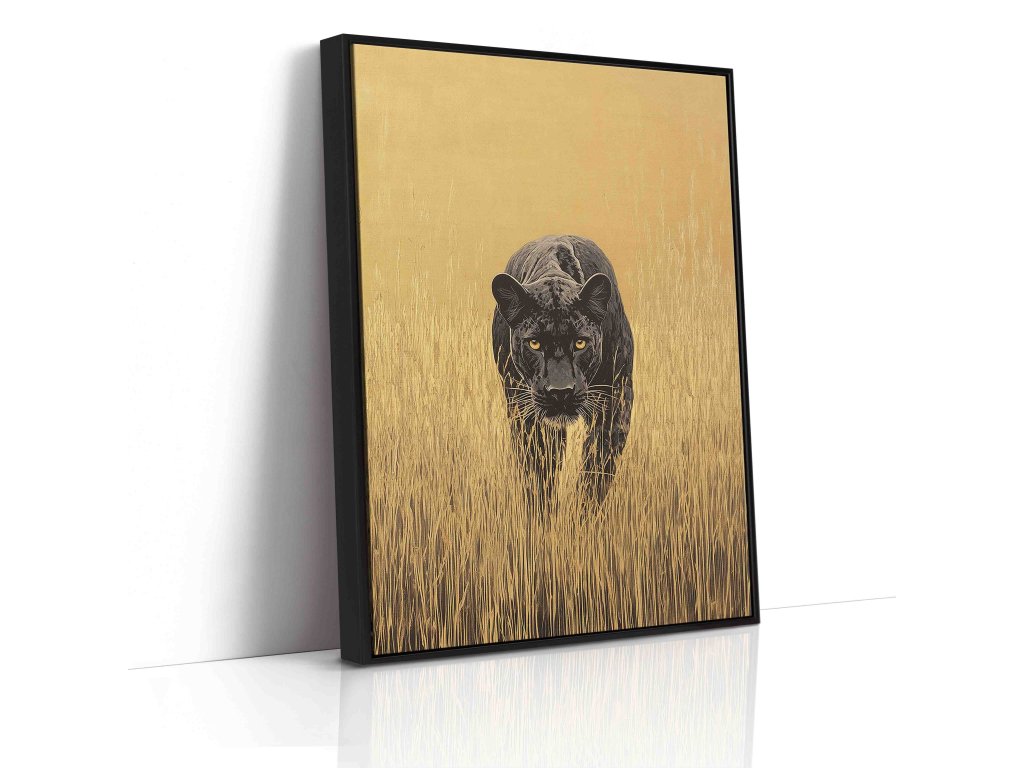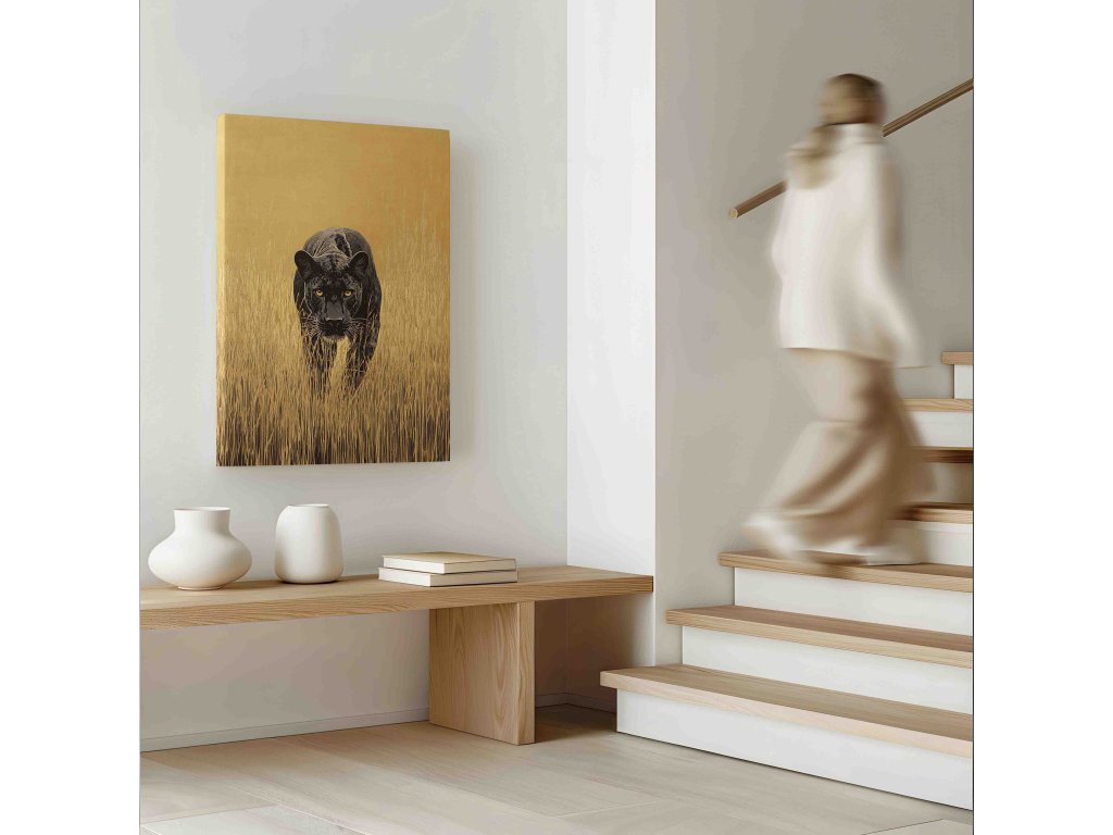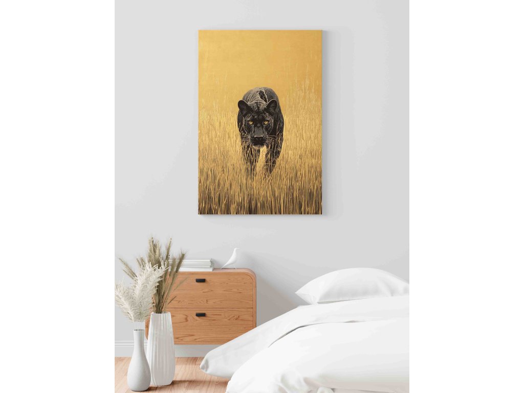 Dramatický kontrast dravé elegance. Obraz na plátně zobrazující siluetu černého pantera na pozadí žluté africké krajiny je vizuálně strhujícím dílem. Panter v chůzi symbolizuje sílu a ostražitost, zatímco žluté pozadí evokuje horké africké slunce. Tento obraz se skvěle hodí do moderních interiérů, které potřebují výrazný barevný a tematický akcent. Kvalitní plátno napnuté na rámu je připraveno okamžitě proměnit váš obývací pokoj v kousek divočiny.