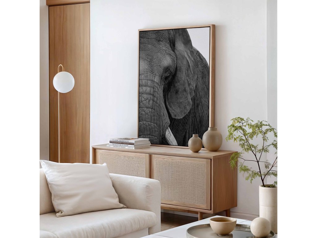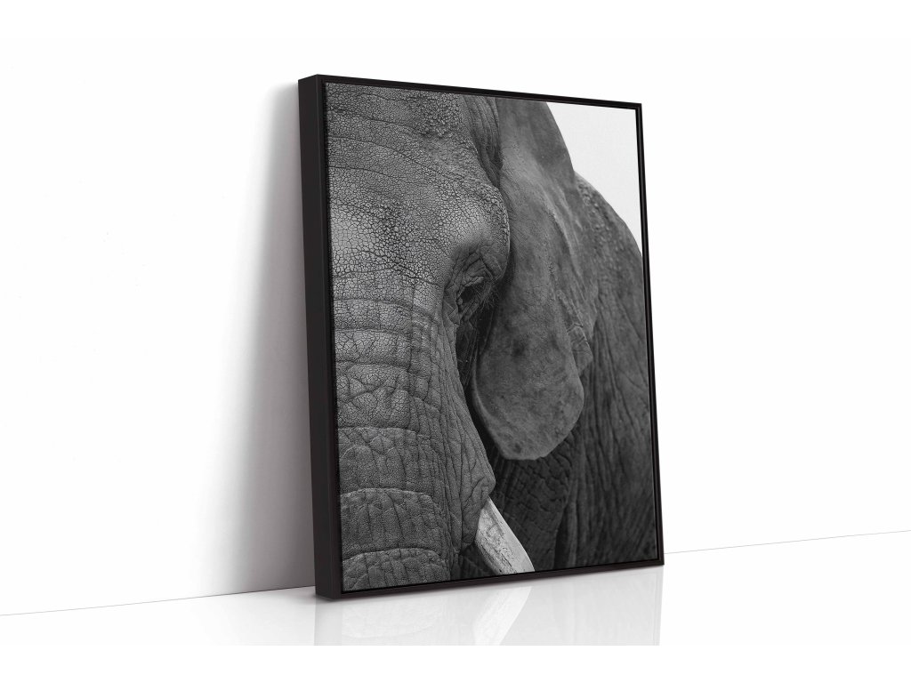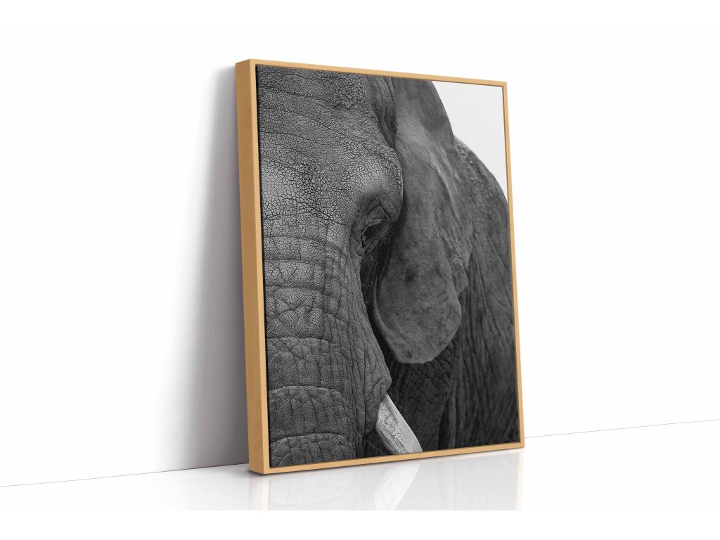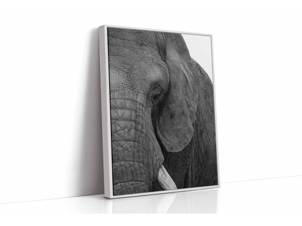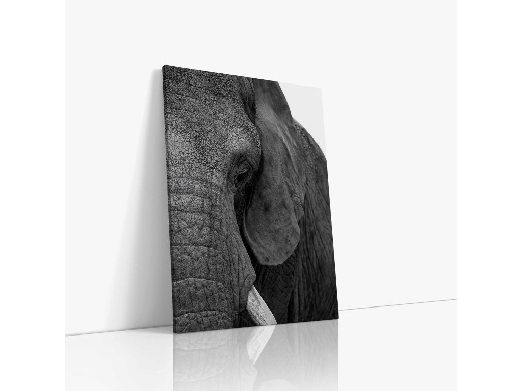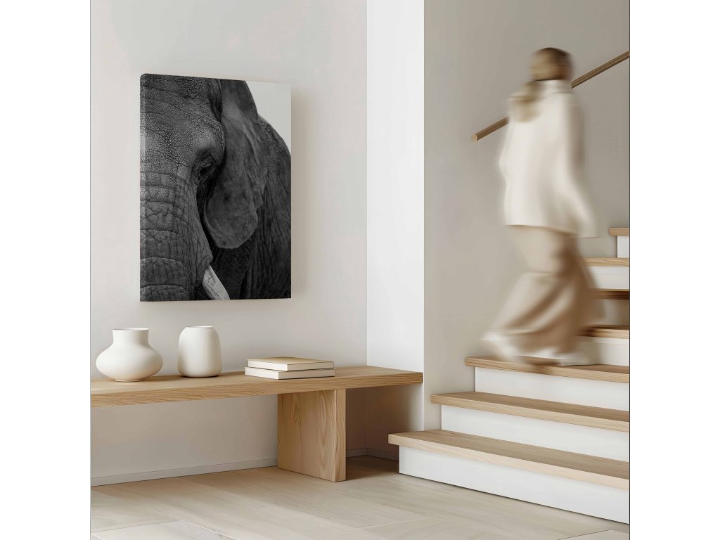 Fascinující detailní pohled na slona, který odhaluje neobyčejnou texturu jeho kůže, mohutné kly a oči plné moudrosti. Každá vráska je zachycena s mimořádnou ostrostí, což divákovi umožňuje prozkoumat krásu tohoto tvora z bezprostřední blízkosti. Tisk na prémiové plátno dokonale zvýrazňuje strukturu a hloubku obrazu. Ideální volba pro milovníky zvířat a detailní umělecké fotografie.