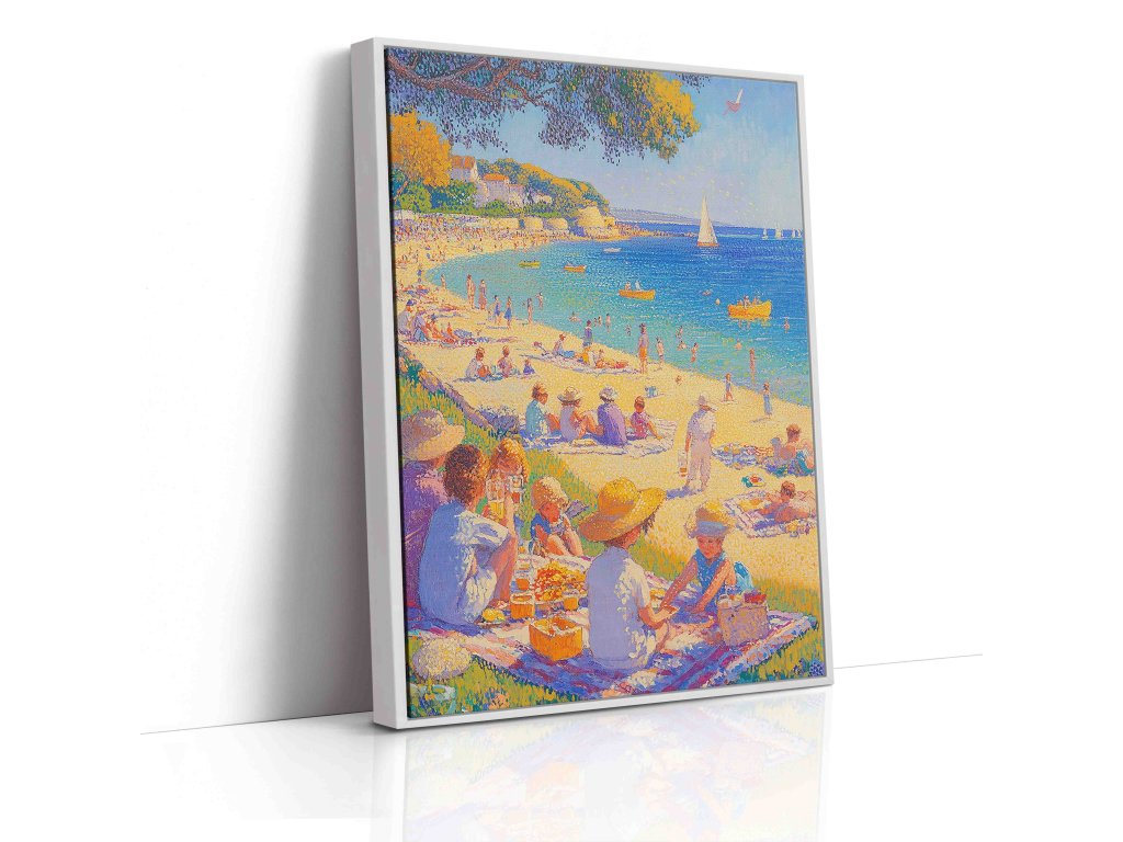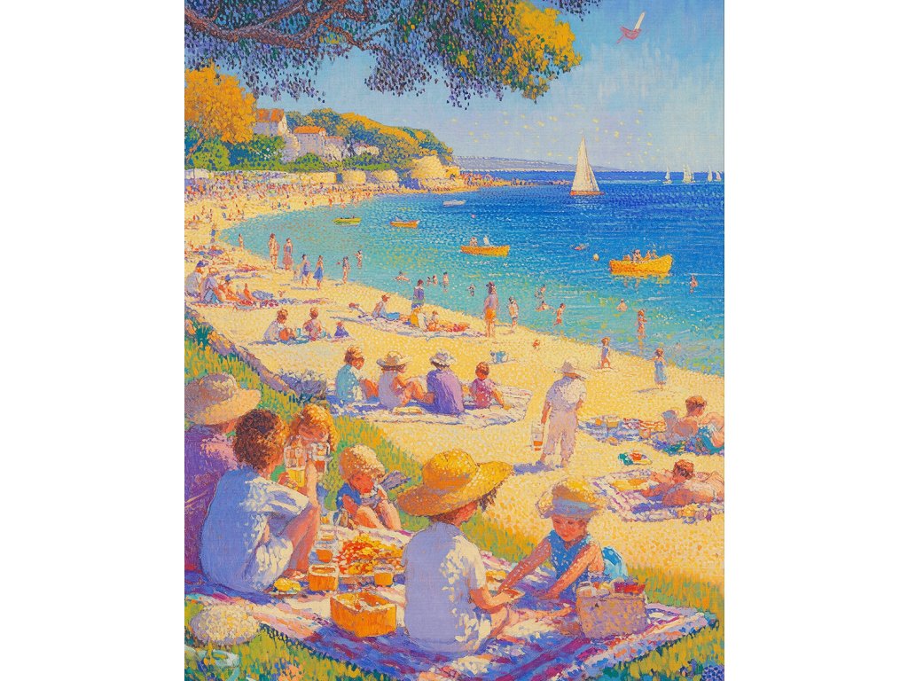 Živý pointilistický obraz zachycující idylickou atmosféru dovolené u azurového moře. Tisíce drobných barevných teček vytvářejí zářící pláž a křišťálově modrou vodu. Technika pointilismu dokonale vystihuje třpyt moře a radost z odpočinku. Tento obraz na kvalitním plátně přinese do vašeho interiéru pocit léta a pohody.