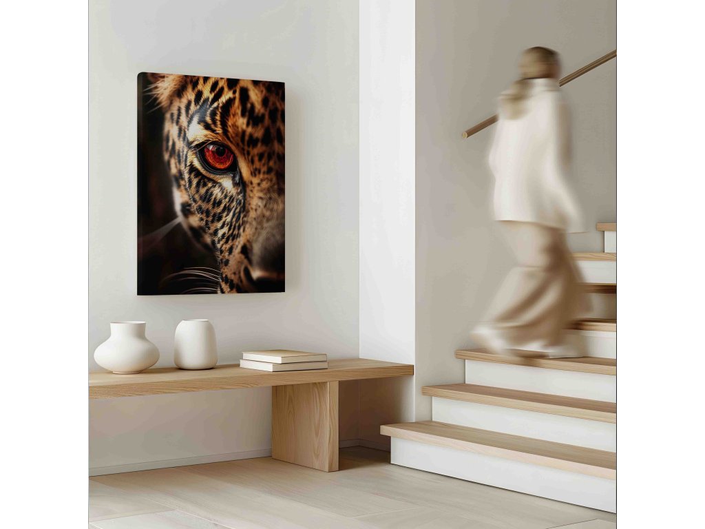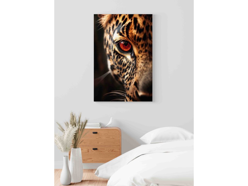 Zachyťte intenzitu predátora. Obraz na plátně s detailem oka jaguára je symbolem soustředění a síly. Charakteristické skvrny a pronikavý pohled šelmy vytvářejí dynamickou kompozici, která dodá interiéru energii. Zemité tóny a detailní textura kůže vypadají na plátně velmi luxusně. Skvělá volba pro ty, kteří hledají výrazný a přitom přírodní prvek do své pracovny nebo obývacího pokoje.