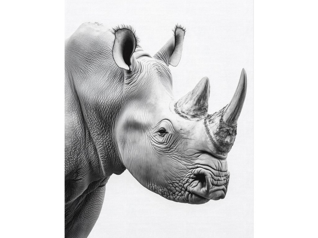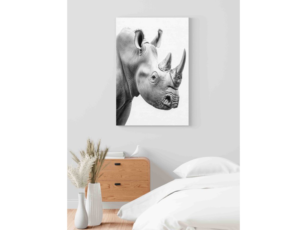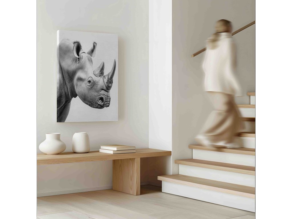 Symbol nezlomnosti a síly. Tento černobílý portrét hlavy nosorožce na plátně je syrovým a působivým uměleckým dílem. Detailní vyobrazení rohu a strukturované kůže vypadá v černobílém provedení velmi dramaticky a moderně. Skvěle se hodí do industriálních prostor, kanceláří nebo moderních obýváků. Kvalitní tisk na plátno zajišťuje, že obraz bude působit masivně a autenticky, přesně jako jeho předloha.