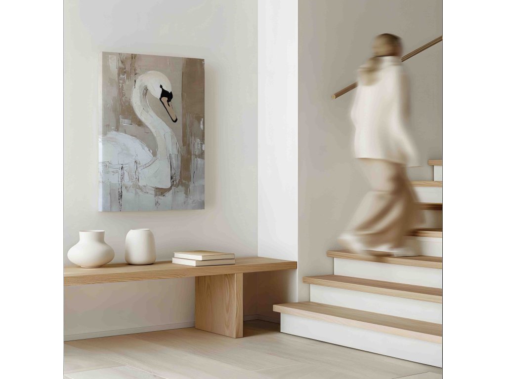 Krása a ladnost na vodní hladině. Obraz na plátně s motivem labutě ve stylu akrylové malby působí velmi jemně a sofistikovaně. Světlé tóny a umělecké tahy štětcem podtrhují eleganci tohoto ptáka a vytvářejí v interiéru atmosféru klidu a harmonie. Skvěle se hodí do ložnic, koupelen nebo relaxačních místností. Kvalitní plátno napnuté na dřevěném rámu zaručuje, že obraz bude vypadat jako z pravé umělecké galerie.