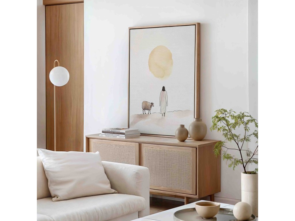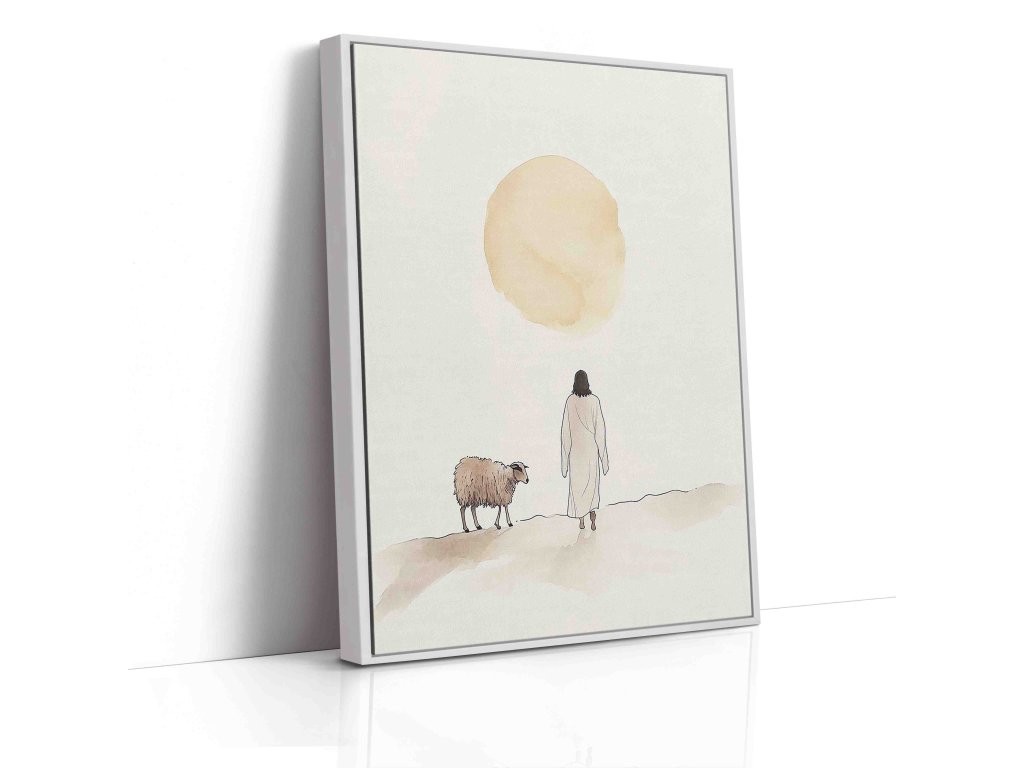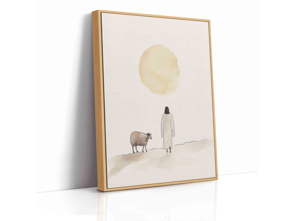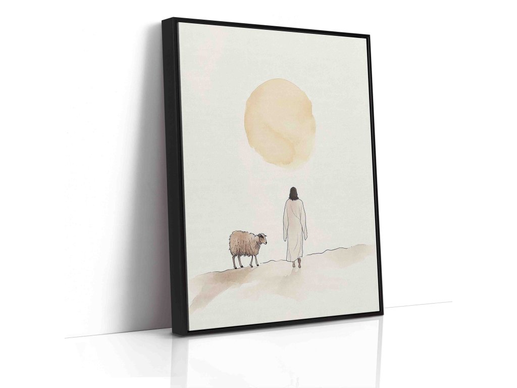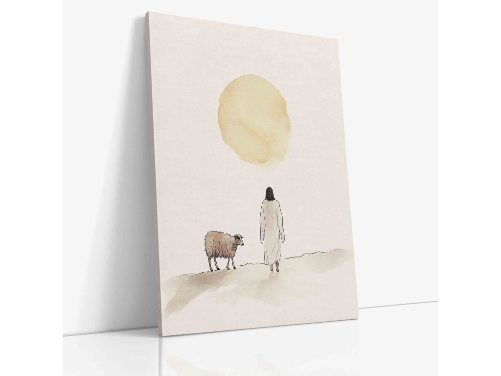 Dojemný obraz "Ježíš a jeho beránek" zachycuje něžný moment mezi Kristem a jehnětem – silný symbol jeho role dobrého pastýře. Toto umělecké dílo na plátně vyniká vřelou atmosférou a citlivým zpracováním. Kristova tvář vyzařuje lásku, zatímco beránek symbolizuje nevinnost. Kompozice evokuje biblické poselství o Božím vedení. Teplé tóny dodávají obrazu uklidňující atmosféru. Ideální pro dětské pokoje či jako dar ke křtu.