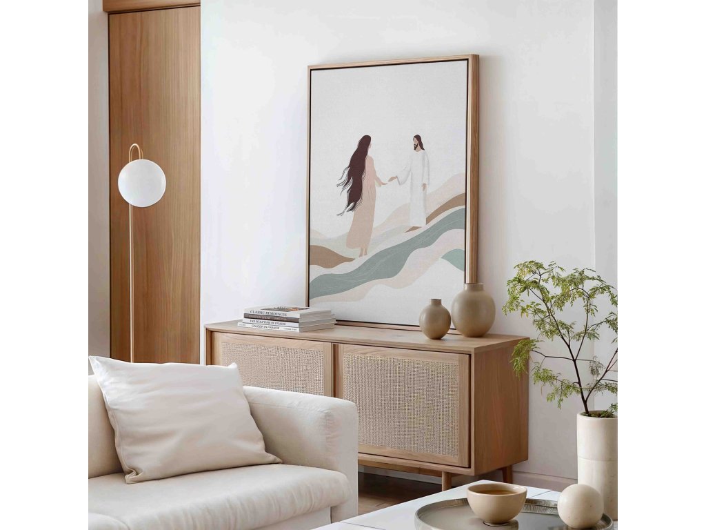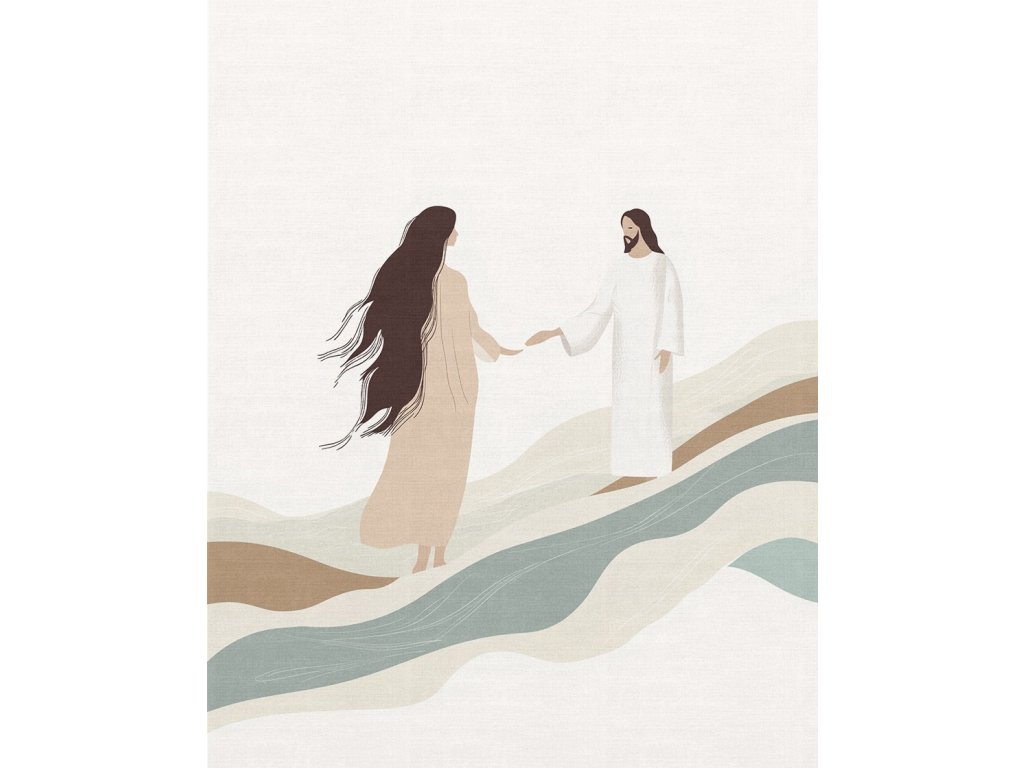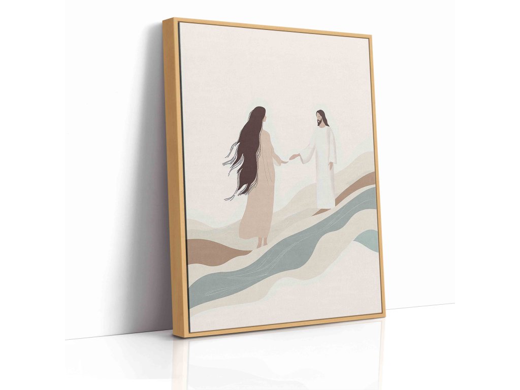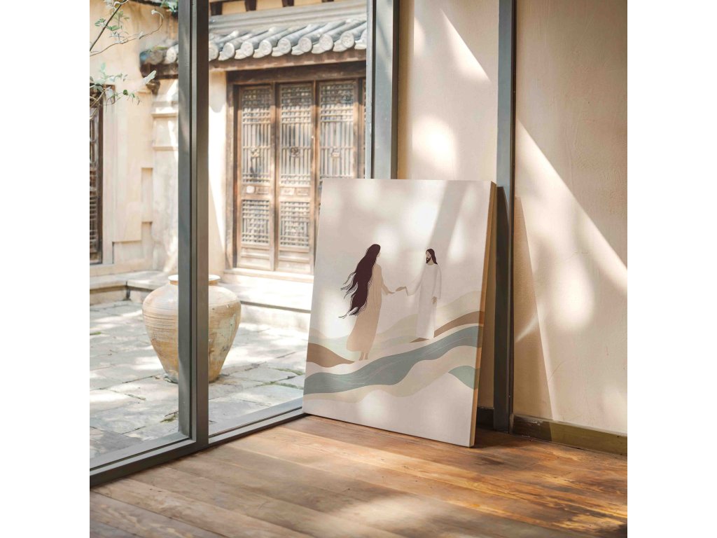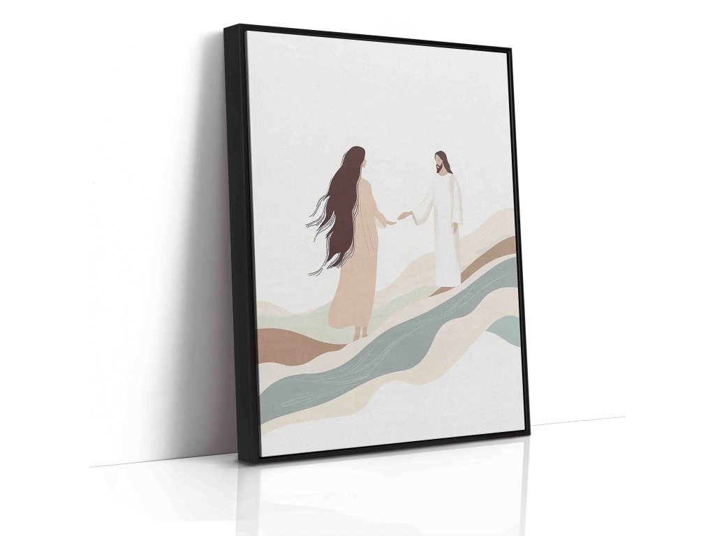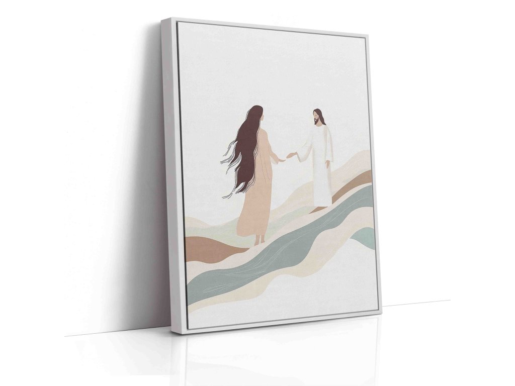 Hluboce lidský obraz "Ježíš mluví se ženou" zachycuje biblické setkání Krista se Samaritánkou u studny. Toto dílo na plátně vyniká citlivým zpracováním mezilidské interakce. Kristův laskavý a přijímající postoj k ženě symbolizuje jeho revoluční přístup. Precizní zpracování výrazů tváří umožňuje divákovi pocítit hloubku setkání. Obraz připomíná křesťanské hodnoty empatie a přijetí. Ideální pro společenské prostory.