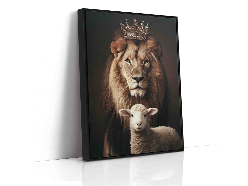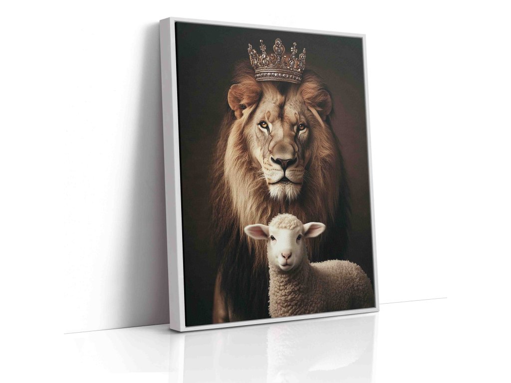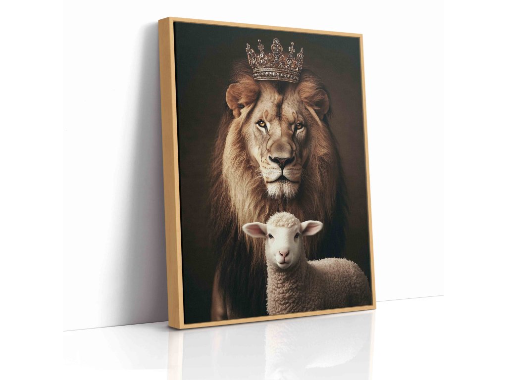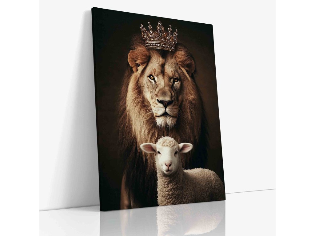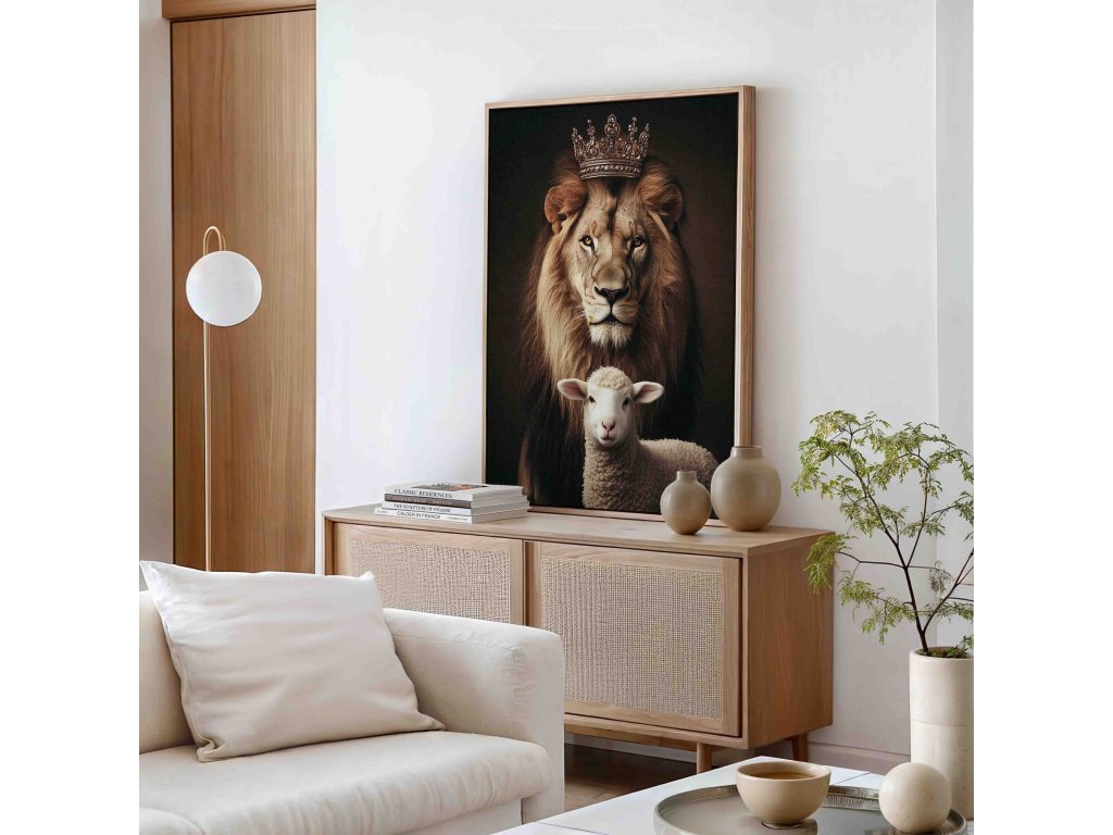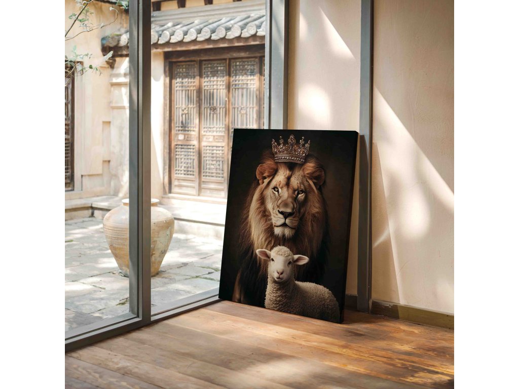 Dojemný obraz "Král s ovečkou" zachycuje hluboce emotivní kontrast mezi královskou majestátností a něžnou péčí. Toto umělecké dílo na plátně zobrazuje vznešeného panovníka držícího v náručí malou ovečku – mocný symbol Kristovy lásky k jednotlivci. Precizní detaily královského roucha kontrastují s jemným zpracováním zranitelného jehněte. Kompozice evokuje, že Bůh zná a miluje každého osobně.