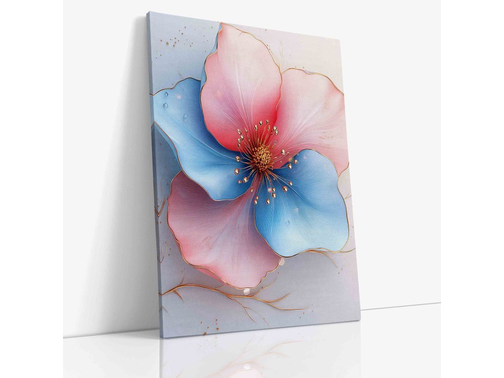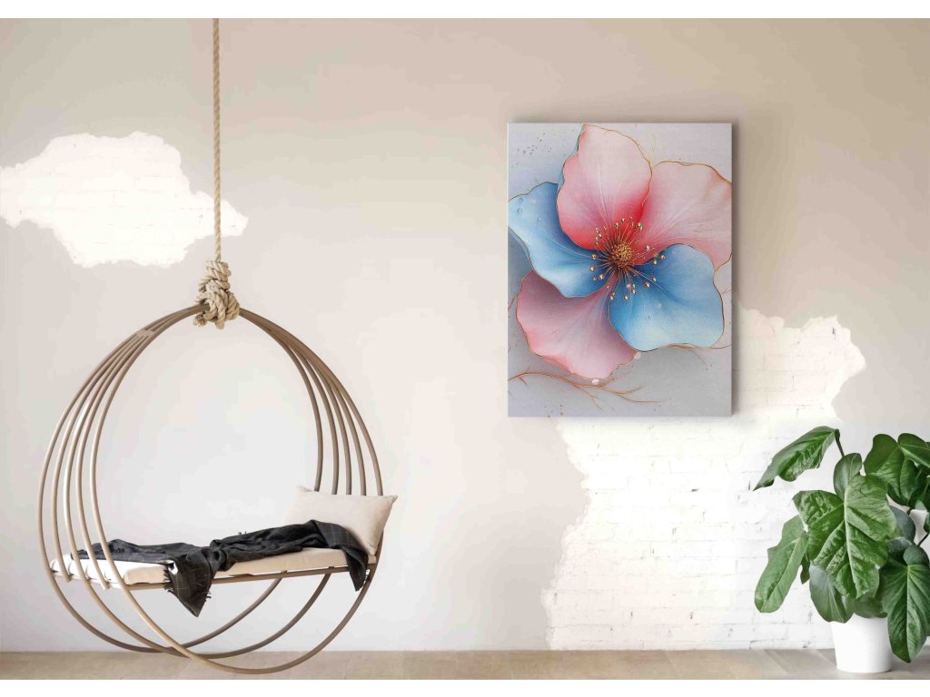 Fascinující umělecká kompozice květu s výraznými červenými a modrými listy, které elegantně kontrastují s luxusním mramorovým podkladem. Tento originální obraz na plátně kombinuje přírodní krásu s moderní estetikou. Vibrantní barevné spektrum vytváří dynamickou vizuální harmonii, zatímco textura mramoru dodává kompozici nádech luxusu. Ideální volba pro sofistikované interiéry a milovníky nekonvenčního botanického umění.