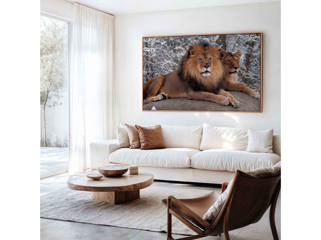 Netradiční kontrast. Ačkoliv jsou lvi spojováni s teplem, obraz lvů ve sněhu působí velmi originálně a vizuálně zajímavě díky kontrastu teplé srsti a studeného sněhu. Tento umělecký motiv zaujme každého návštěvníka a dodá interiéru punc originality a nevšednosti.