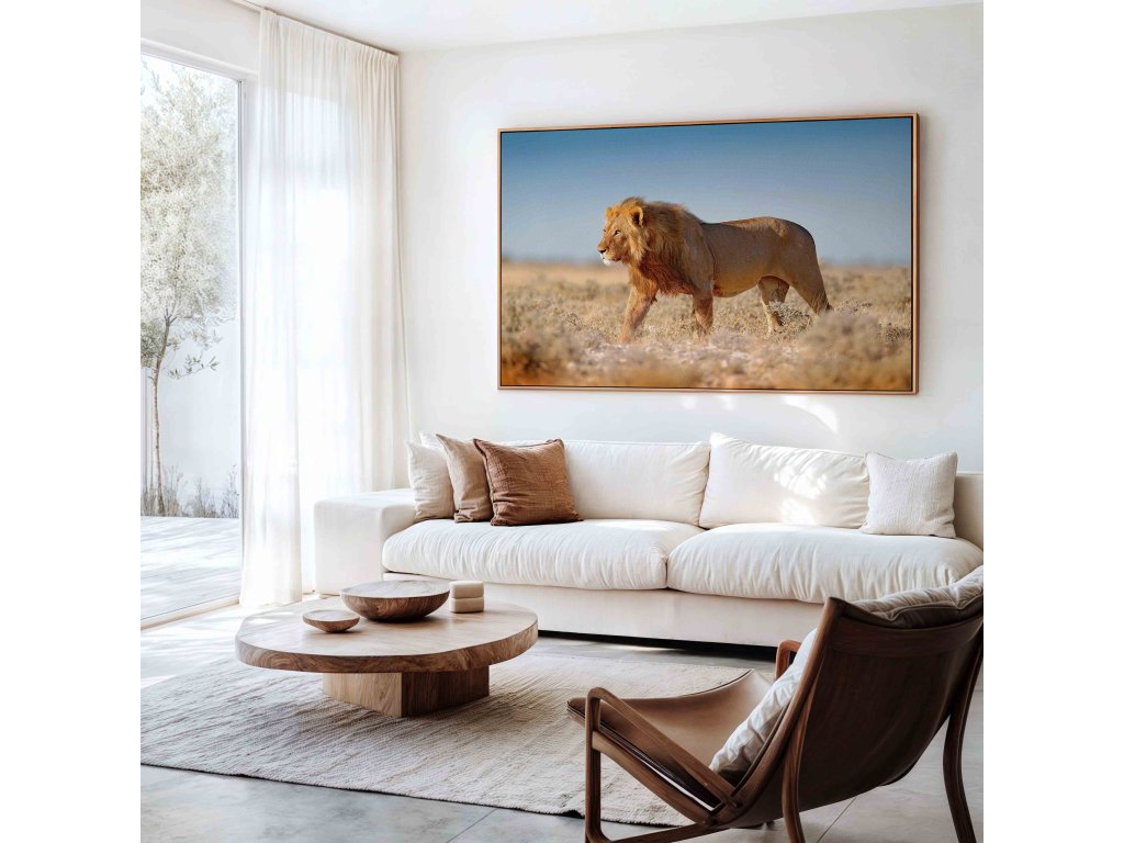 Krok krále. Obraz lva v chůzi ukazuje jeho svaly v pohybu a plynulost kroku. Působí sebejistě a cílevědomě. Tento obraz na plátně je ideální pro chodby nebo delší stěny, kde podtrhne pohyb a směr. Symbol cesty vpřed s hlavou vztyčenou.