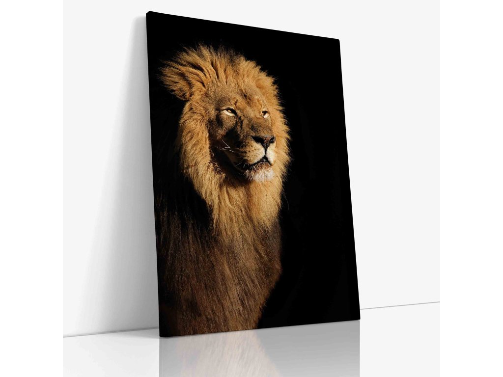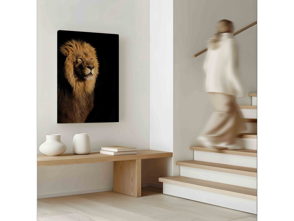 Zlatá hodinka v savaně. Obraz lva nasvíceného měkkým ranním světlem má neopakovatelnou atmosféru. Srst se zlatavě leskne a celý výjev působí optimisticky a svěže. Tento obraz na plátně vnese do vašeho domova světlo a energii nového dne spolu s majestátností krále zvířat.