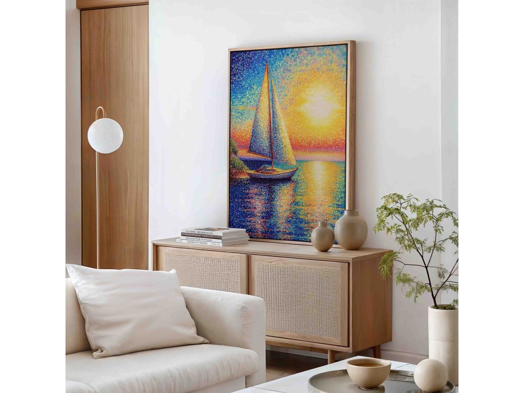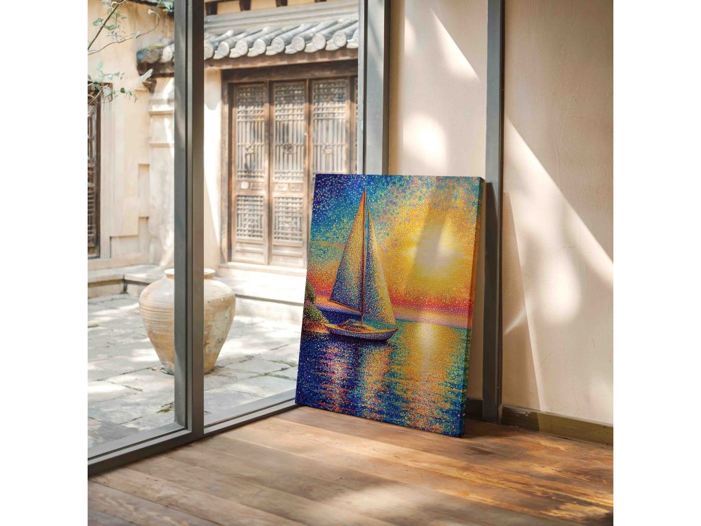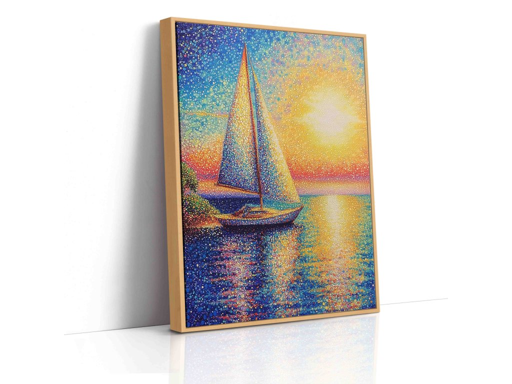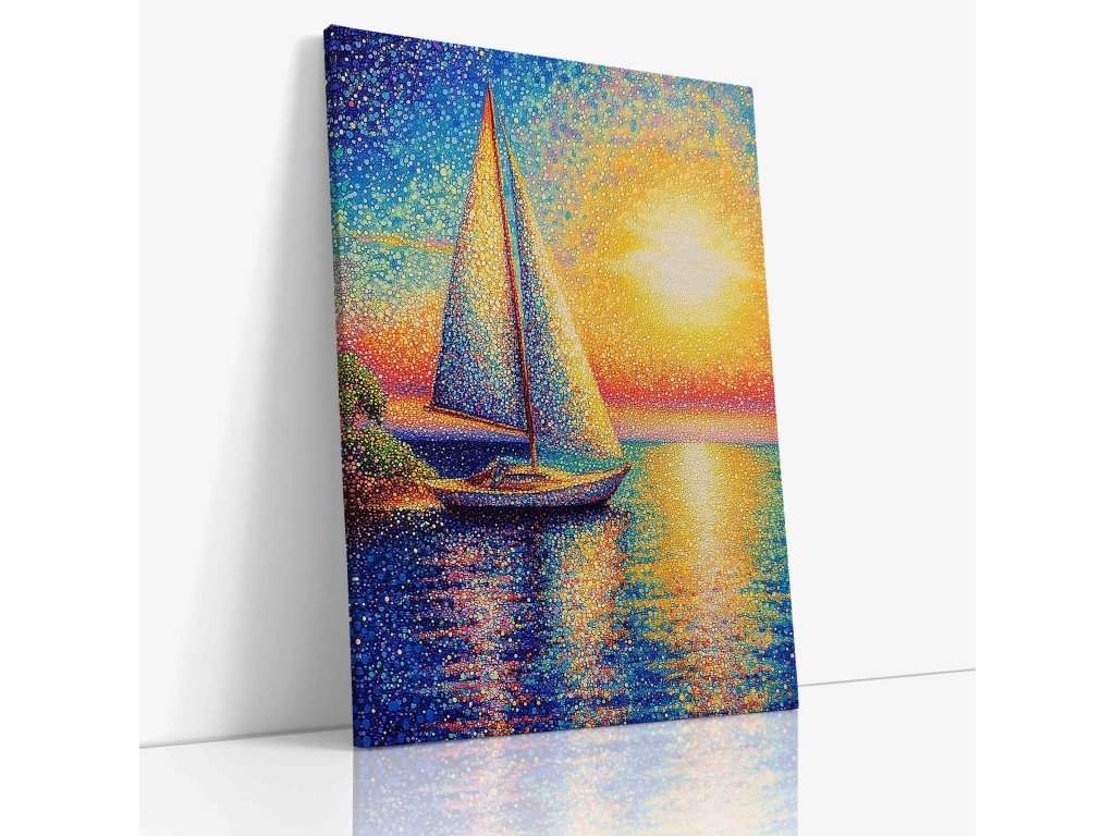 Dechberoucí pointilistický obraz zachycující siluetu lodi na moři při magickém západu slunce. Tisíce pečlivě umístěných barevných teček vytvářejí úchvatnou hru světla a barev. Teplé oranžové a červené odstíny kontrastují s tmavšími tóny moře, což dodává obrazu dramatičnost. Tento kvalitní obraz na plátně prozáří váš domov a přinese kousek romantiky.