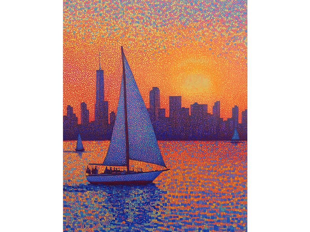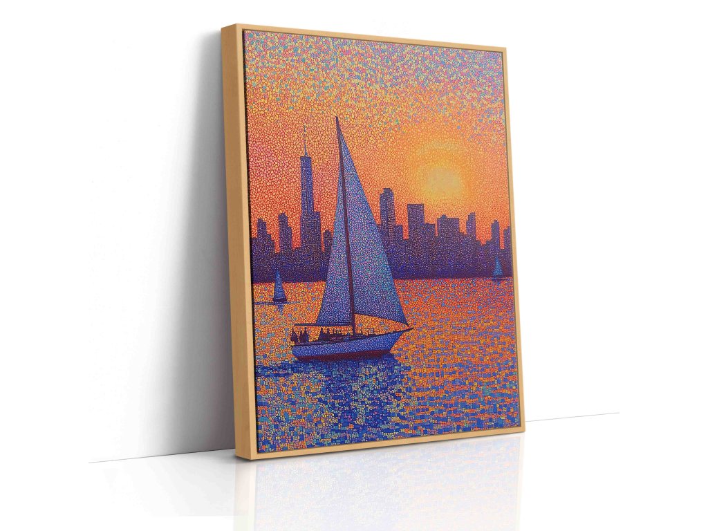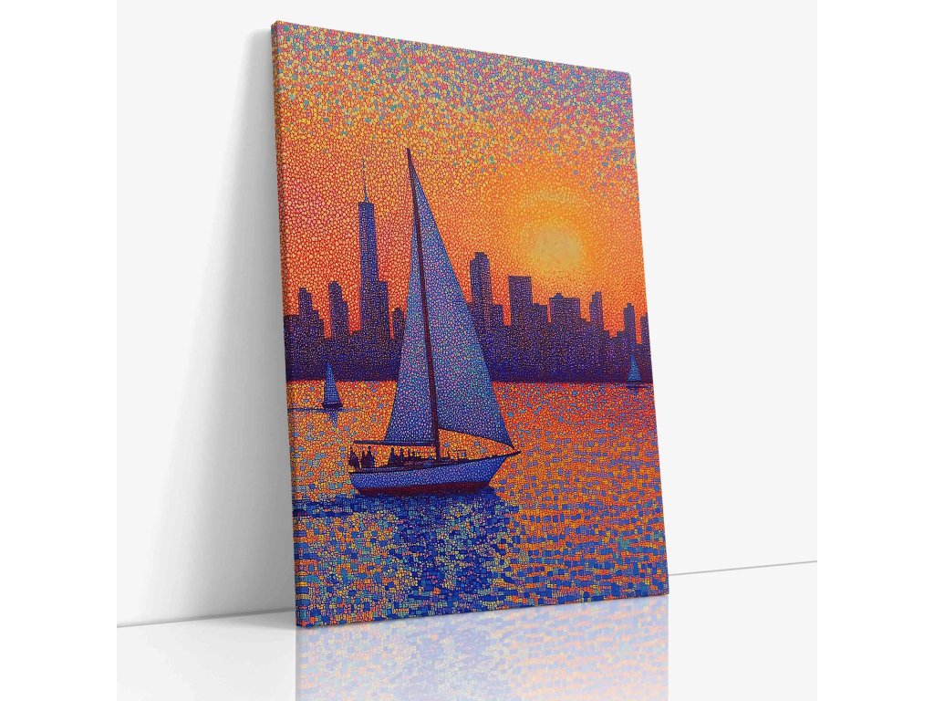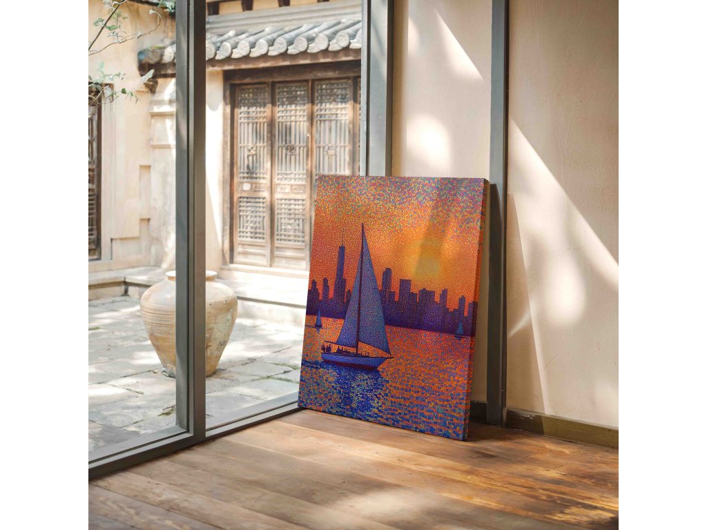 Velkolepý pointilistický obraz zachycující majestátní loď u městského pobřeží při západu slunce. Tisíce drobných barevných teček vytvářejí jedinečnou atmosféru soumraku, kdy poslední paprsky slunce barví město i vodu do zlatých a oranžových odstínů. Technika pointilismu zde dokonale vystihuje hru světla a stínů. Tento obraz na plátně dodá vašemu prostoru eleganci.