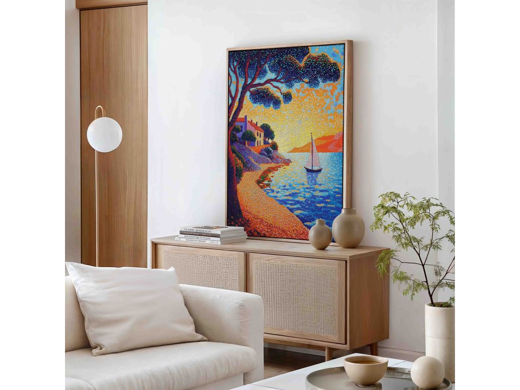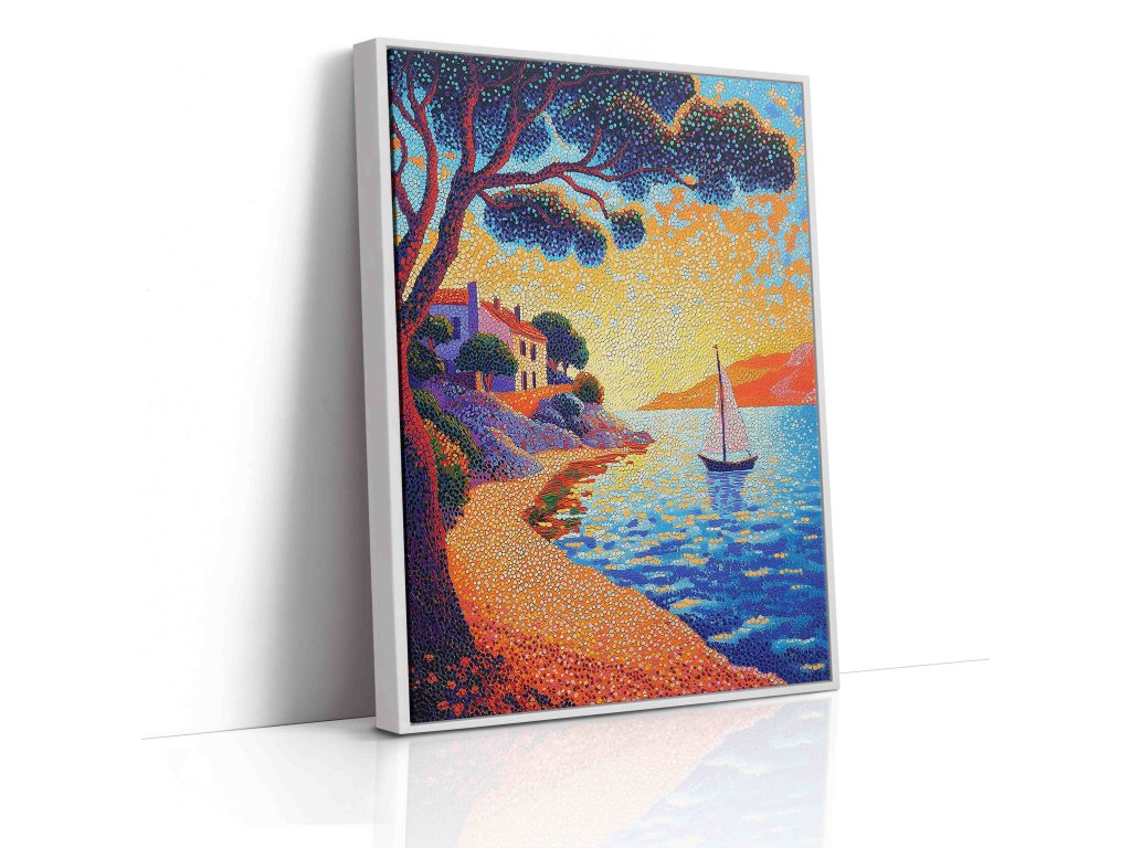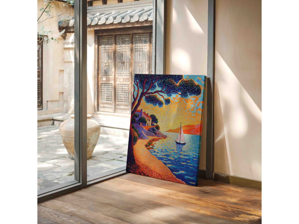 Okouzlující pointilistické dílo zachycující idylickou scénu lodi v malebném zálivu středomořské vesničky. Pomocí tisíců drobných barevných teček autor mistrně vykresluje typickou architekturu a azurové moře. Každý bod barvy přispívá k vytvoření živé atmosféry a světelných efektů. Toto plátno přinese středomořský půvab do vašeho interiéru.