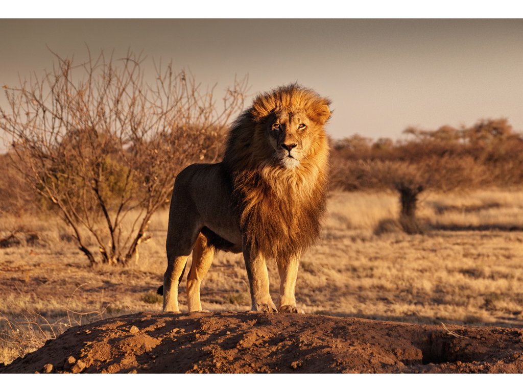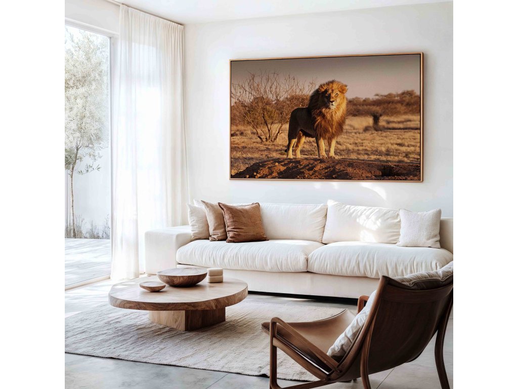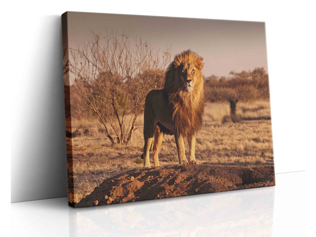 Na vrcholu skály. Obraz lva stojícího na vyvýšeném místě a přehlížejícího své teritorium. Ikonický výjev připomínající známé příběhy. Symbol vlády, přehledu a odpovědnosti. Tento obraz na plátně dodá vašemu domovu atmosféru majestátnosti a vůdcovství.
