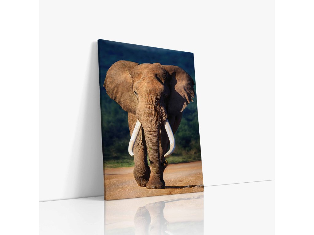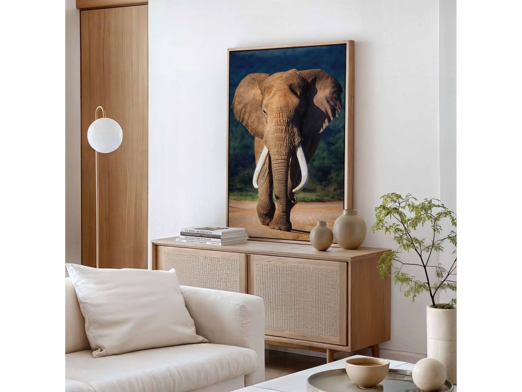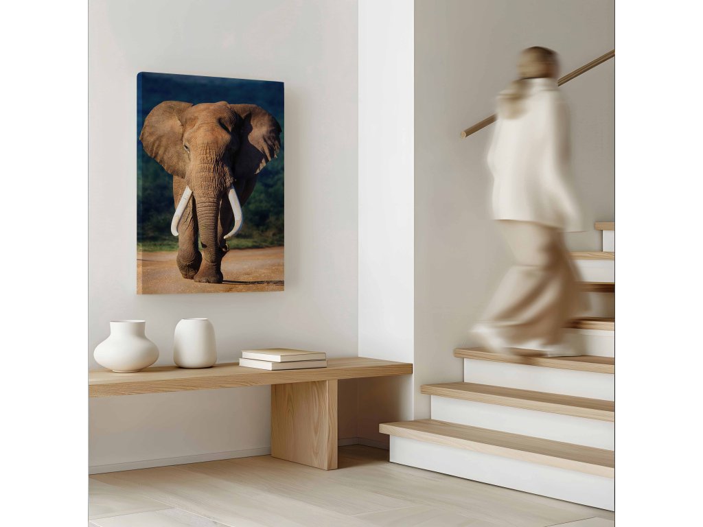 Impozantní zobrazení slona v celé jeho majestátní velikosti a důstojnosti. Tento obraz dokonale vystihuje sílu a vznešenost největšího suchozemského savce. Dramatické nasvícení zdůrazňuje každý detail jeho mohutného těla, od textury kůže až po impozantní kly. Díky perfektní kompozici a věrným barvám vzniká silný vizuální dojem. Tisk na prémiové plátno zaručuje dlouhodobou stálost barev.
