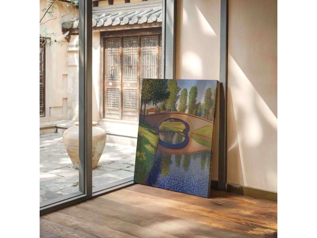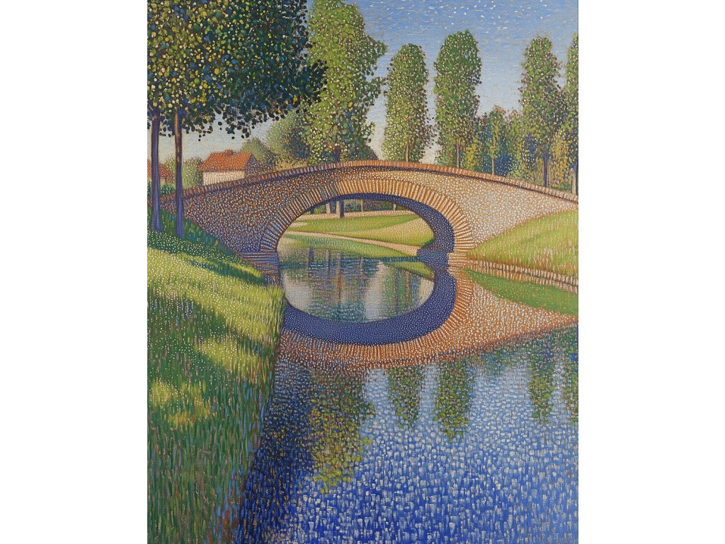 Impozantní pointilistický obraz zachycující elegantní most klenoucí se přes klidnou řeku. Tisíce drobných barevných teček vytvářejí fascinující strukturu mostu a jeho odraz na vodní hladině. Technika pointilismu zde dokonale vystihuje architektonickou krásu i přírodní scenérii. Tento jedinečný obraz na kvalitním plátně přinese do vašeho interiéru harmonii a eleganci.