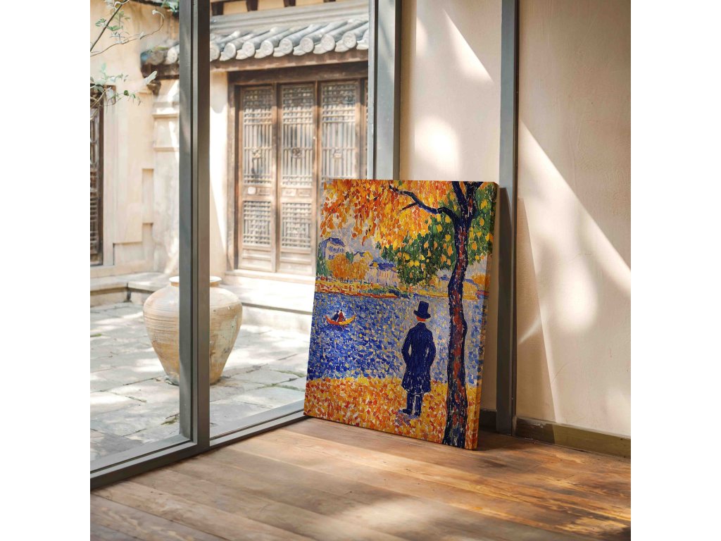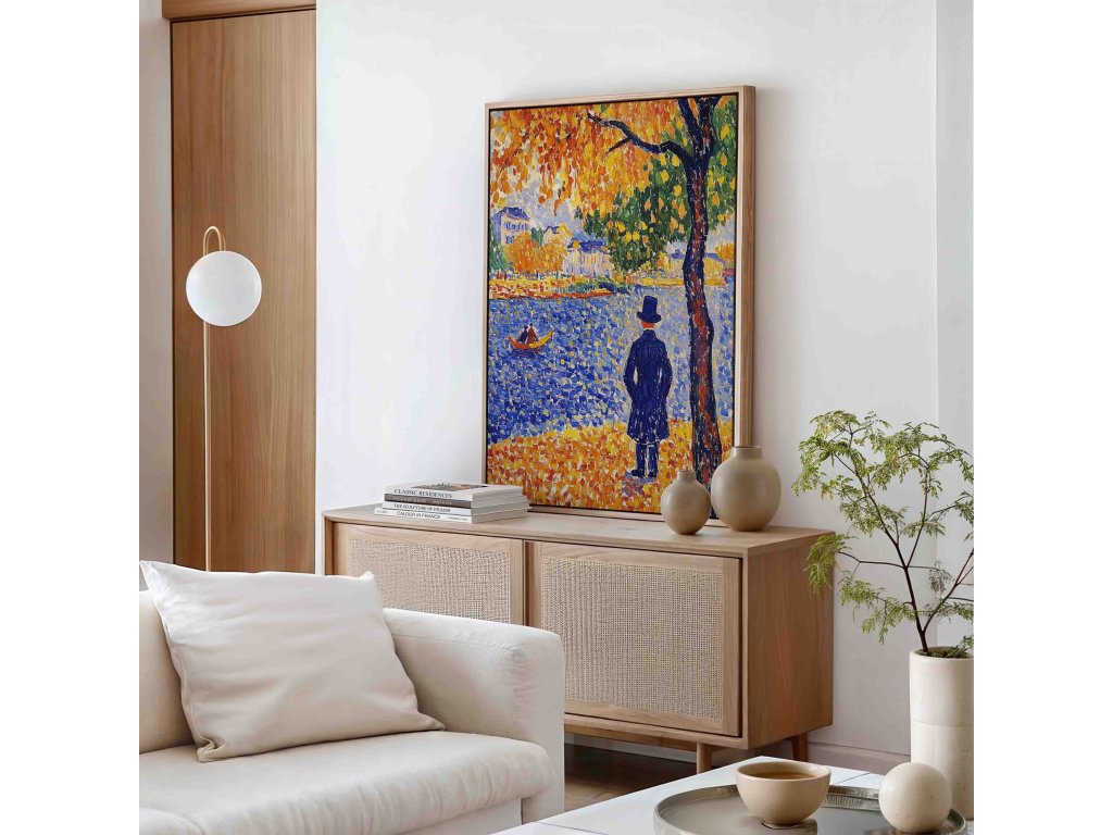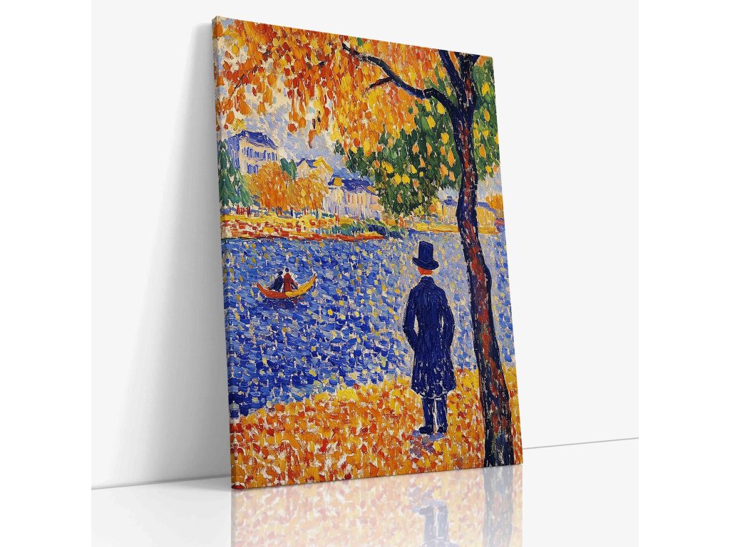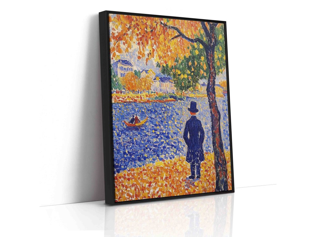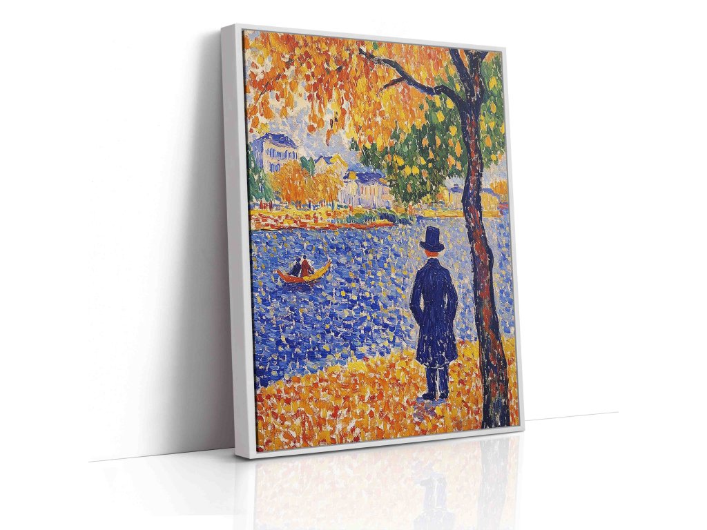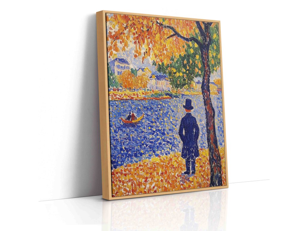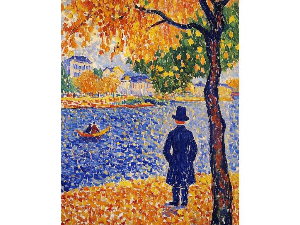 Elegantní pointilistický portrét muže s cylindrem, který zachycuje charakter a noblesu postavy. Technika drobných barevných teček vytváří fascinující texturu a hloubku, která dodává tváři i postavě živost. Každý bod barvy přispívá k vytvoření atmosféry z přelomu století. Tento umělecký obraz na kvalitním plátně přinese do vašeho prostoru stylovou atmosféru.