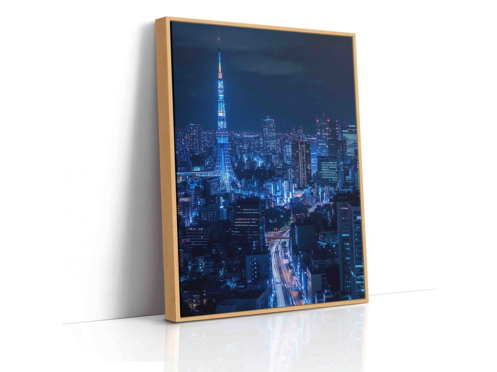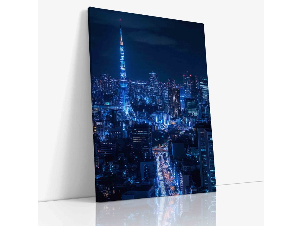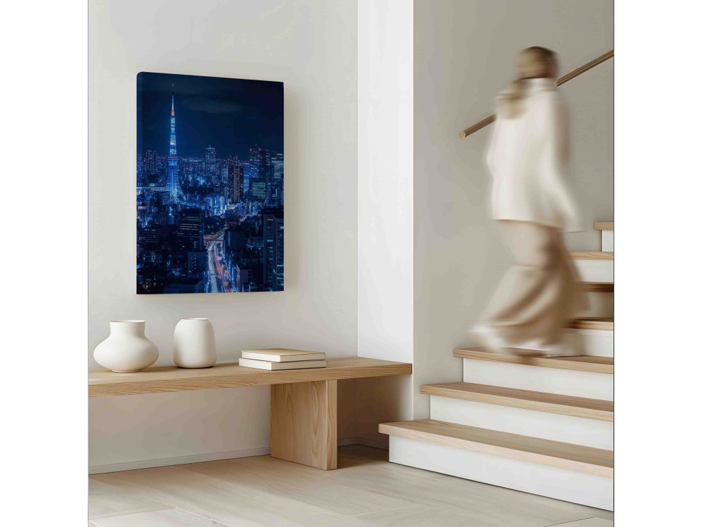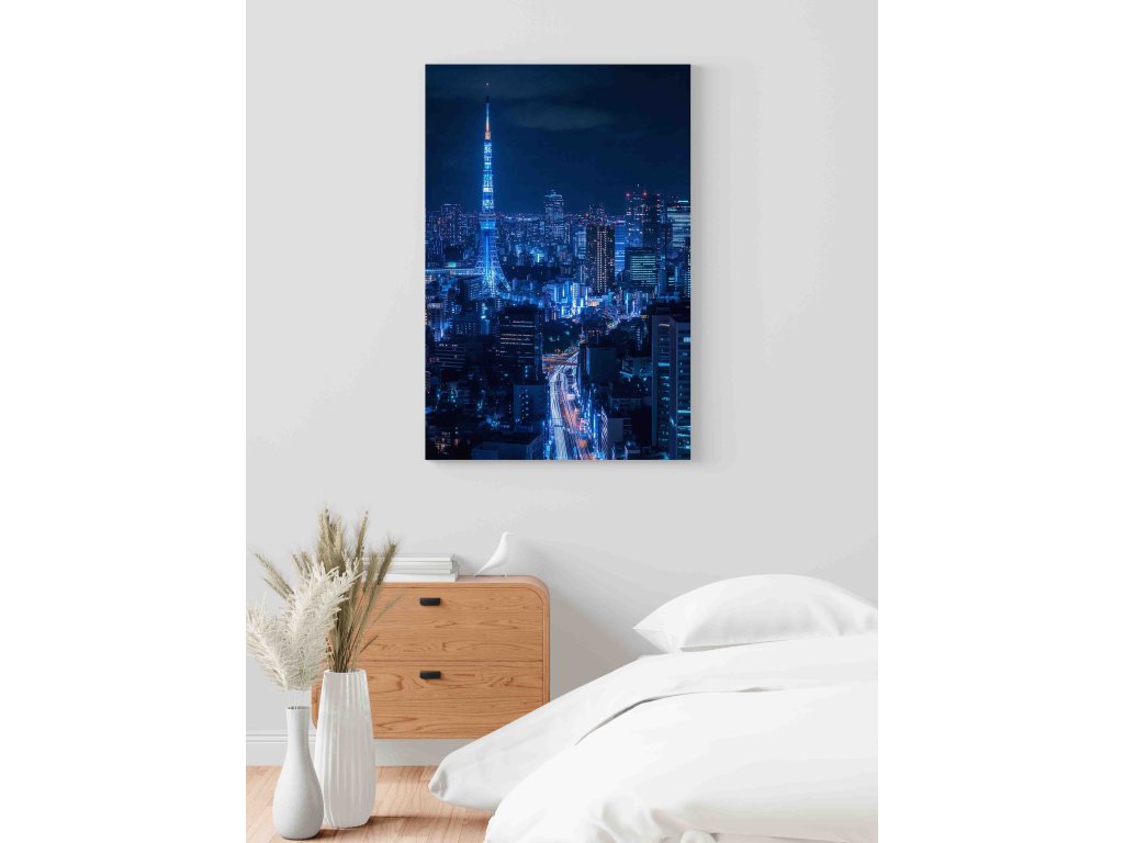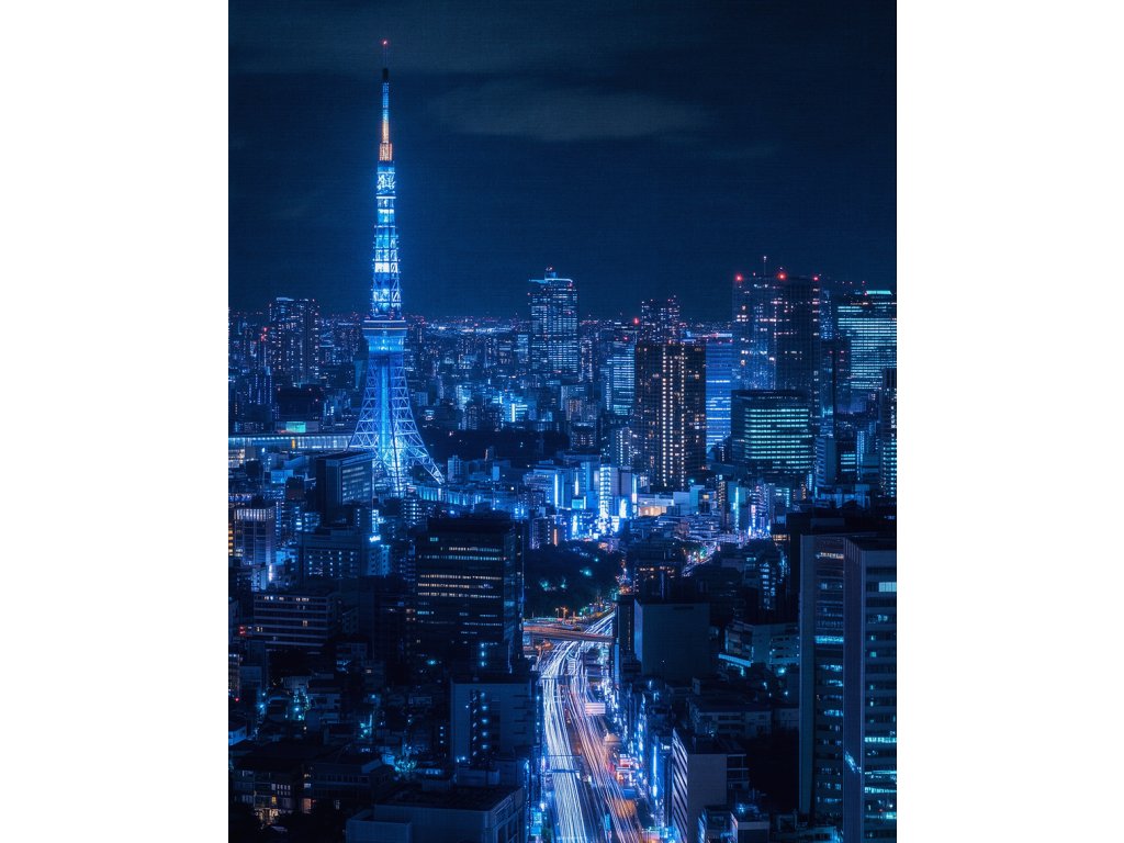 Červená dominanta Tokia uprostřed nočního oceánu světel. Obraz osvětlené Tokyo Tower zachycuje pulzující atmosféru japonské metropole. Kontrast sytě červené konstrukce věže a nekonečného městského horizontu plného neonů vytváří unikátní vizuální zážitek. Skvělá volba pro fanoušky Japonska, moderních technologií a kyberpunkové estetiky, která oživí každou stěnu.