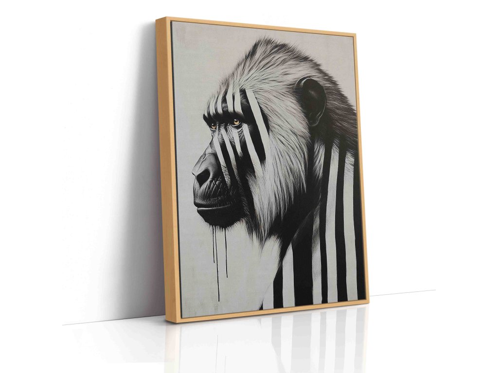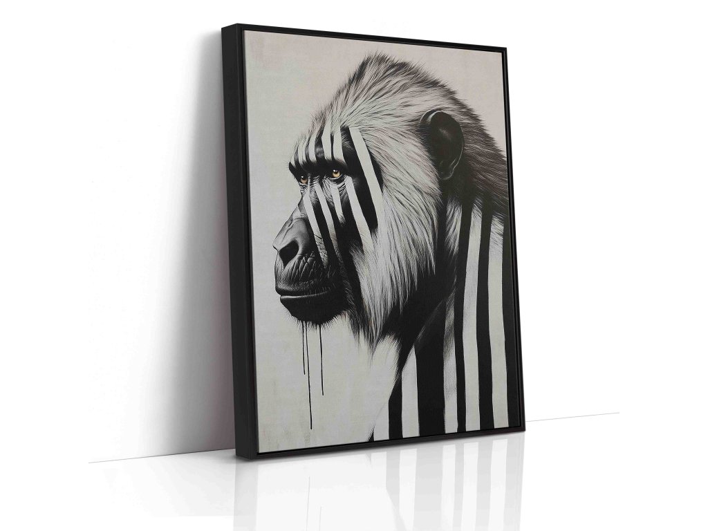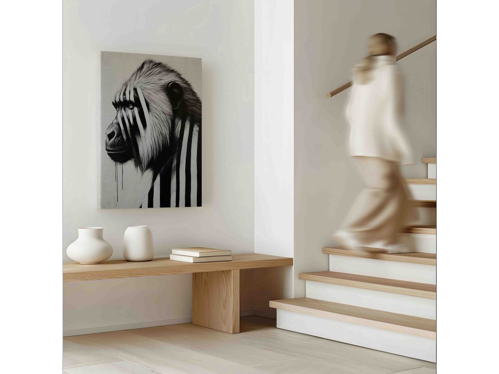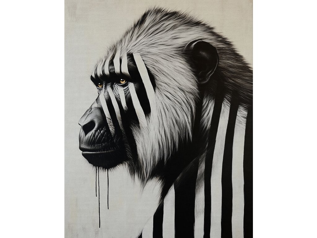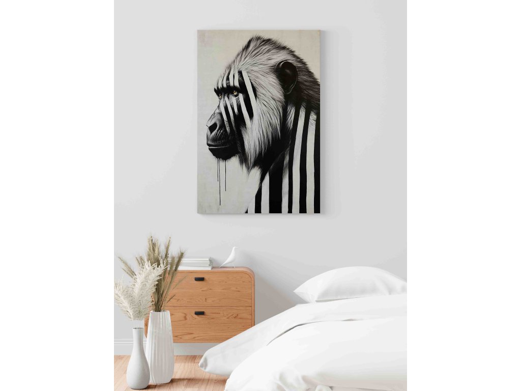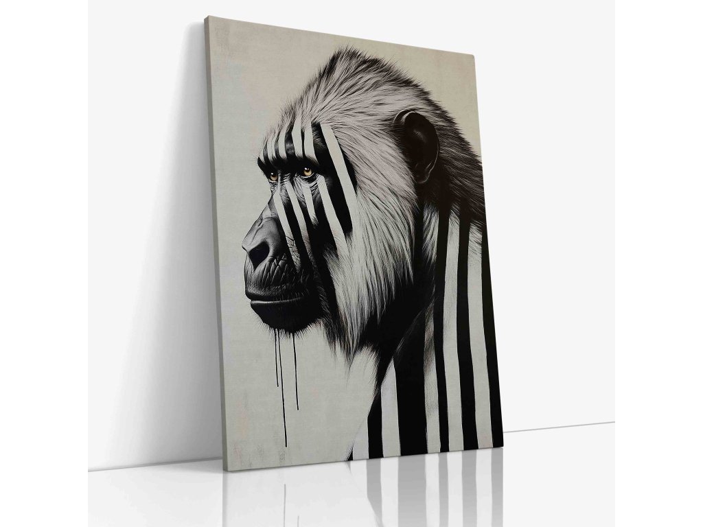 Exprese a charakter v každé čáře. Tento obraz na plátně zachycuje paviána pomocí černobílých pruhů, což zdůrazňuje jeho šibalský výraz a sílu. Pruhovaný grafický styl dodává exotickému primátovi moderní a lehce abstraktní rozměr, který se skvěle hodí do kreativních prostor nebo moderních bytů. Kvalitní tisk na plátno napnuté na rámu je připraven k okamžitému oživení vašeho interiéru originálním způsobem.