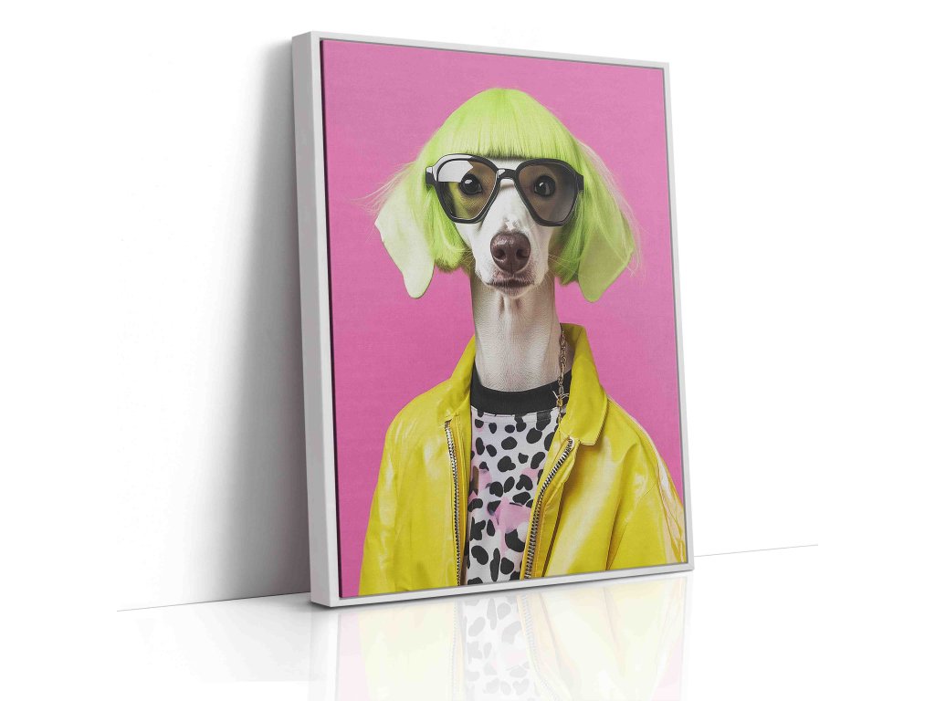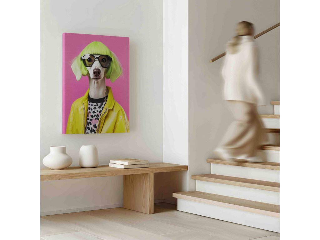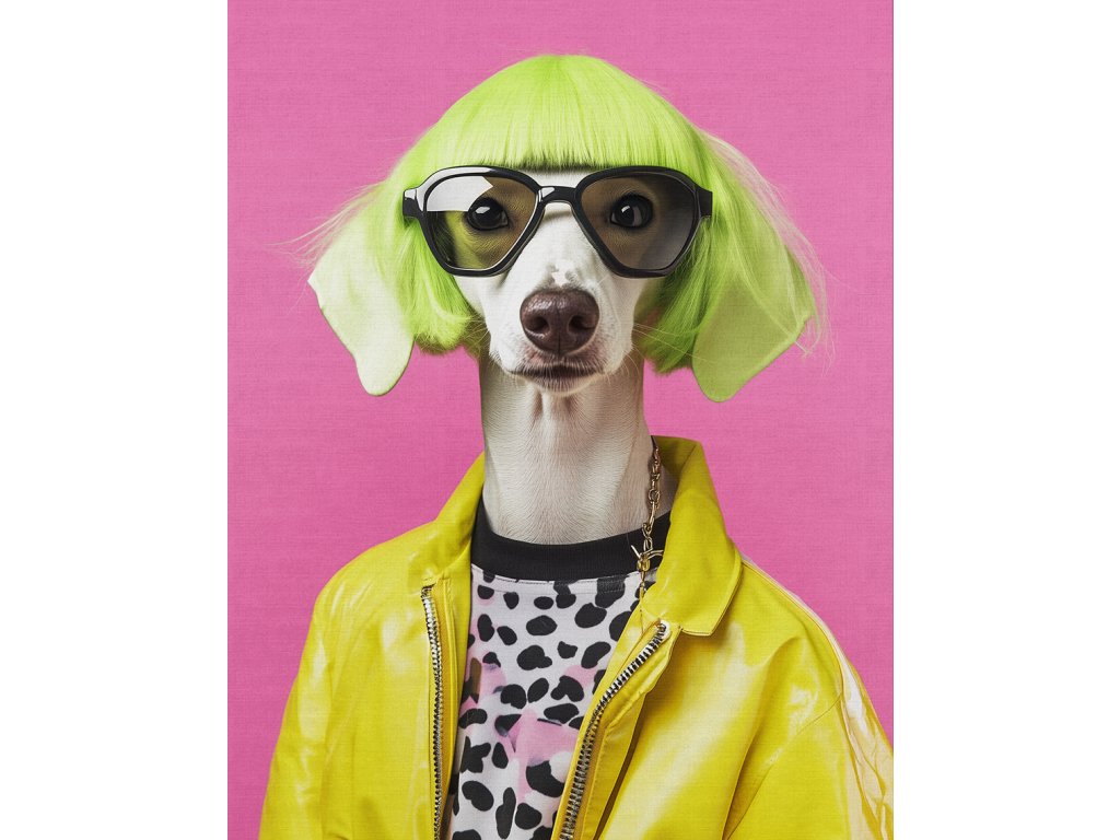 Dopřejte svému domovu dávku extravagance. Tento unikátní obraz na plátně zachycuje psa ve stylové žluté bundě a s parukou. Jedná se o odvážné umělecké dílo, které kombinuje humor, módu a zvířecí šarm. Zářivě žlutá barva bundy prosvětlí i ten nejtmavší kout místnosti. Je to ideální kousek pro sběratele netradičního umění a majitele psů, kteří se nebojí vyčnívat z davu.
