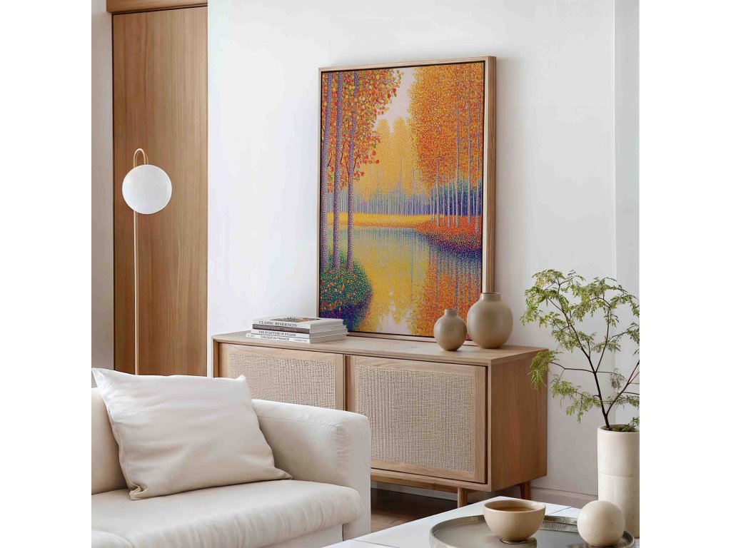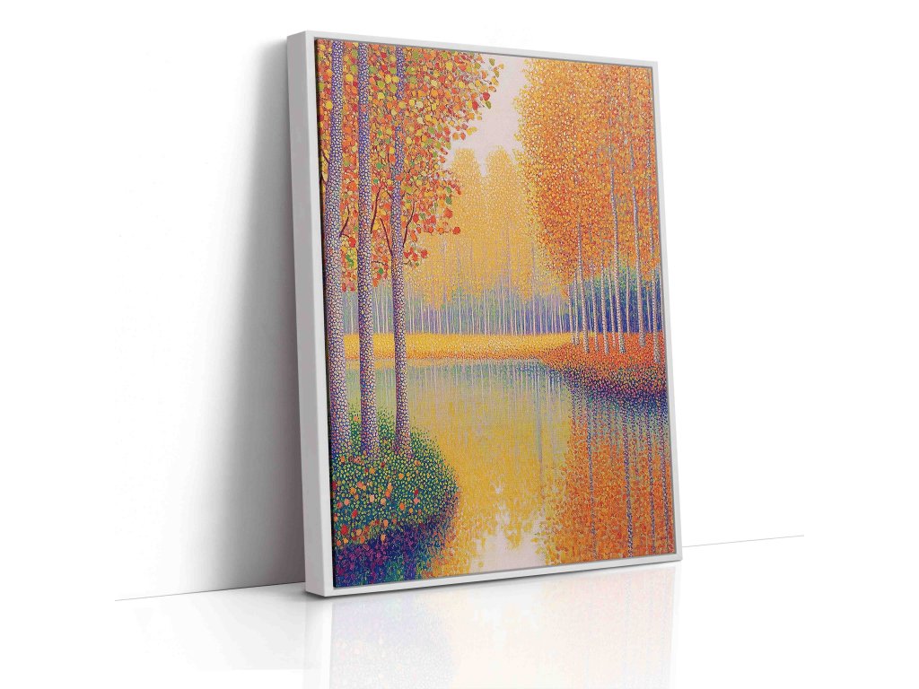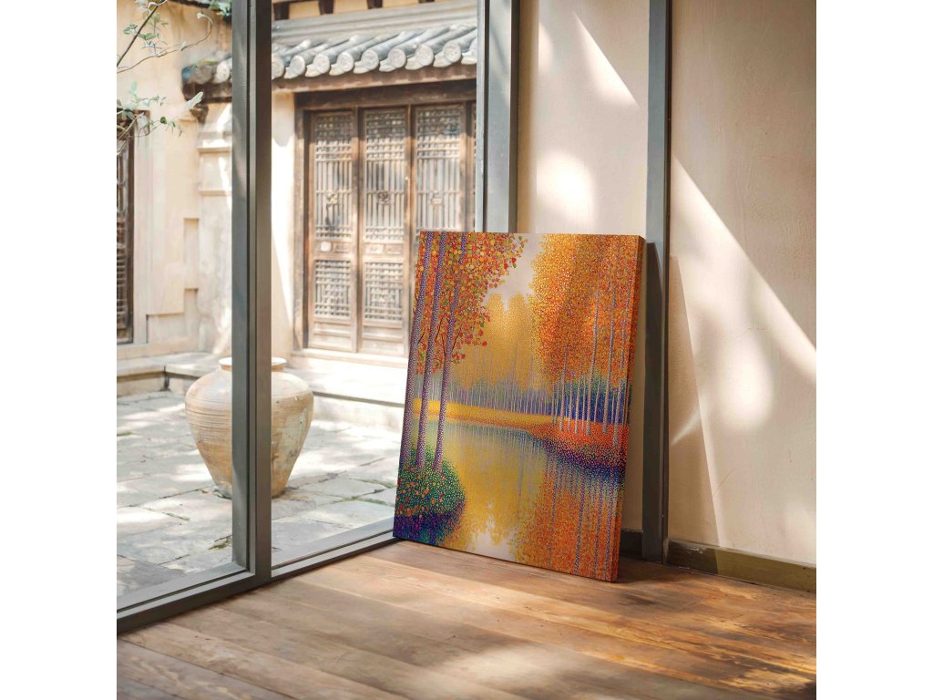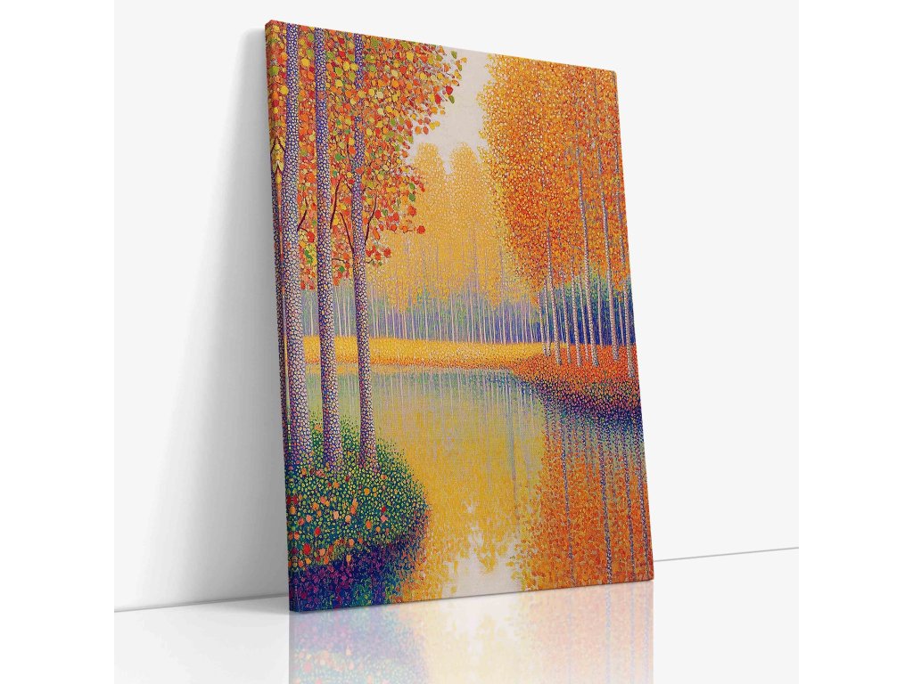 Úchvatný pointilistický obraz zachycující řeku lemovanou stromy v podzimních barvách. Tisíce pečlivě umístěných barevných teček vytvářejí zářivou paletu podzimu a odraz pestrobarevných stromů na vodní hladině. Technika pointilismu dokonale vystihuje vibrující barvy. Tento obraz na kvalitním plátně přinese do vašeho interiéru kouzlo podzimu.