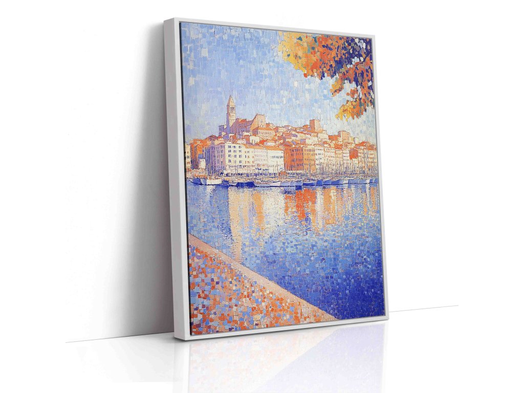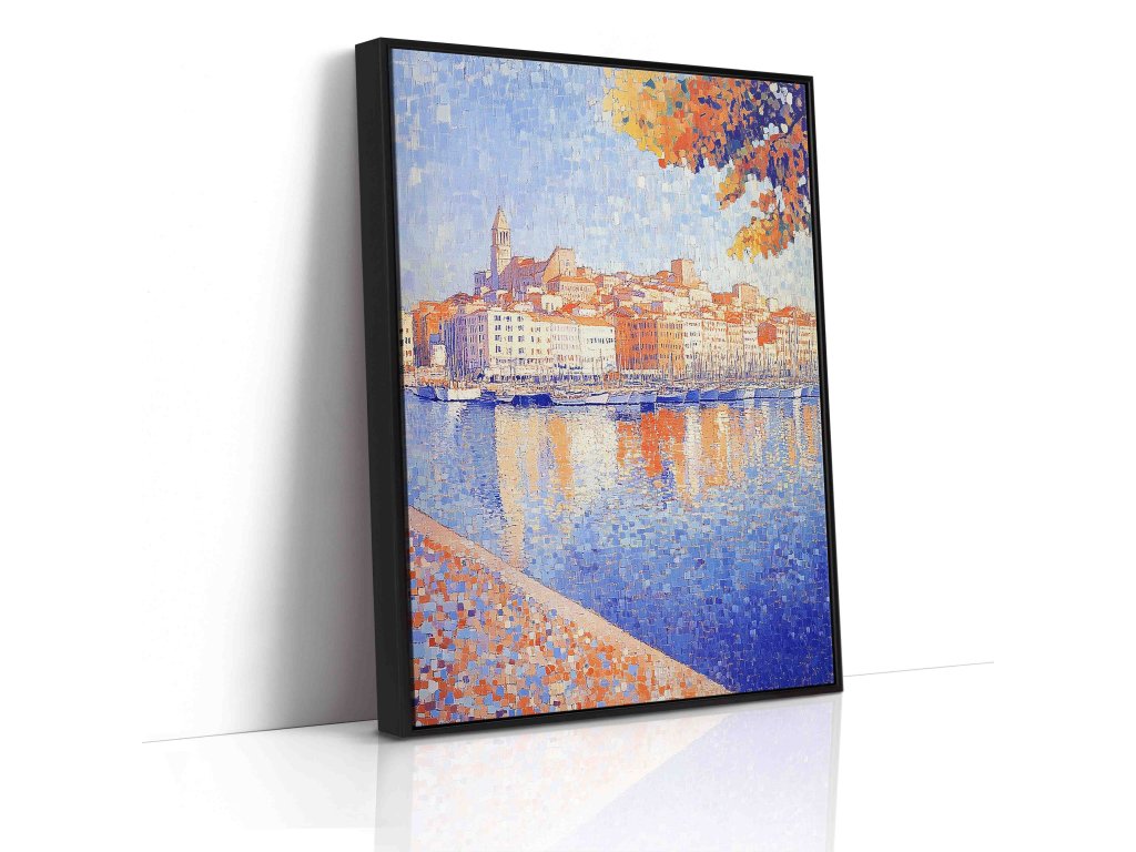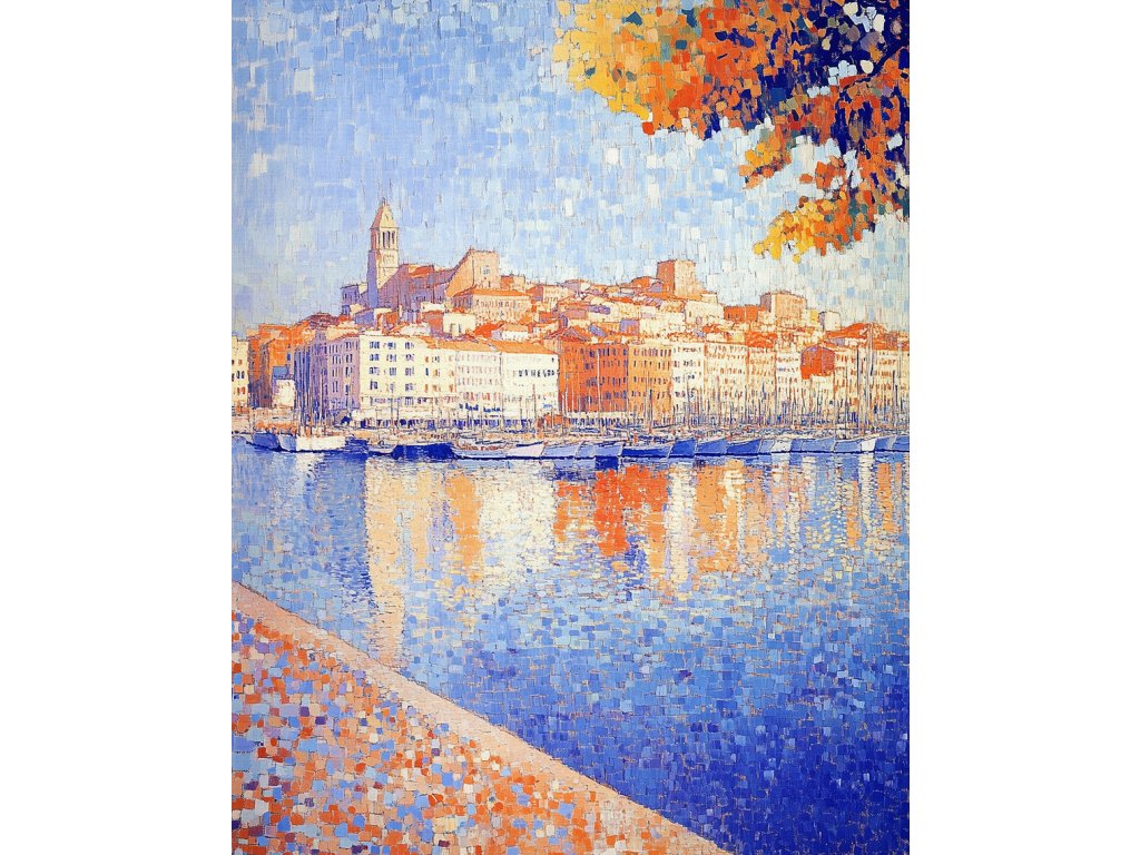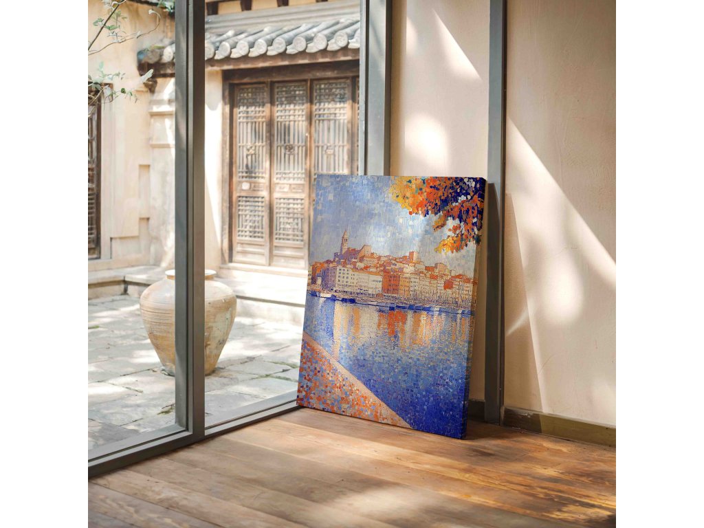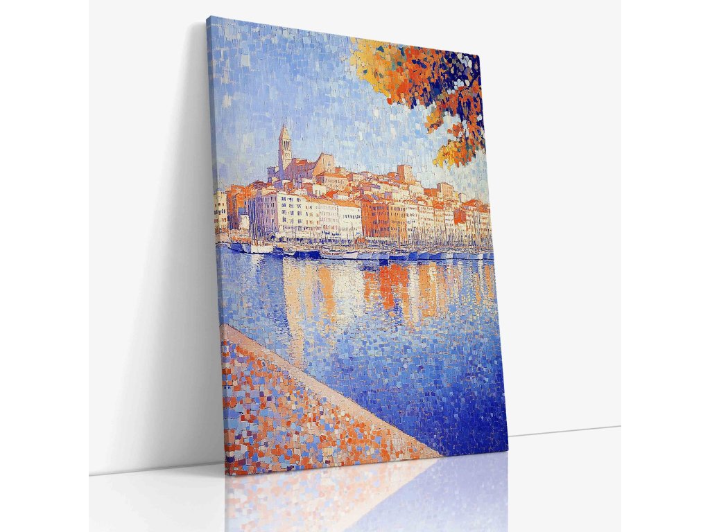 Okouzlující pointilistický obraz zachycující malebné přímořské městečko s typickou architekturou. Tisíce drobných barevných teček vytvářejí živou atmosféru plnou světla, která charakterizuje pobřežní život. Technika pointilismu dokonale vystihuje třpyt mořské hladiny a barevné fasády domů. Tento obraz na kvalitním plátně přinese do vašeho interiéru středomořský půvab.
