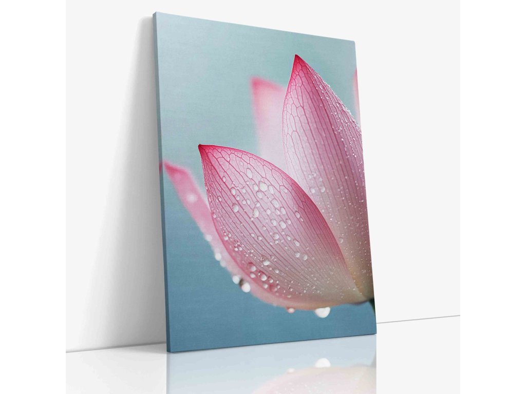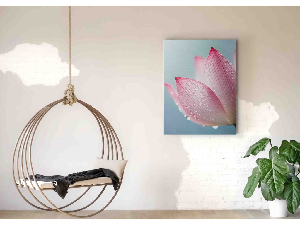 Okouzlující makro záběr růžového lotosu, jehož okvětní lístky zdobí třpytivé kapky vody. Tento obraz na plátně vnese do vašeho interiéru atmosféru klidu a přirozené elegance. Detailní zachycení struktury květu spolu s jemnými kapkami vytváří fascinující hru světla, která dodá vašemu prostoru nádech harmonie. Ideální pro milovníky přírody a minimalistického designu. Růžový lotus symbolizuje čistotu a povznese estetickou hodnotu každé místnosti.