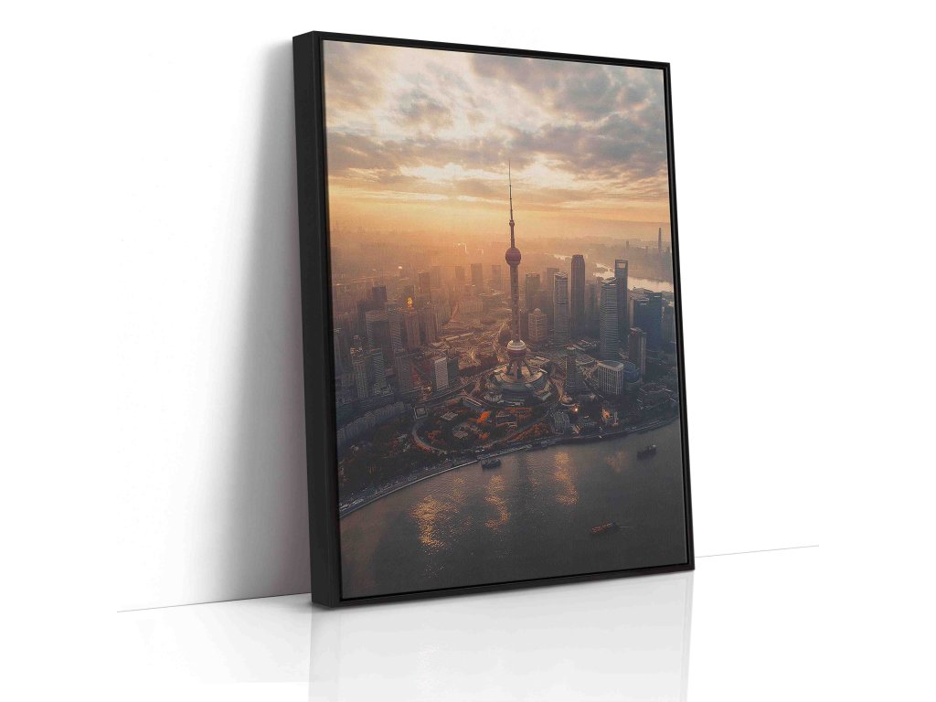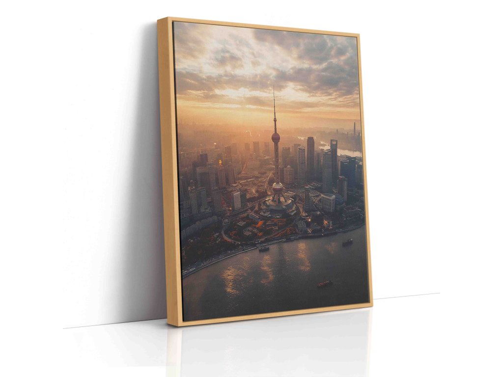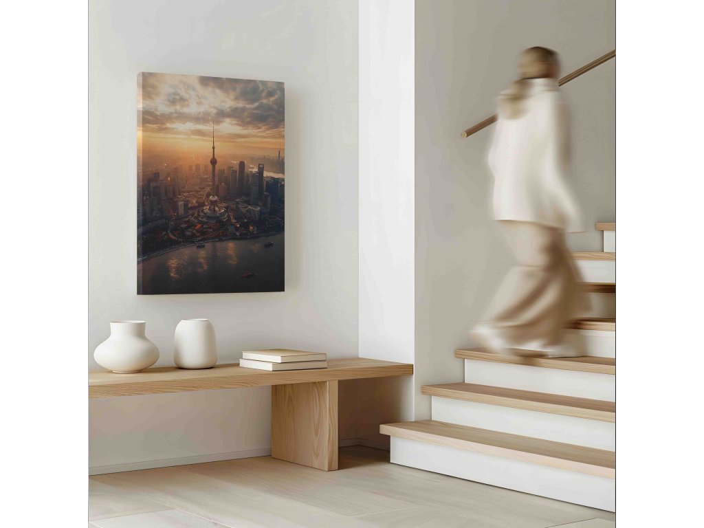 Moderní Čína v nejkrásnějším světle dne. Obraz televizní věže Oriental Pearl Tower v Šanghaji během východu slunce hraje zlatavými a oranžovými tóny. Futuristická architektura věže odrážející ranní paprsky tvoří dynamickou kompozici, která ztělesňuje rozkvět a energii této metropole. Skvělá dekorace pro fanoušky moderního urbanismu a architektury.
