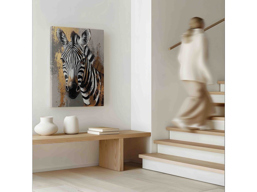 Když se africká savana zahalí do luxusu. Obraz na plátně se zebrou v šedo-zlaté barevné kombinaci je vrcholem moderní elegance. Ikonické pruhy zebry doplněné o zlaté odlesky vytvářejí fascinující vizuální efekt, který okamžitě pozvedne úroveň místnosti. Skvěle se hodí nad krb, do ložnice nebo do stylového obývacího pokoje. Kvalitní tisk na plátno zajišťuje, že zlatá barva bude působit jasně a dodá obrazu hloubku, která vás neomrzí.