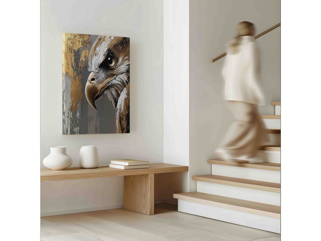 Vznešenost dravce v barvách přepychu. Obraz na plátně se symbolem orla v šedo-zlaté barevné kombinaci vyzařuje svobodu a exkluzivitu. Zlaté prvky na peří a zobáku dodávají orlovi královský vzhled, který vynikne v každém moderním interiéru. Skvělá volba pro reprezentativní prostory nebo jako dominantní prvek do obývacího pokoje. Kvalitní tisk na plátno zaručuje, že šedé tóny budou mít hloubku a zlaté detaily budou zářit s každým paprskem světla.