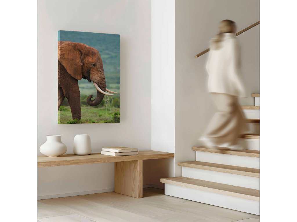 Vneste do svého interiéru svěžest s tímto okouzlujícím obrazem slona v bujné vegetaci. Kontrast mohutného šedého slona se sytými odstíny zeleně vytváří živou a osvěžující kompozici. Zvíře je zachyceno při klidné procházce hustým porostem, kde působí naprosto přirozeně. Prvotřídní tisk na pevné plátno garantuje ostrost detailů a zářivé barvy. Perfektní volba pro ty, kdo chtějí svůj domov obohatit o kousek exotické přírody.