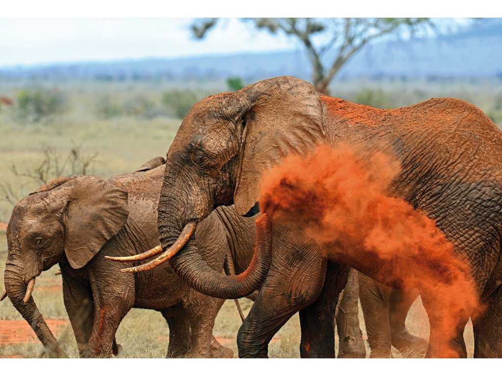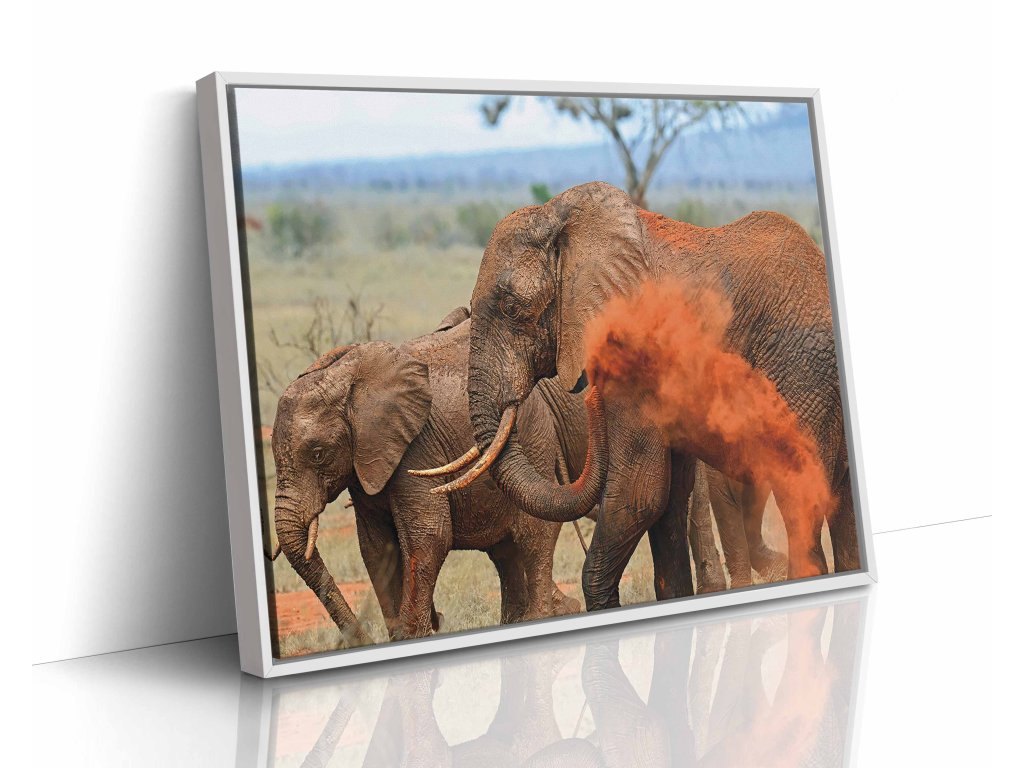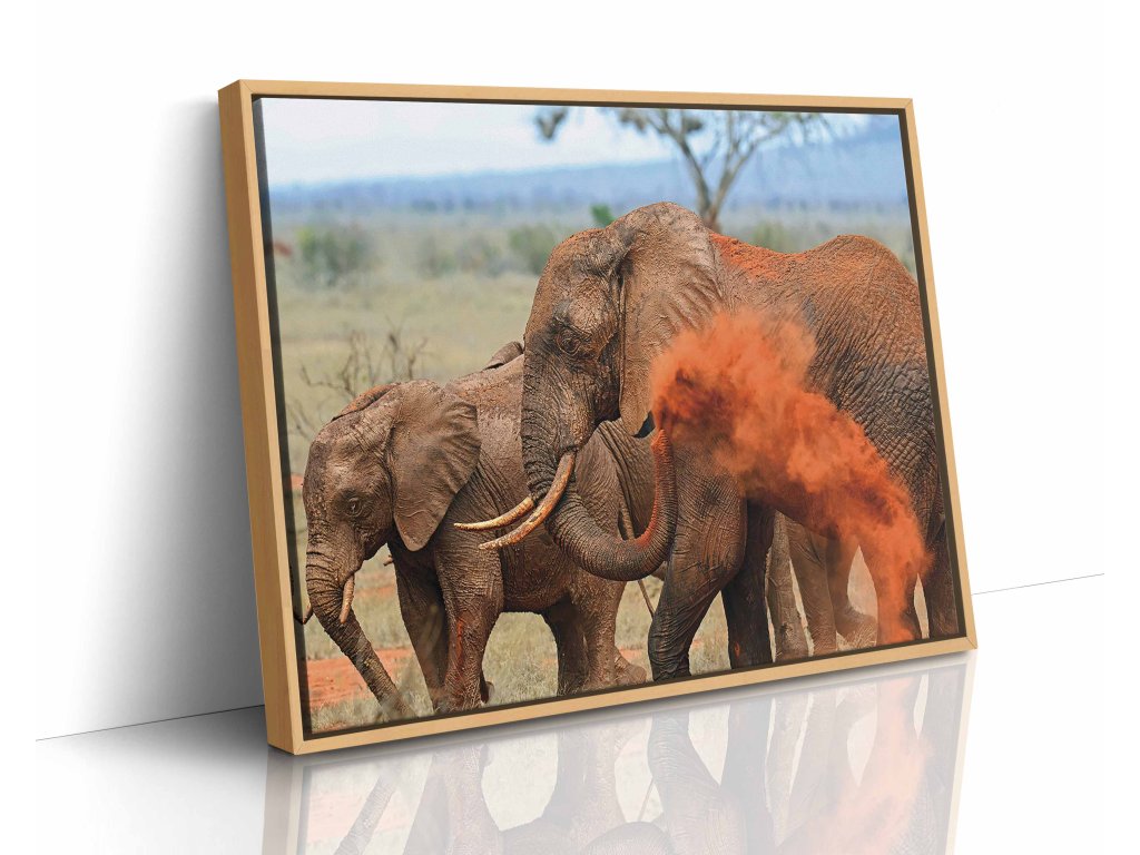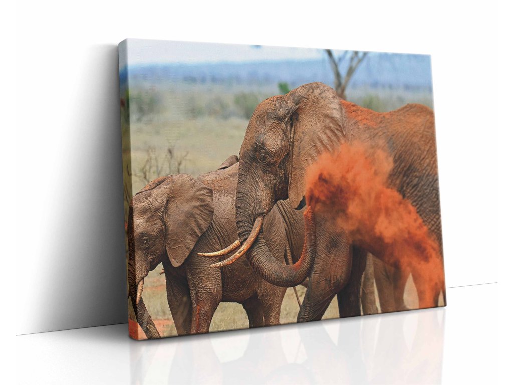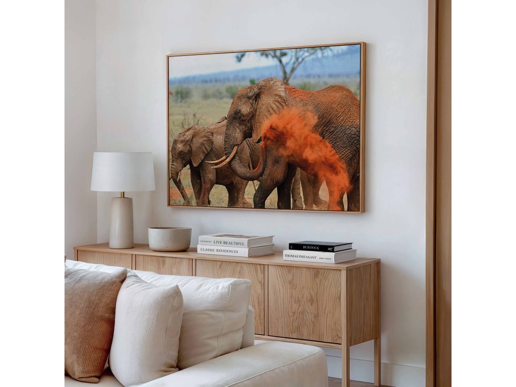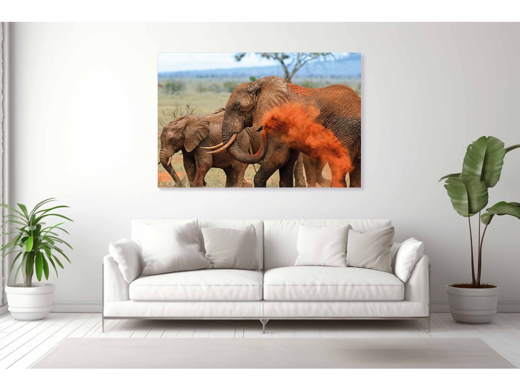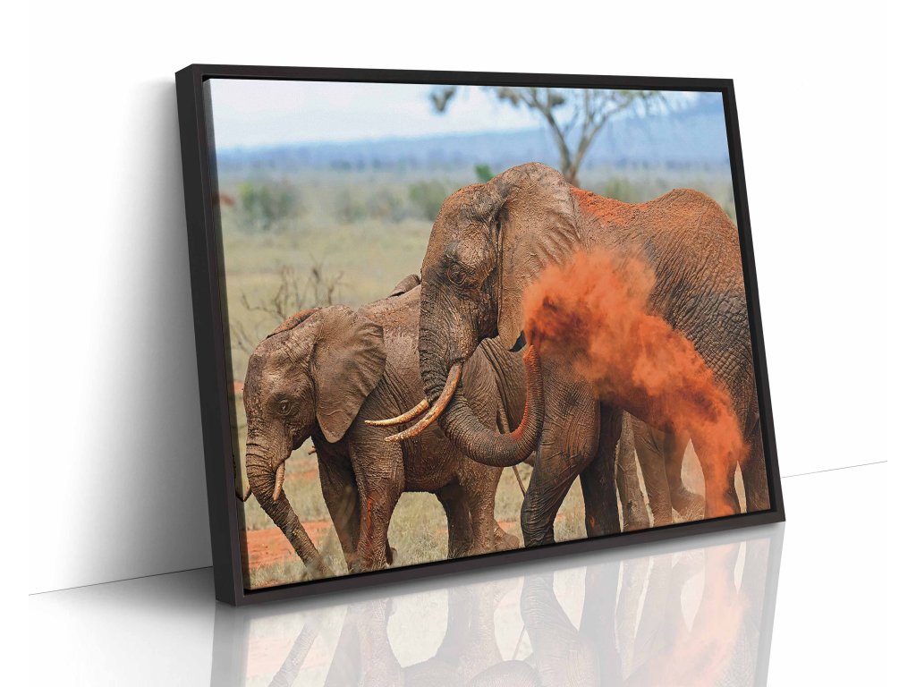 Fascinující obraz zachycující slona při jeho typickém rituálu, kdy se posypává pískem a prachem. Tento přirozený způsob ochrany před sluncem vytváří jedinečný vizuální efekt s oblakem prachu rozptýleným kolem těla. Dynamický moment je zachycen s dokonalou ostrostí. Zemité tóny písečné krajiny tvoří harmonický, a přesto dramatický celek. Tisk na odolné plátno zaručuje věrné barvy a dlouhou životnost.