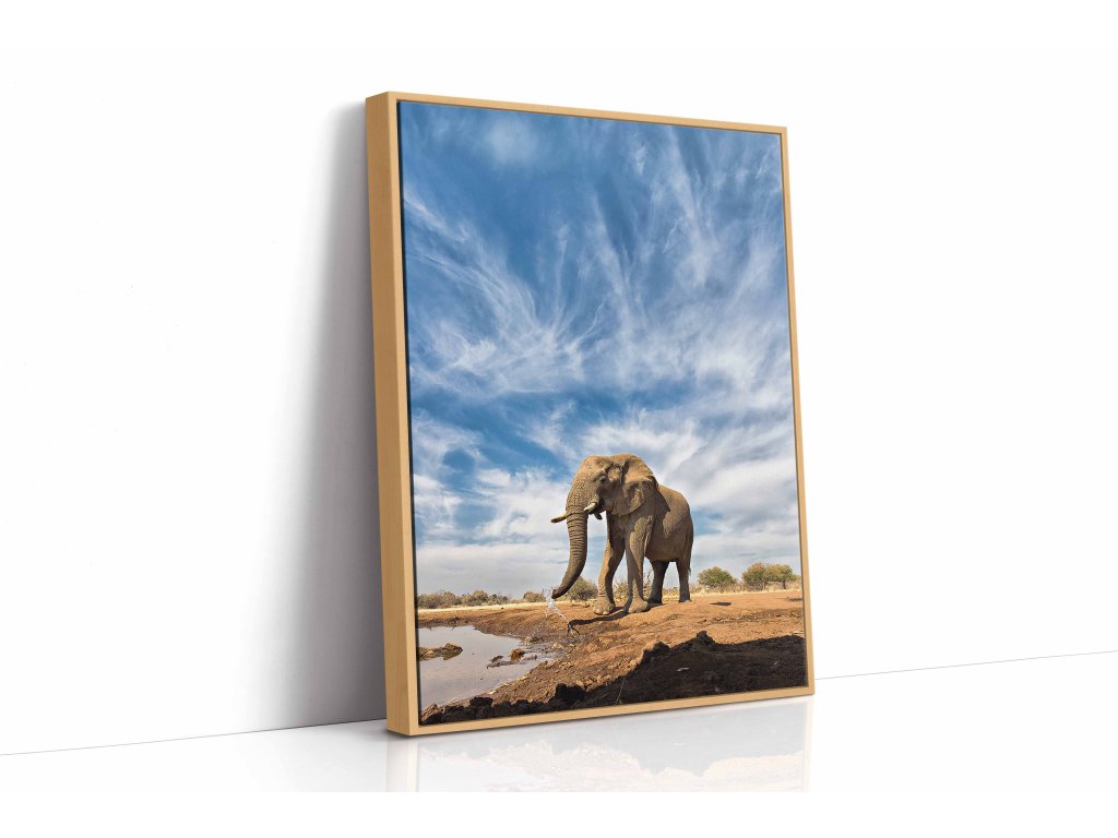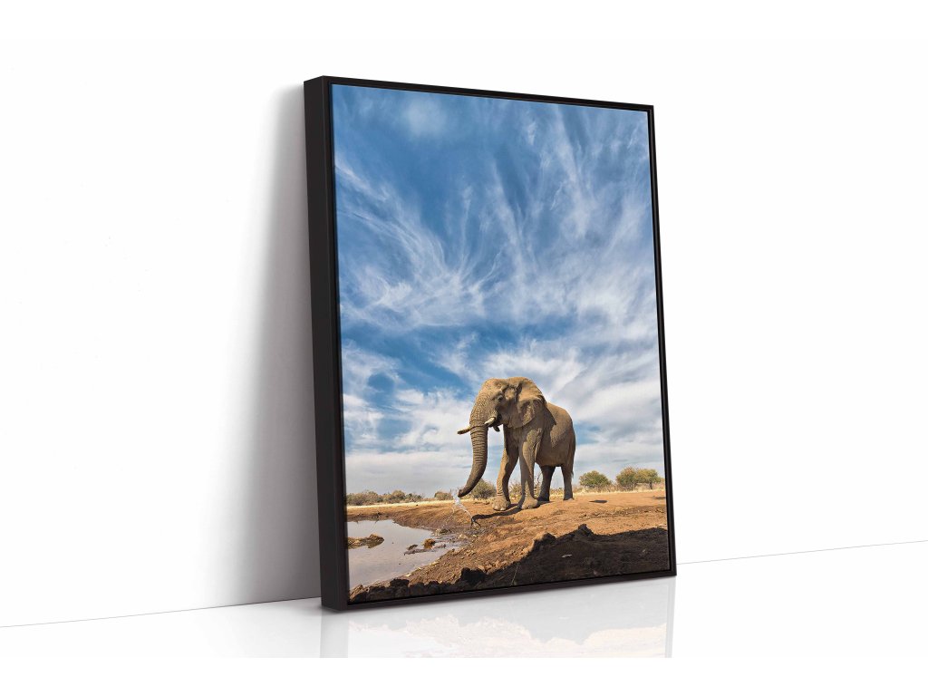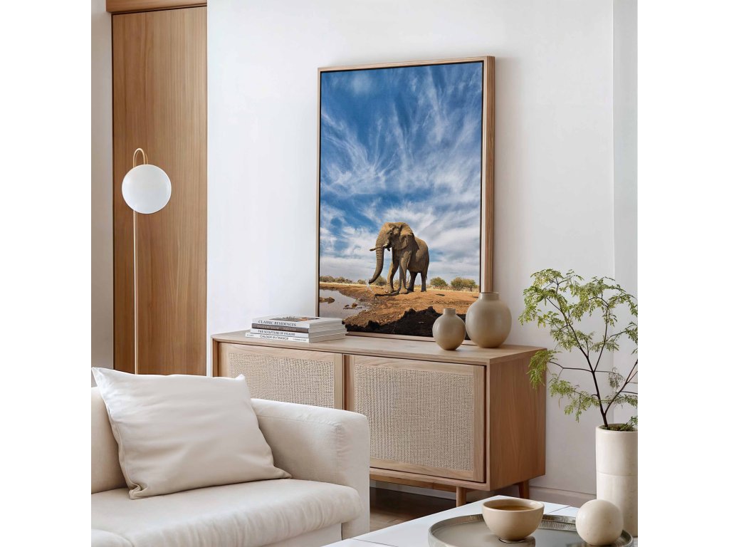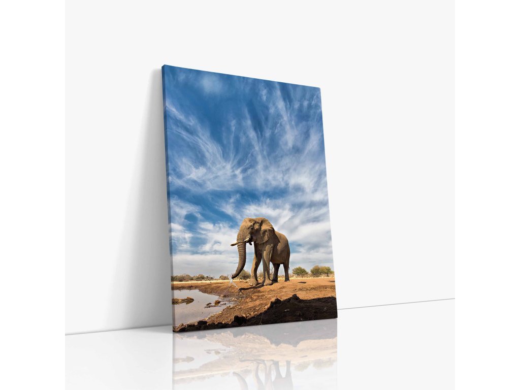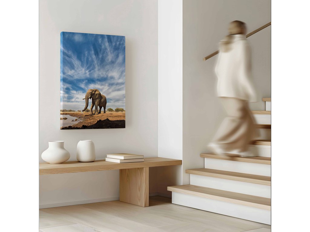 Ponořte se do poklidného okamžiku v divočině s tímto fascinujícím obrazem slona u řeky. Umělecké dílo zachycuje majestátního savce během osvěžení u vodního zdroje. Jasně modrá voda vytváří působivý kontrast s šedou kůží slona, což navozuje atmosféru klidu a přirozené harmonie. Díky prvotřídnímu tisku na prémiové plátno je zaručena dlouhodobá stálost barev. Jedná se o ideální dekoraci pro všechny obdivovatele přírody a exotiky.