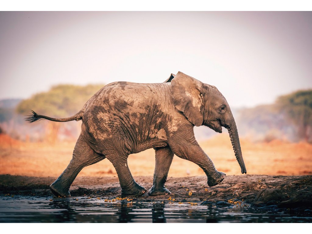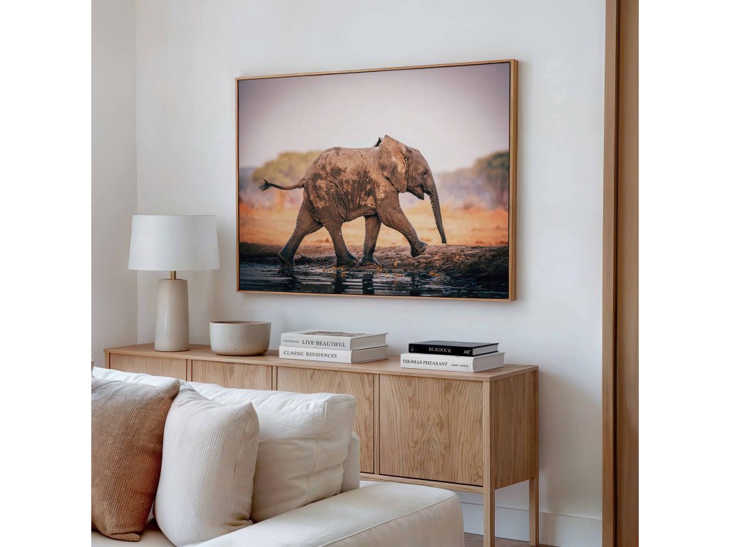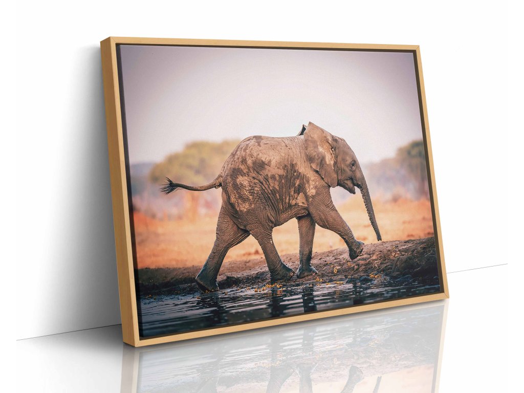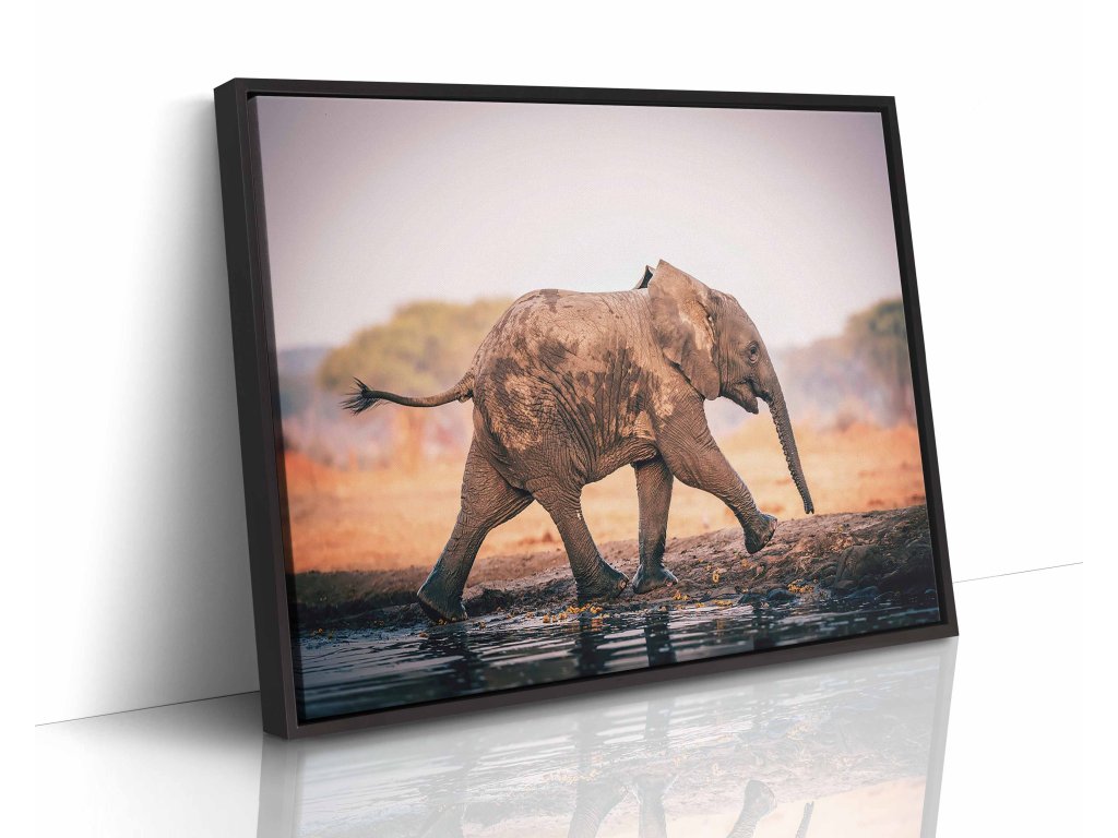 Dynamický obraz zachycující slona v ladném běhu africkou krajinou. Pohyb je zachycen s mimořádnou precizností – mírně rozmazané končetiny a pozvednutý chobot vytvářejí dojem skutečné energie. V pozadí se rozprostírá typická savana, která podtrhuje autentičnost scény. Tisk na prémiové plátno zajišťuje ostrost a věrné podání barev. Ideální dekorace pro milovníky dynamické wildlife fotografie.