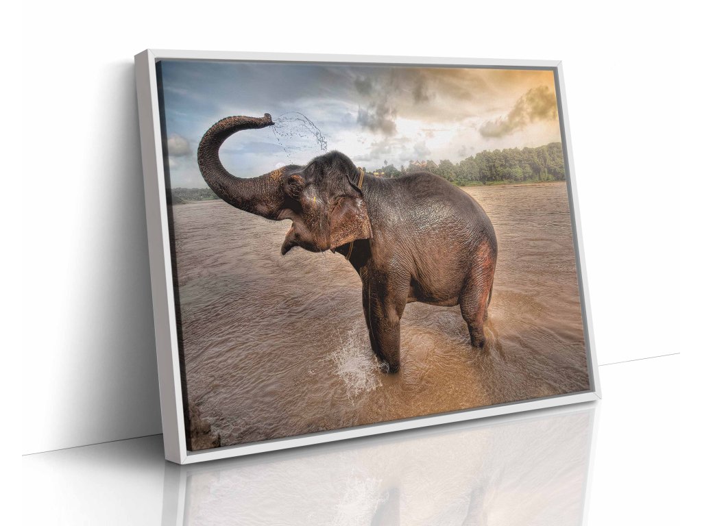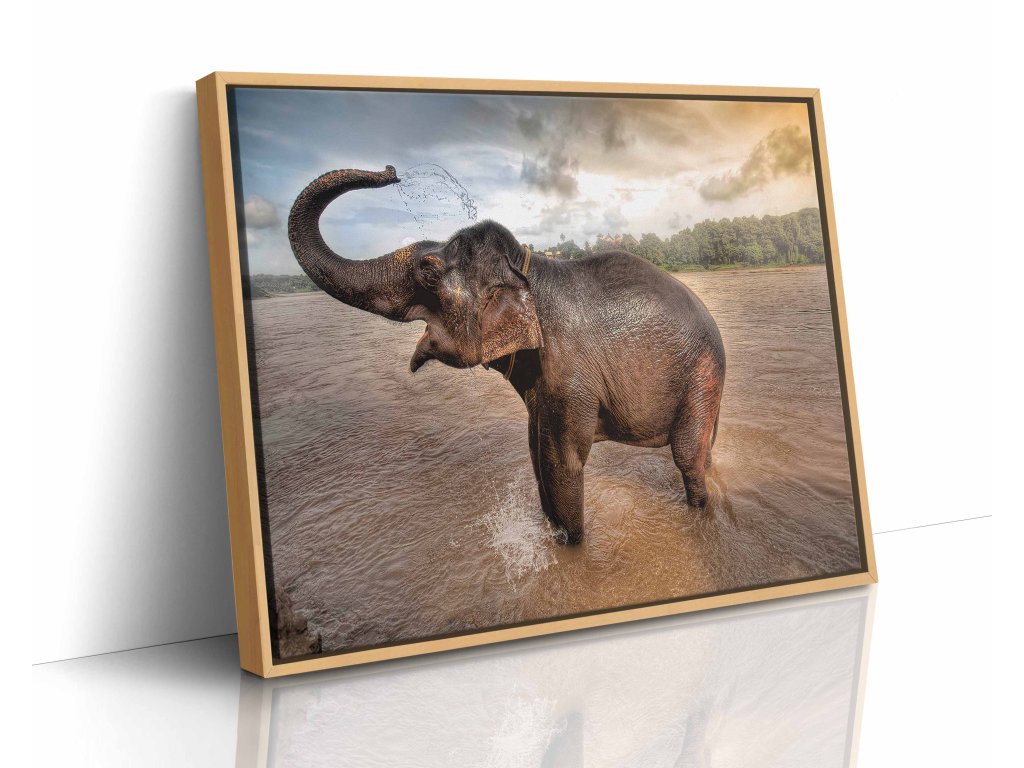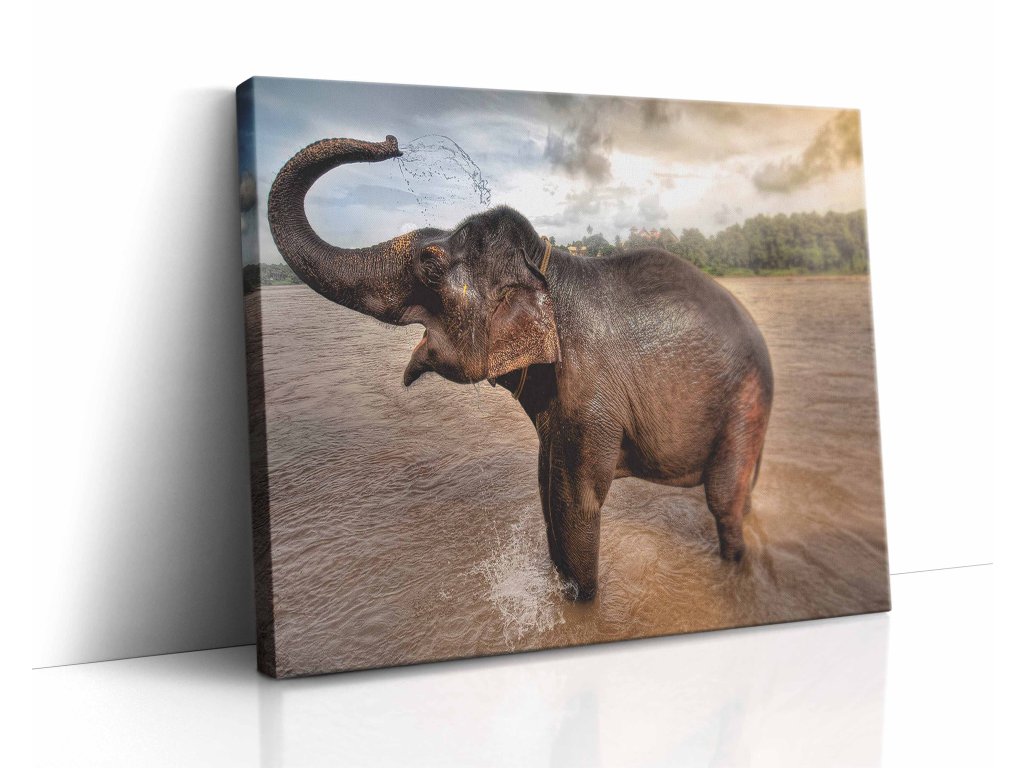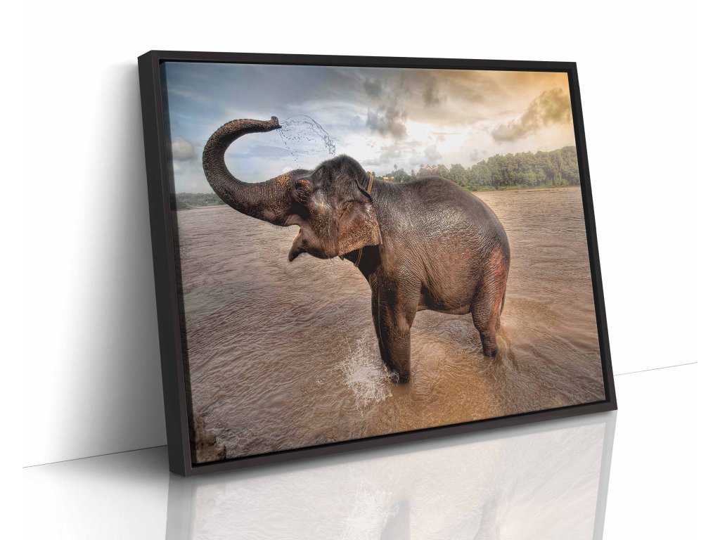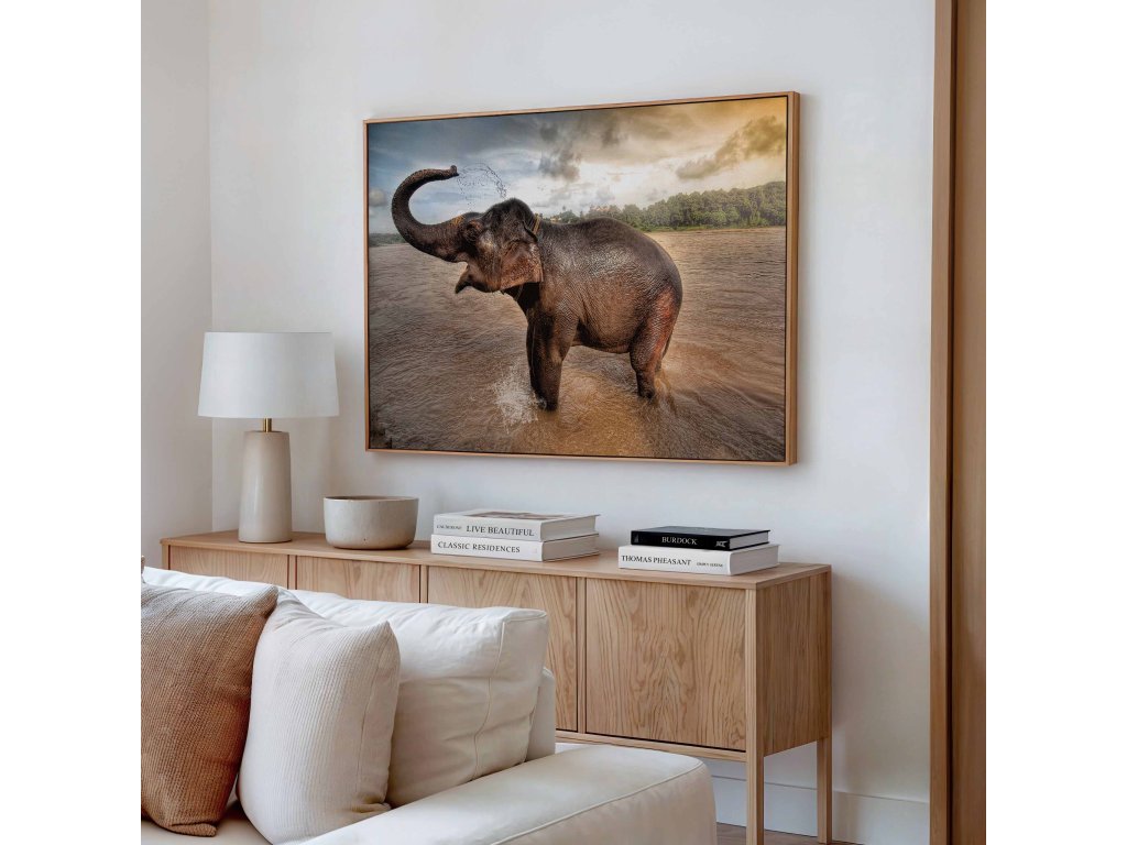 Veselý a osvěžující obraz zachycující slony při radostné koupeli. Scéna plná života ukazuje přirozenou hravost a lásku slonů k vodě. Stříkající kapky vytvářejí dynamický efekt a podtrhují radostnou atmosféru. Kontrastující textury mokré kůže, vodní hladiny a okolní vegetace tvoří bohatý vizuální zážitek. Tisk na odolné plátno zajišťuje ostré detaily a svěží barvy. Ideální pro prostory, kam chcete vnést pozitivní energii.