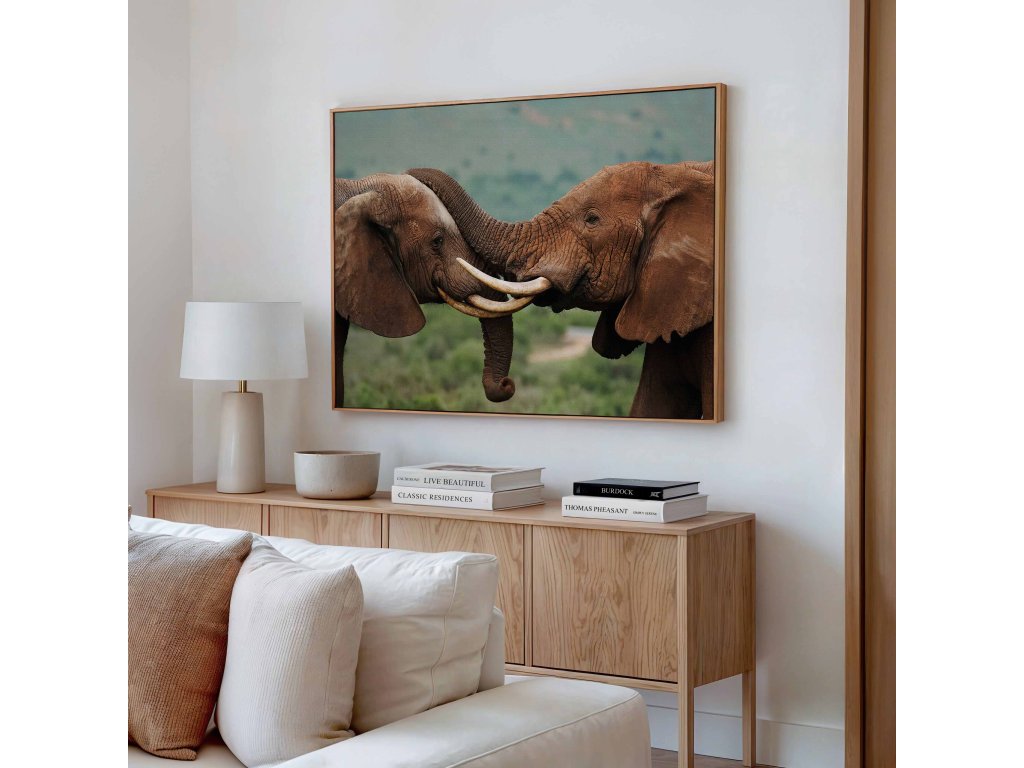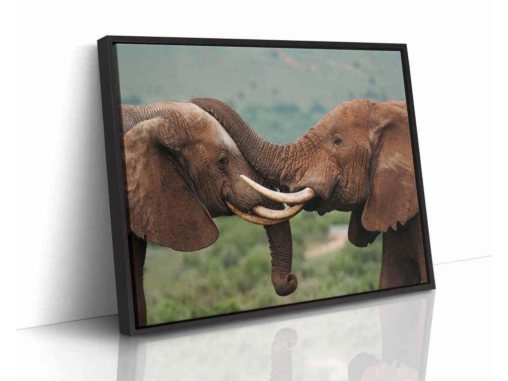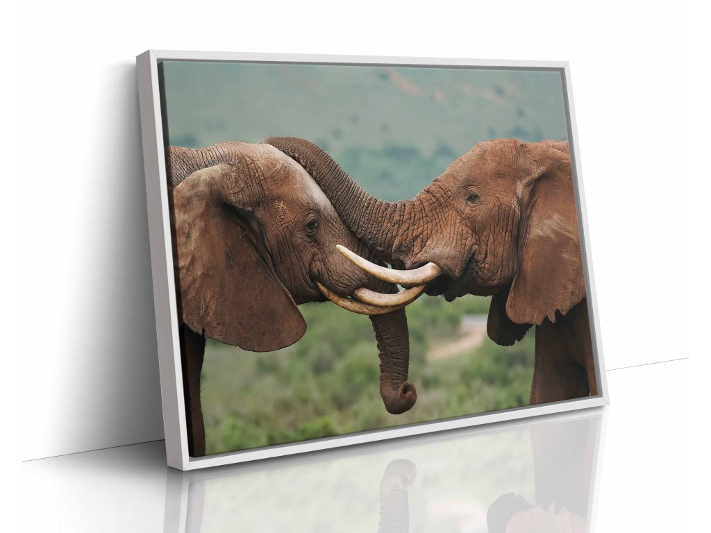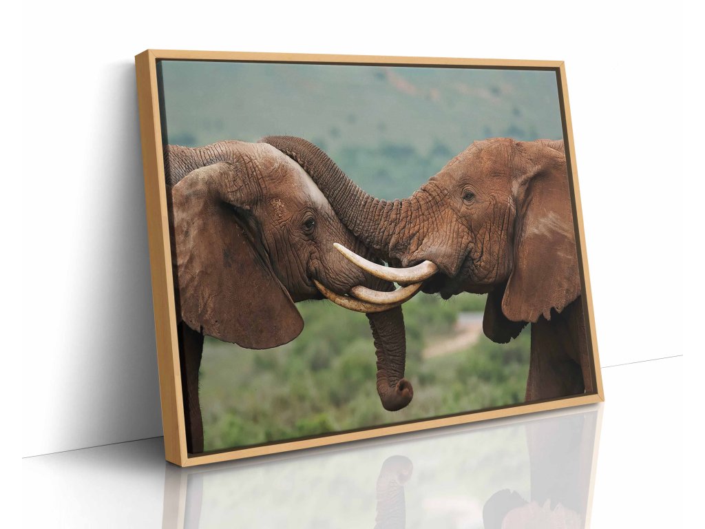 Dojemný obraz zachycující intimní okamžik mezi dvěma slony, kteří se vzájemně objímají svými choboty. Tato něžná scéna odhaluje emocionální hloubku a silné sociální vazby těchto inteligentních zvířat. Jemné nasvícení a blízký záběr podtrhují intimitu okamžiku. Tisk na prémiové plátno zajišťuje jemné barevné přechody a detailní texturu. Skvělá dekorace pro romantiky a milovníky zvířat.