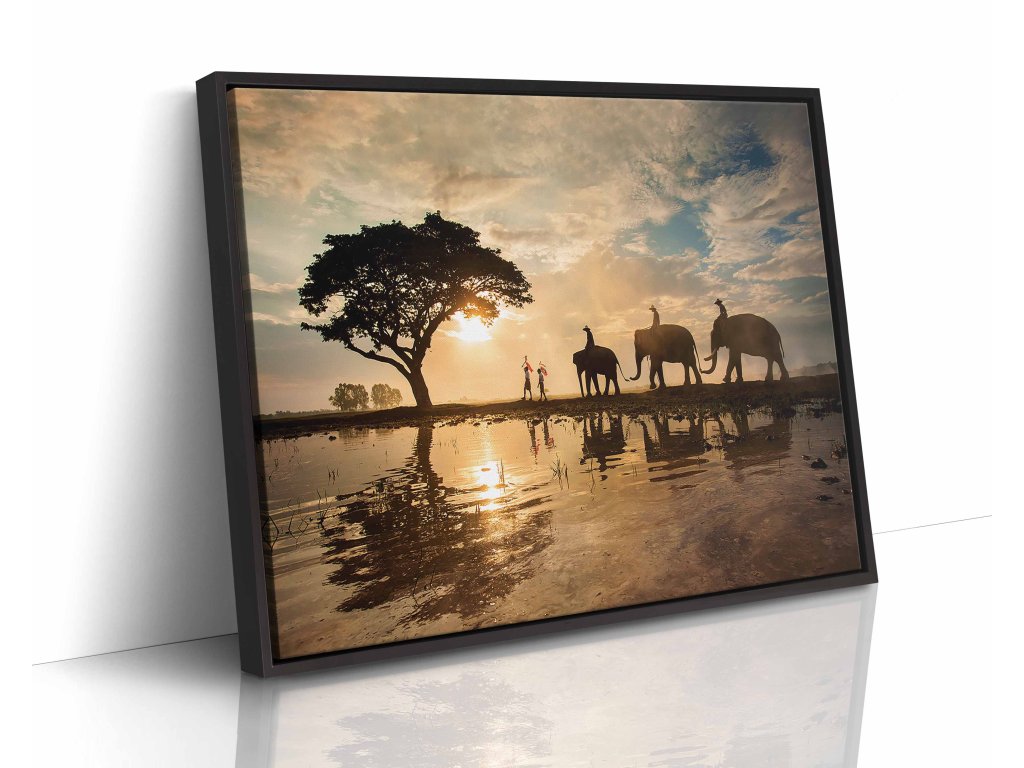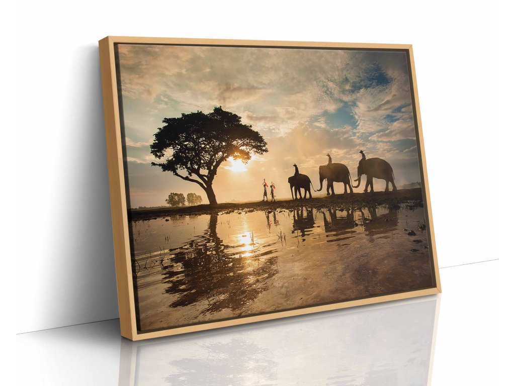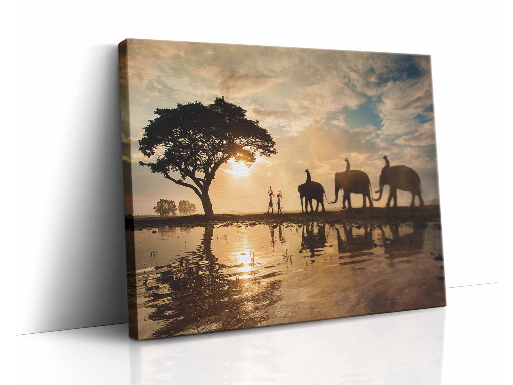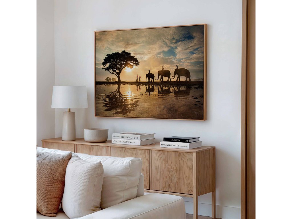 Fascinující pohled na sloní rodinu kráčející v zástupu africkou savanou. Obraz zachycuje přirozené sociální chování, kdy mladší jedinci následují ty zkušenější. Postupné zmenšování postav vytváří dojem hloubky a rytmu. Teplé barvy zapadajícího slunce dokreslují atmosféru klidného putování. Tisk na prémiové plátno zaručuje ostrost detailů a věrnost barev.
