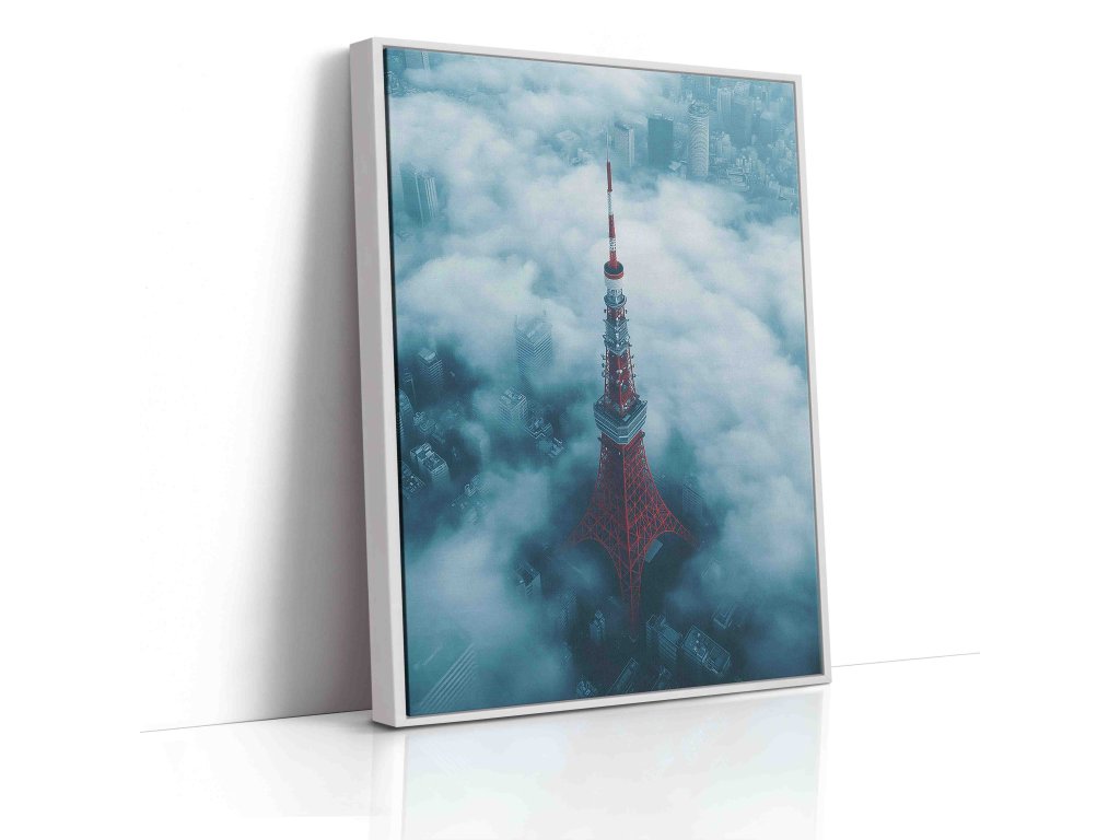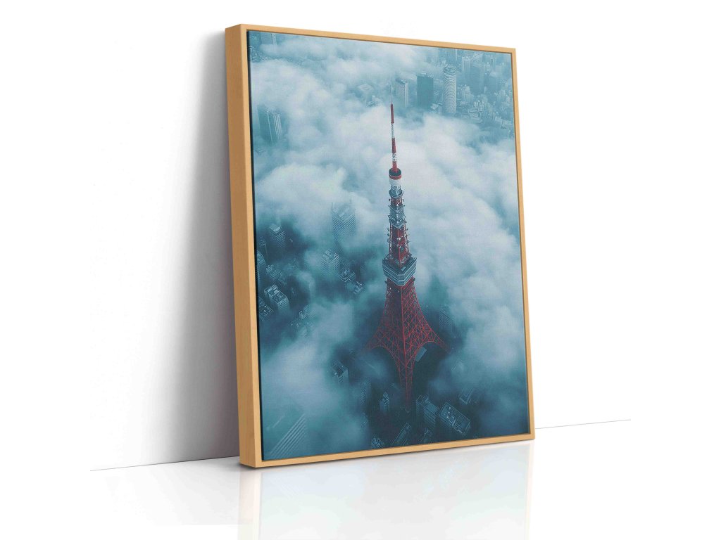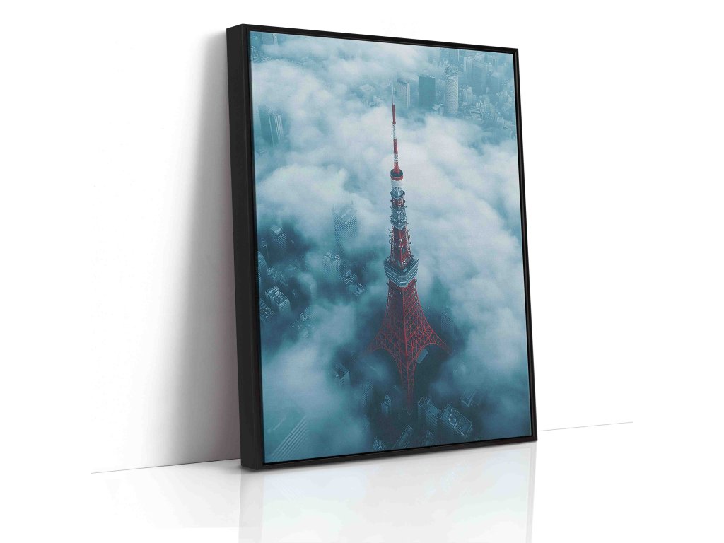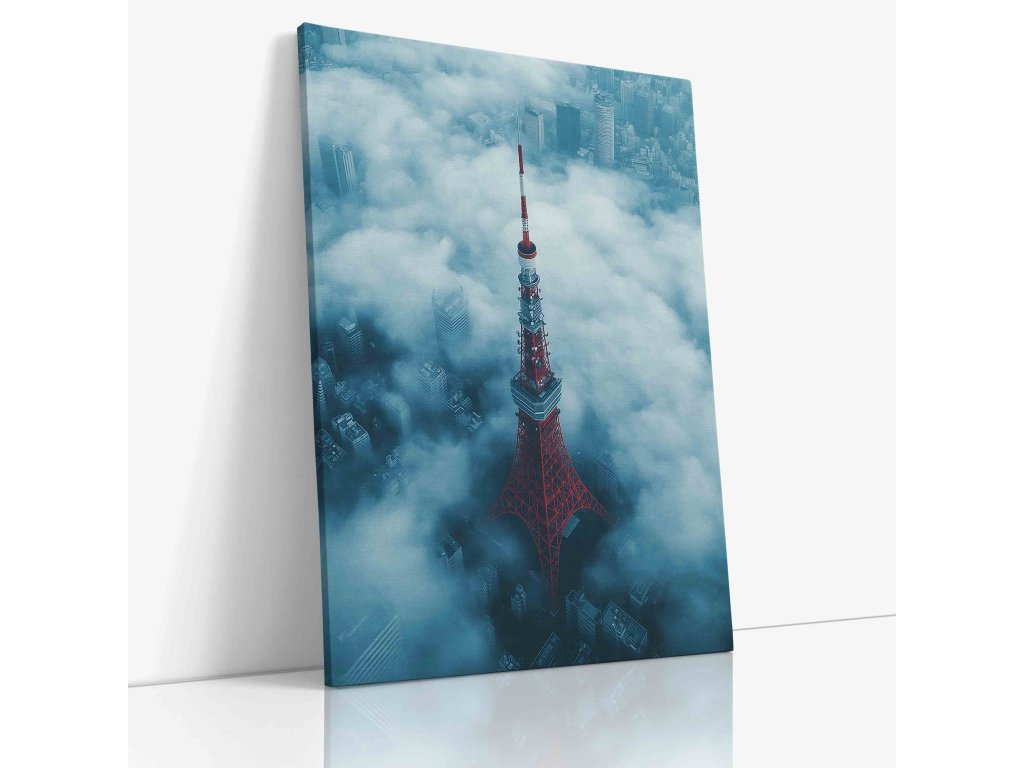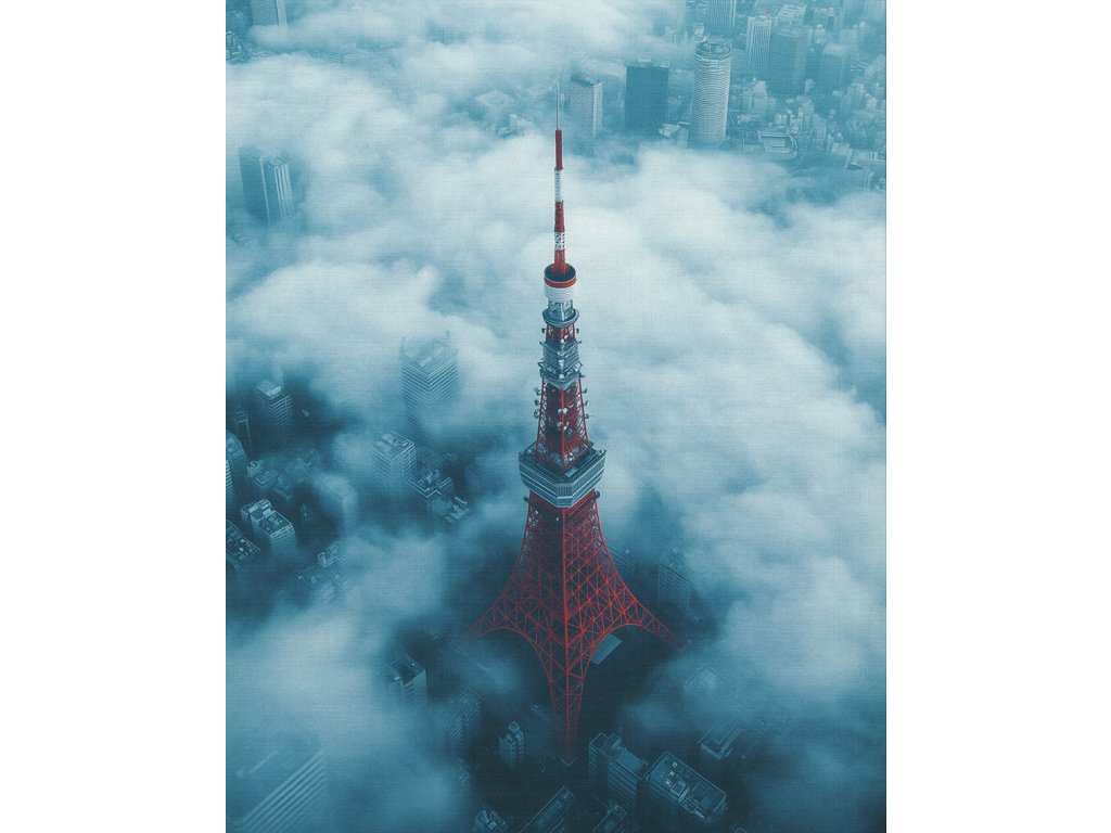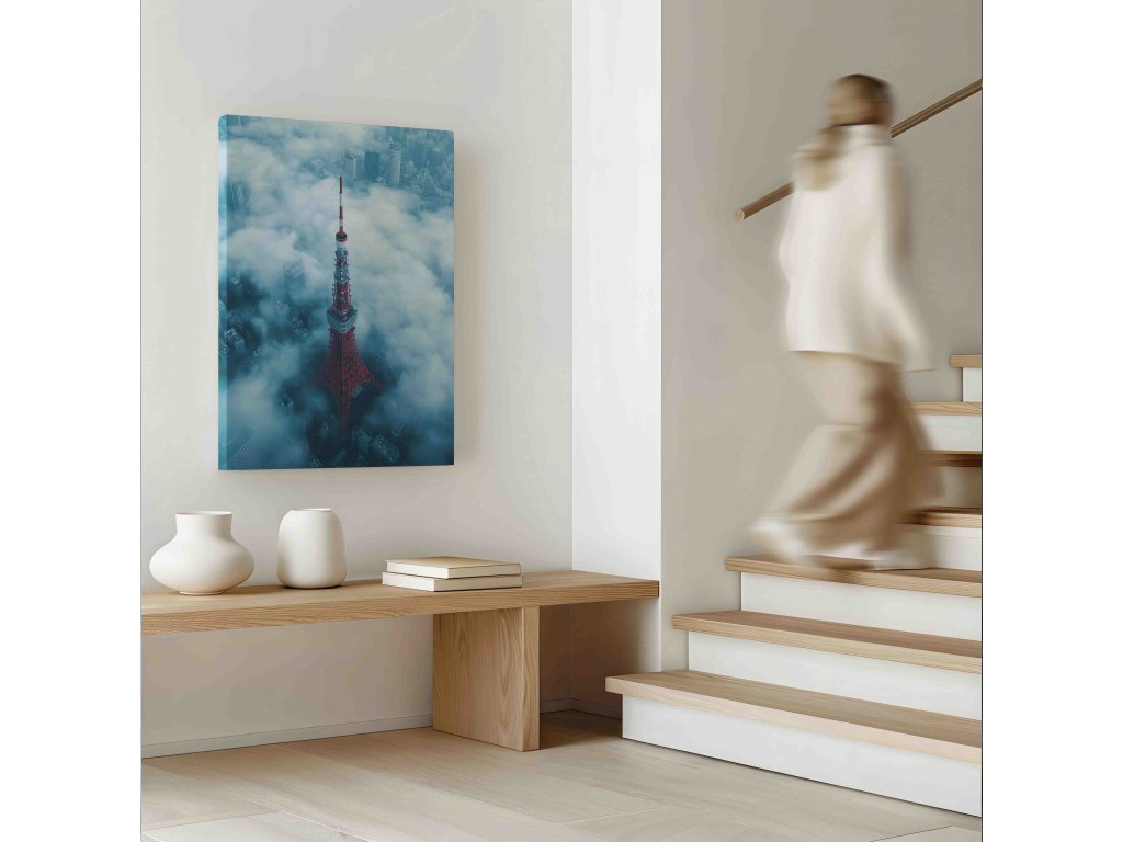 Netradiční a klidný pohled na Tokyo Tower, která se majestátně tyčí z jemného ranního oparu. Červená barva věže probleskuje skrze šedavou mlhu, což vytváří atmosféru klidu a japonského zenového klidu. Obraz nabízí zajímavý kontrast mezi ocelovou konstrukcí a měkkostí mlžného rána. Skvěle se hodí do interiérů, kde hraje prim relaxace a jemné barevné tóny.