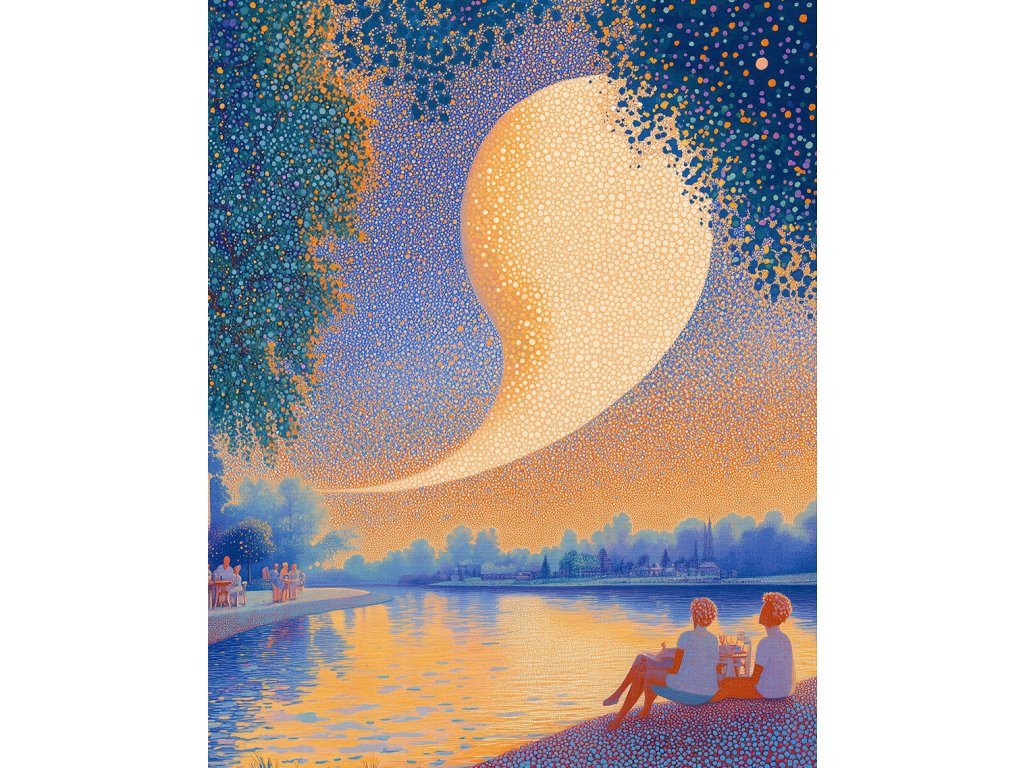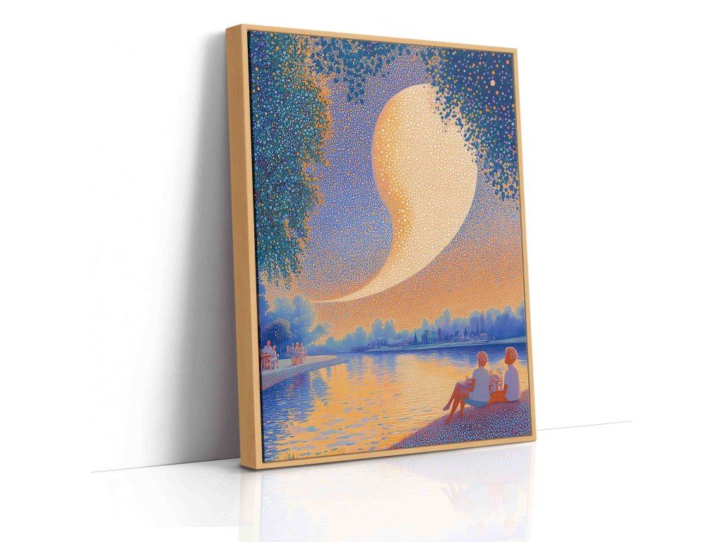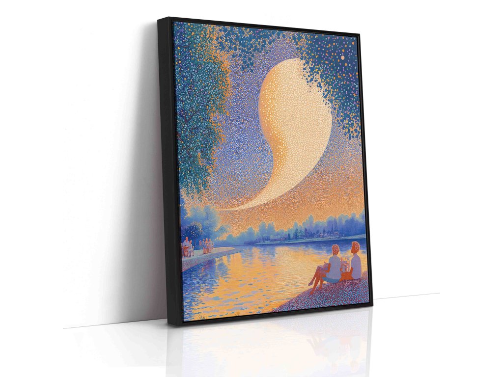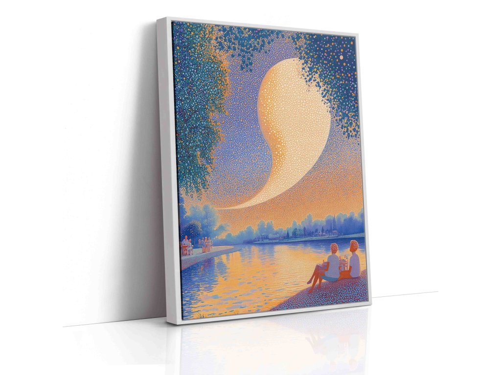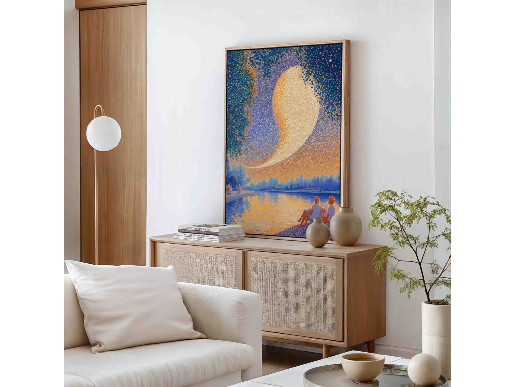 Atmosférický pointilistický obraz zachycující poklidný večer u vodní přehrady. Tisíce drobných barevných teček vytvářejí podmanivou hru světla a stínů, kdy poslední sluneční paprsky barví krajinu do teplých odstínů. Technika pointilismu zde mistrně vystihuje přechod dne v noc. Tento obraz na kvalitním plátně přinese do vašeho interiéru klid a harmonii.
