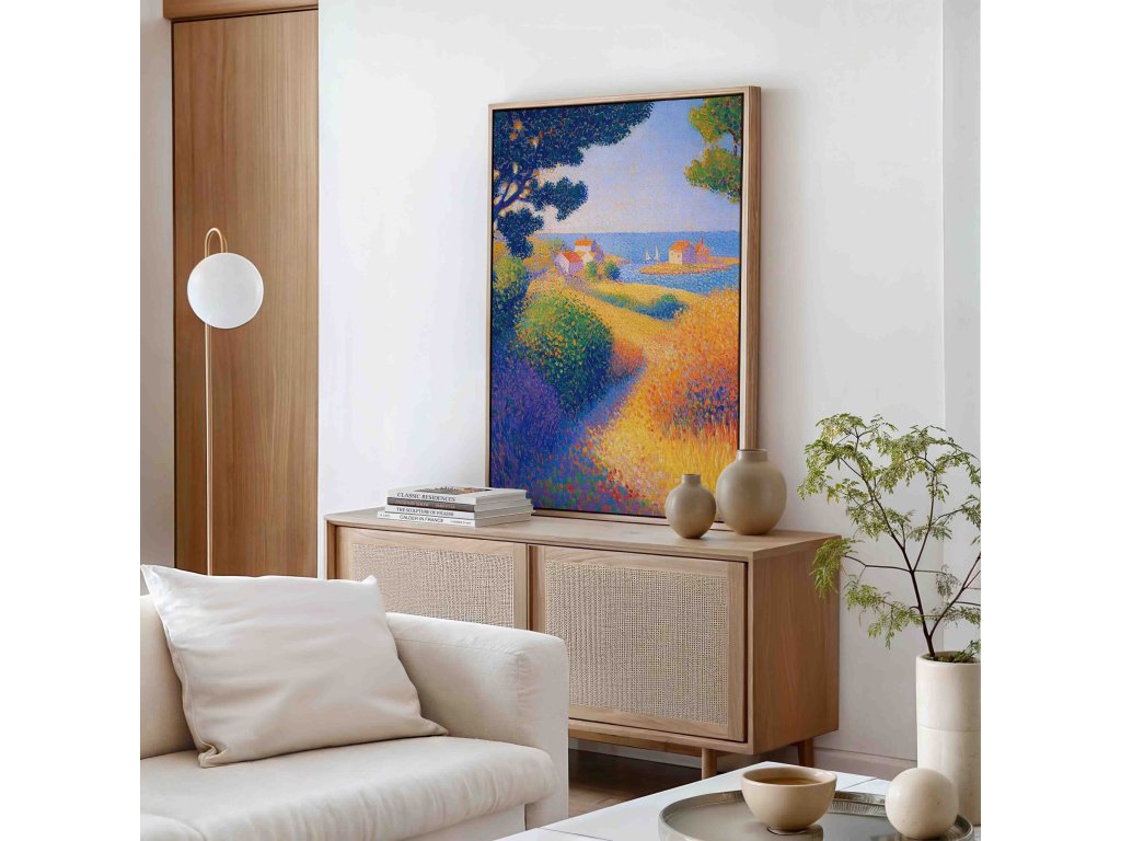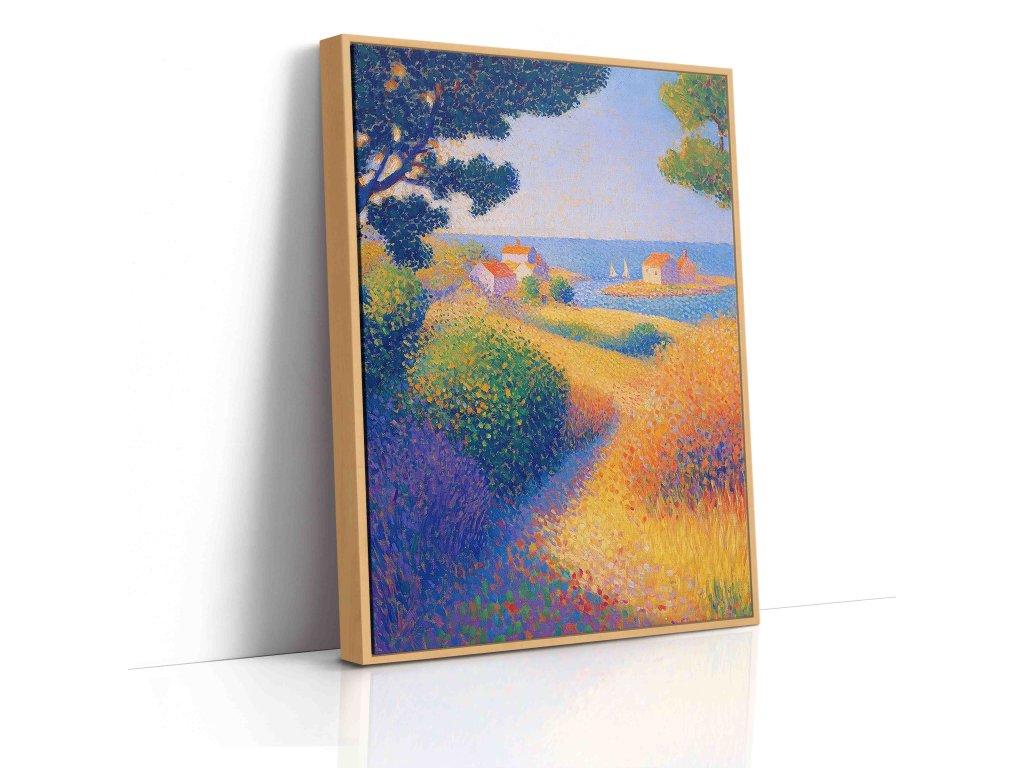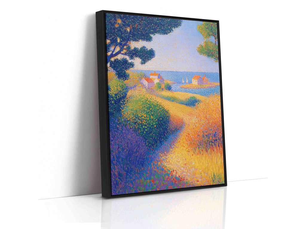Okouzlující pointilistický obraz zachycující malebnou vesničku na pobřeží s plachetnicí v popředí. Tisíce drobných teček vytvářejí živou atmosféru přímořského života, kde modré tóny moře kontrastují s bílými domky. Technika pointilismu dokonale vystihuje třpyt moře a eleganci plachetnice. Tento obraz na kvalitním plátně přinese do vašeho interiéru středomořskou atmosféru.