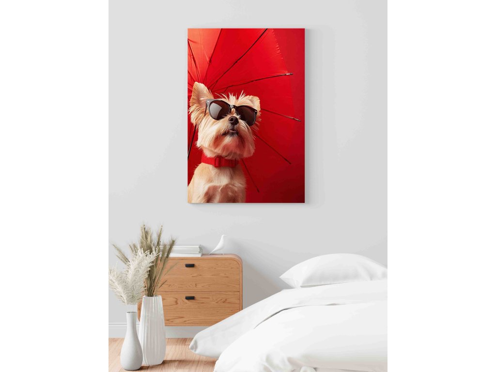 Připravte se na deštivé dny s úsměvem. Tento kouzelný obraz na plátně zobrazuje yorkshira s deštníkem v antropomorfním stylu. Scenérie působí velmi něžně a vtipně zároveň, jako vystřižená z dětské knížky nebo animovaného filmu. Je to perfektní dekorace pro ty, kteří mají rádi příběhy a chtějí do svého domova vnést trochu hravé fantazie. Kvalitní tisk na plátno podtrhuje barvy i texturu deštníku.